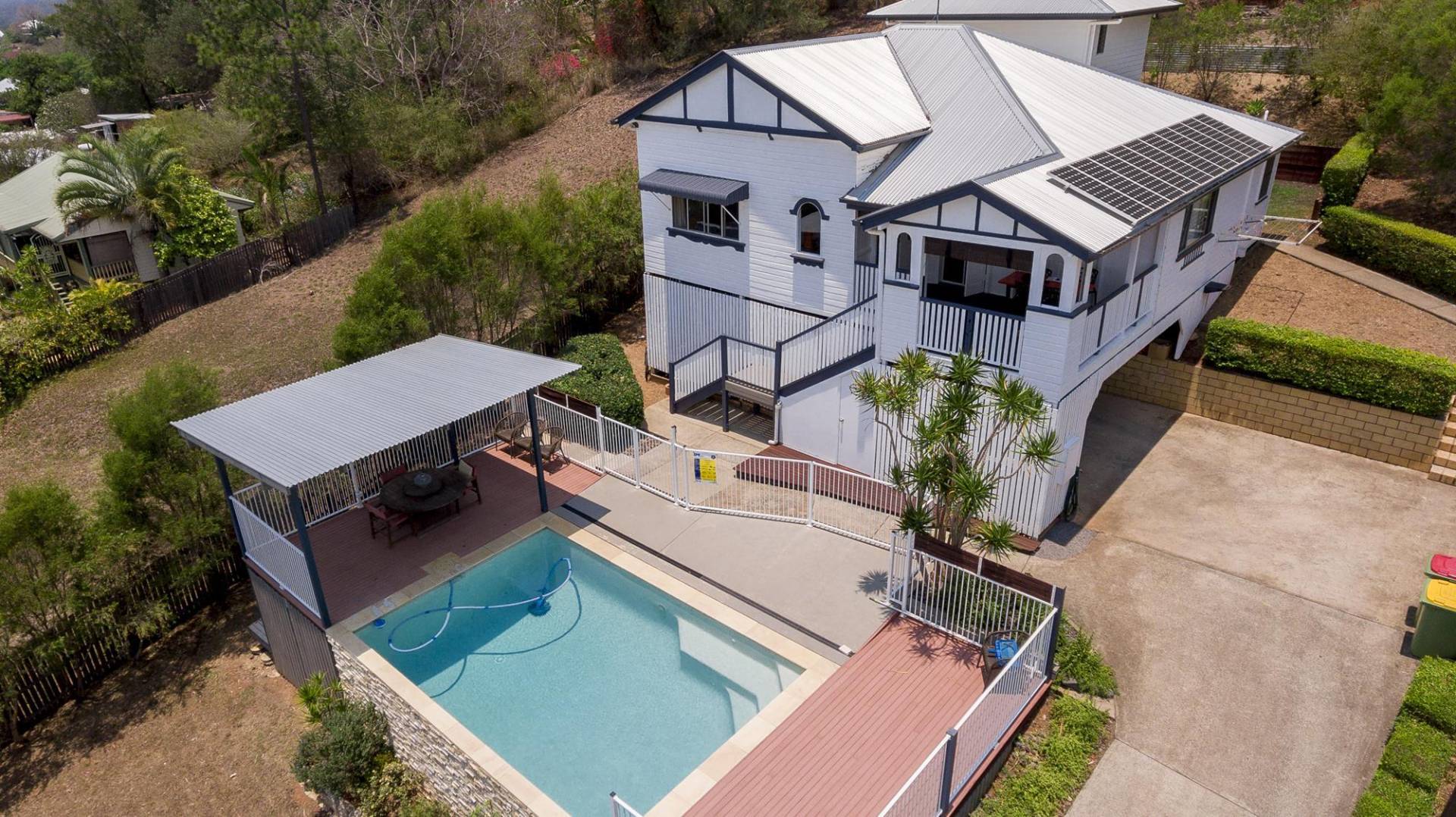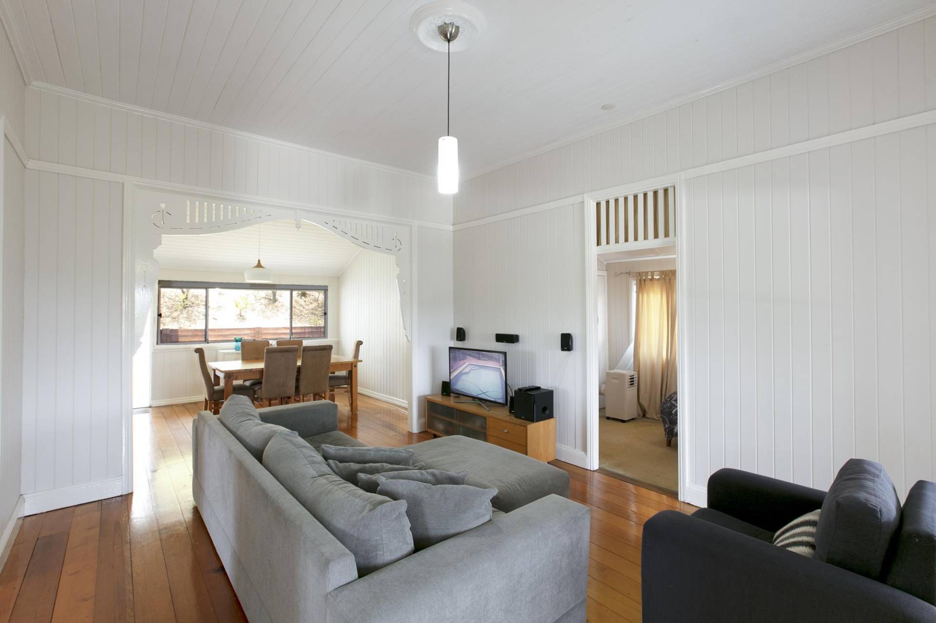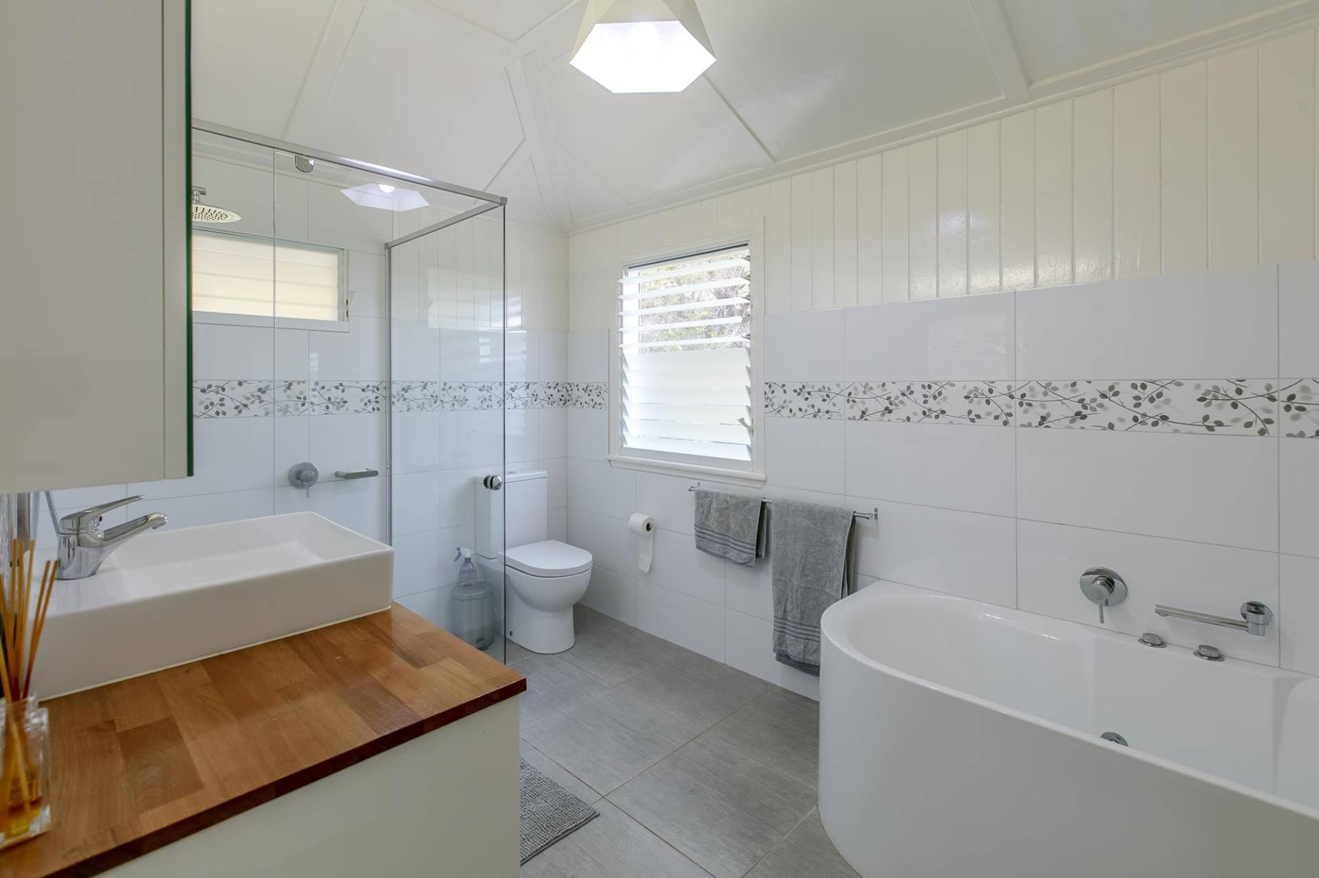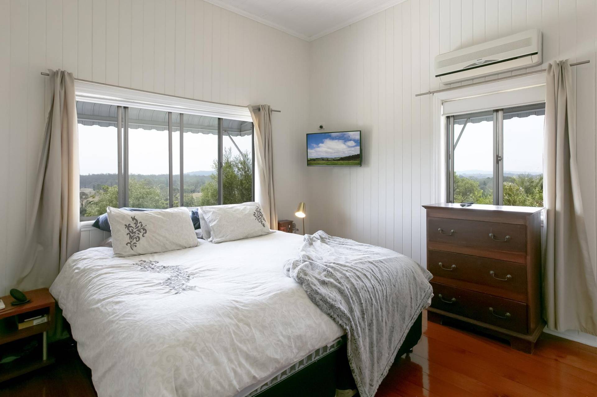 The front stairs at the house lead to a wide front veranda with an awesome northerly view over the pool, the village and beyond. Inside, it’s an immaculately presented Queenslander with all the usual features: high ceilings, timber walls & ceilings, period trims and polished timber floors. There are also modern touches like air conditioning!
