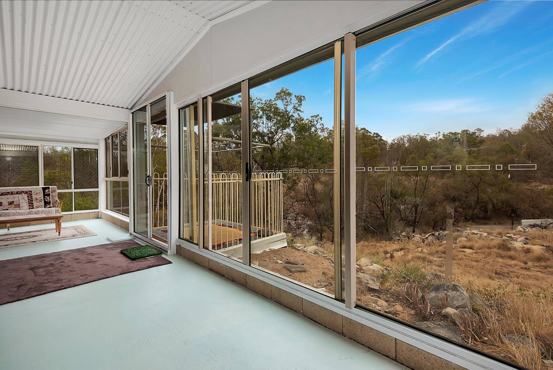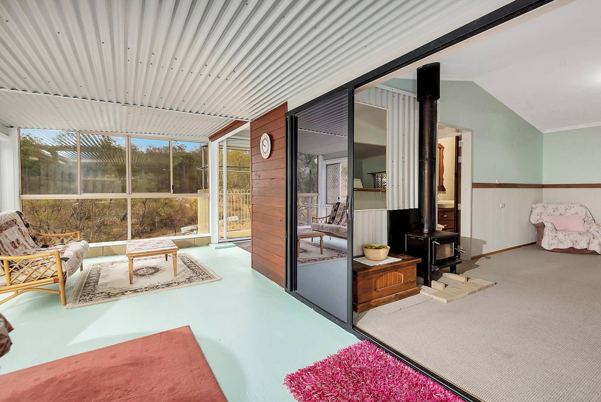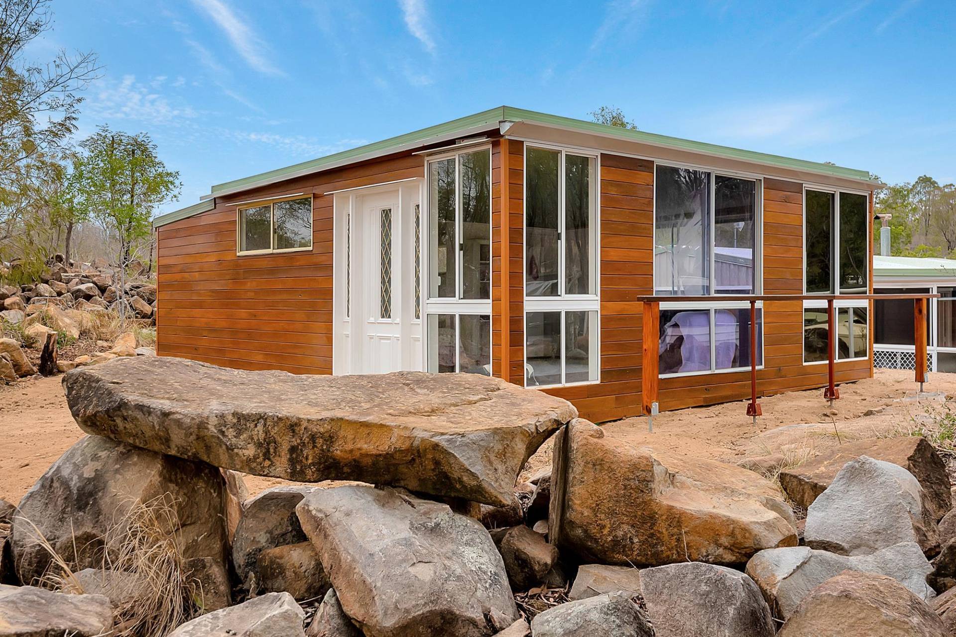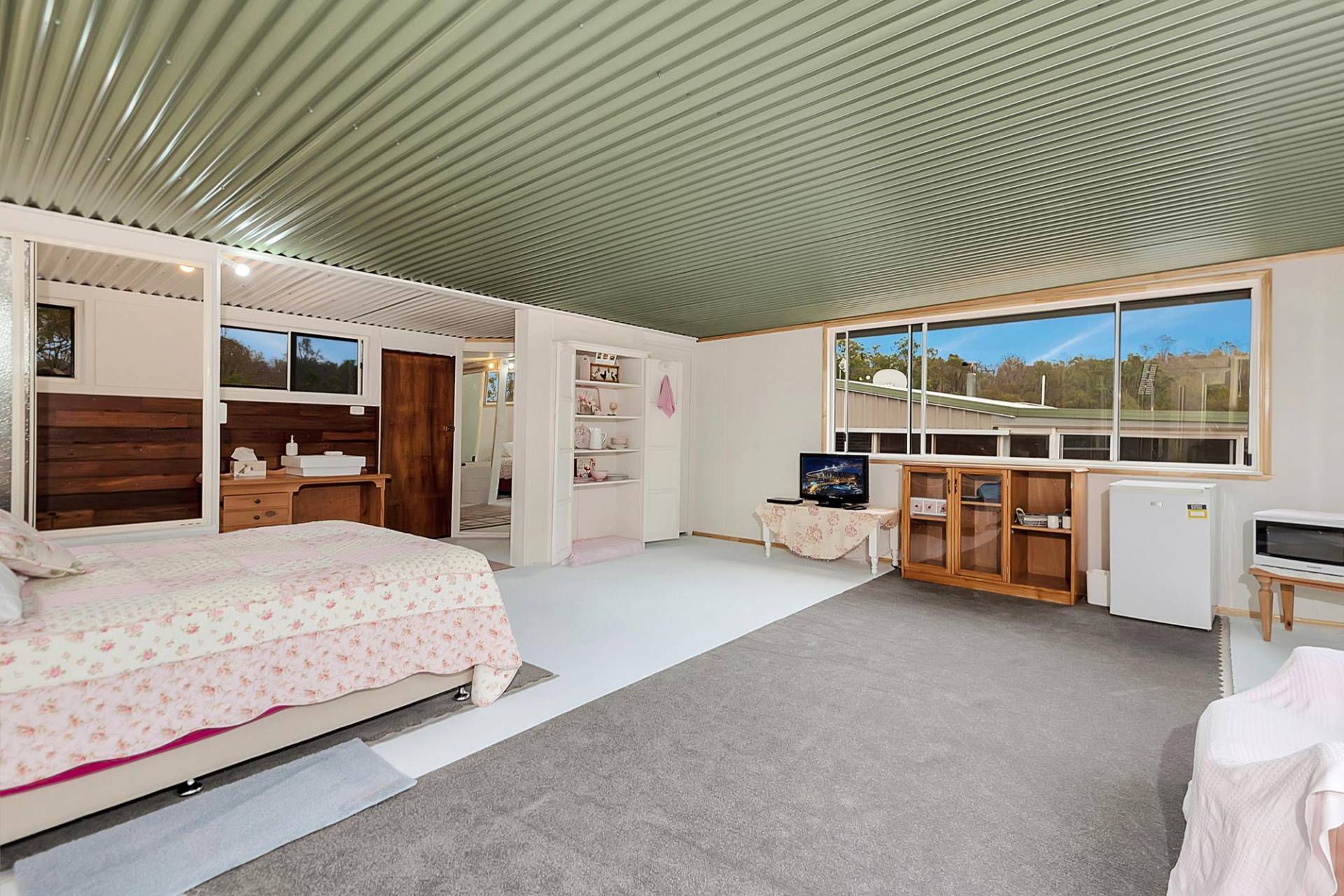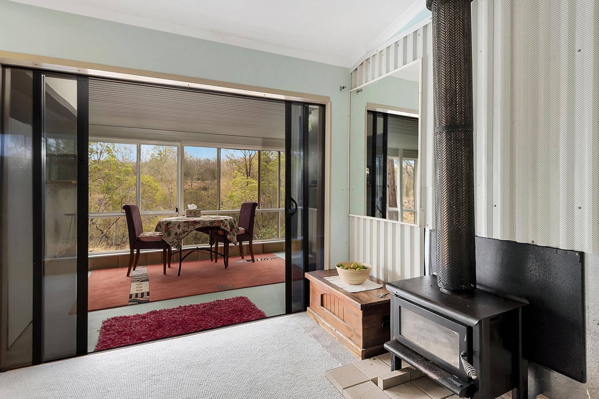 The house is an open plan cottage, steel construction on a slab floor. It is fully enclosed in a sunroom, right around. In fact, that’s the main living area. You can open or close any side to control the weather. Inside the living area has elevated ceilings, the lounge has slow combustion heating & air conditioning, and the kitchen, while simple, is functional & has a gas cooking. There are 2 bedrooms and 1 bathroom.