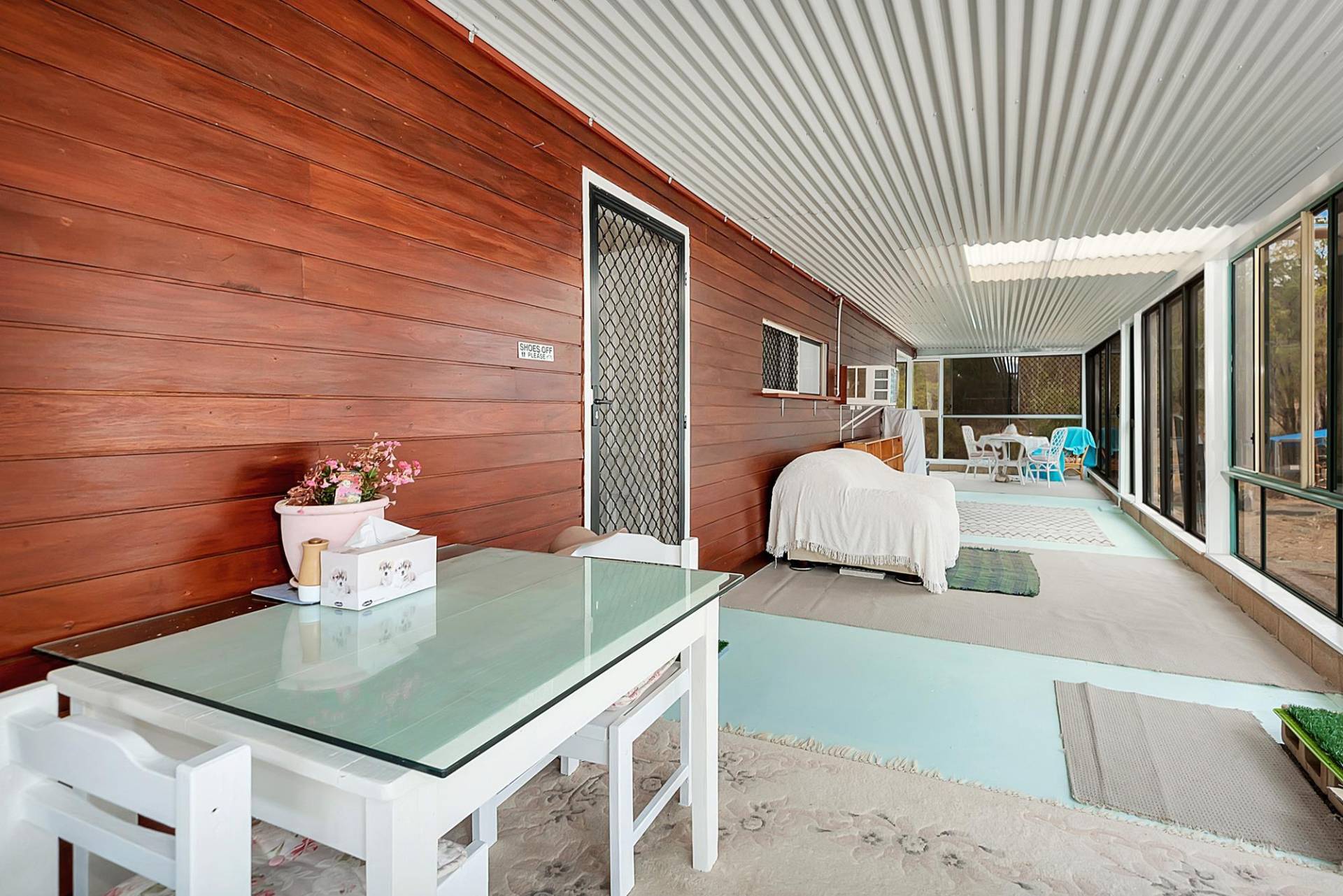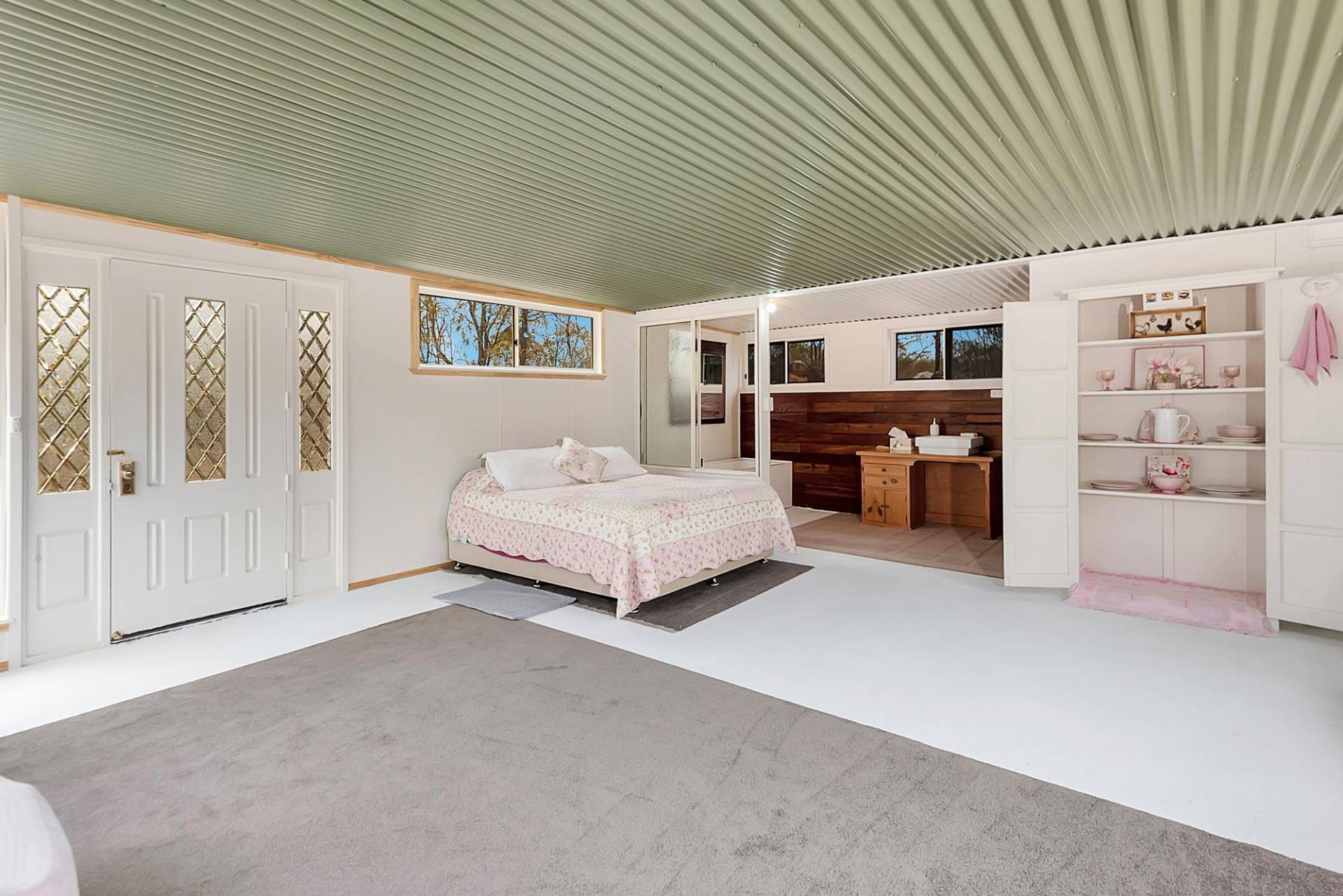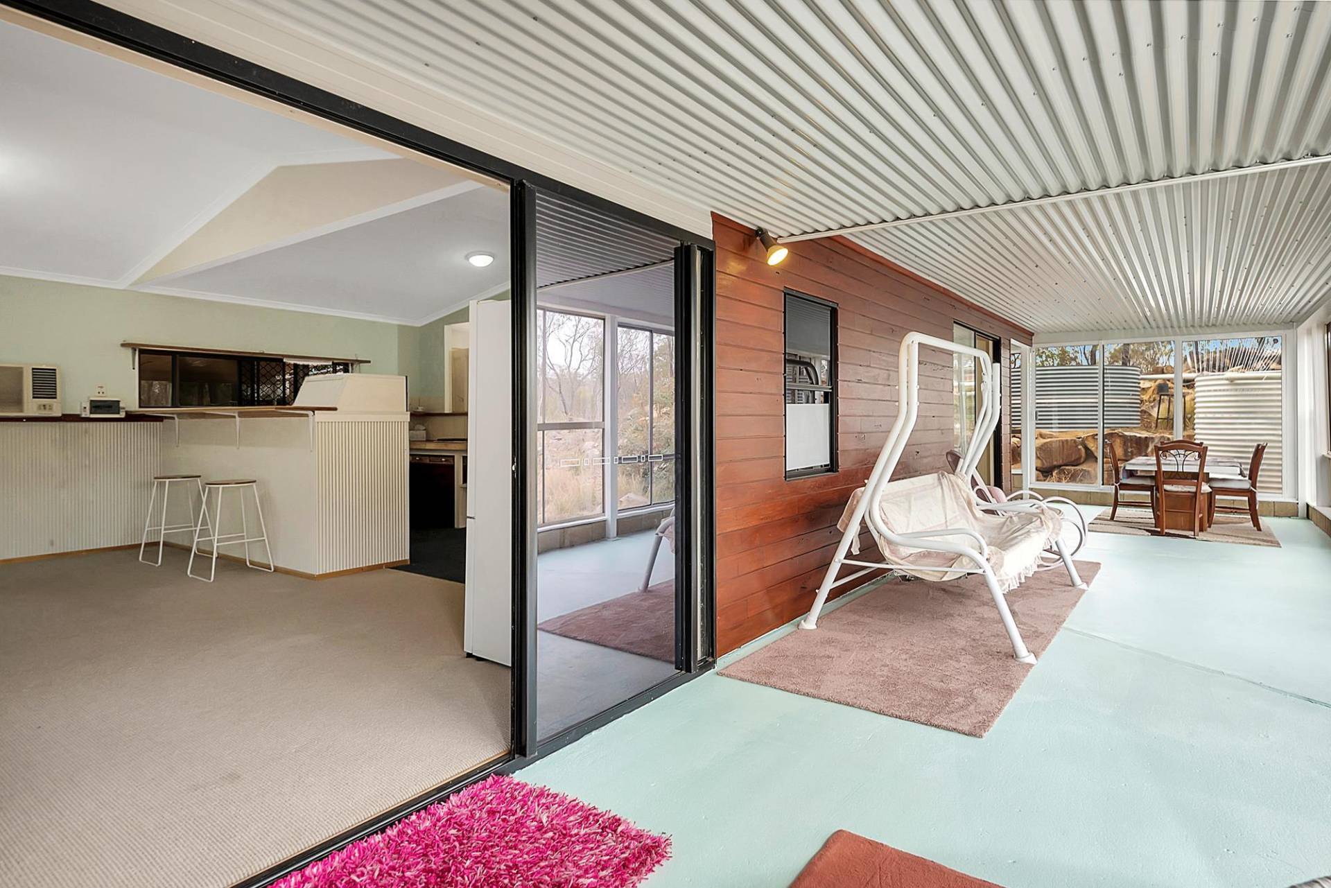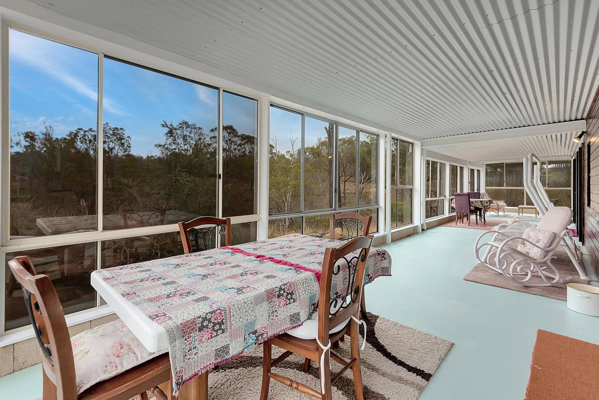 The house is an open plan cottage, steel construction on a slab floor. It is fully enclosed in a sunroom, right around. In fact, that’s the main living area. You can open or close any side to control the weather. Inside the living area has elevated ceilings, the lounge has slow combustion heating & air conditioning, and the kitchen, while simple, is functional & has a gas cooking. There are 2 bedrooms and 1 bathroom.