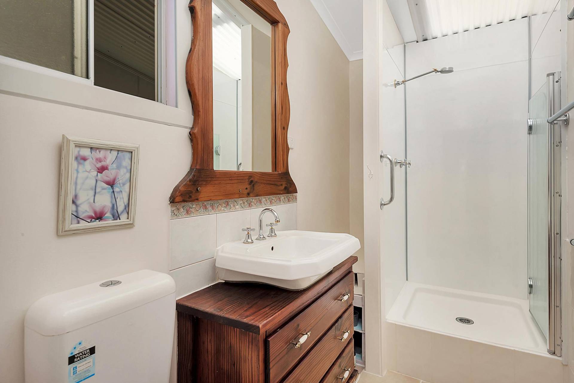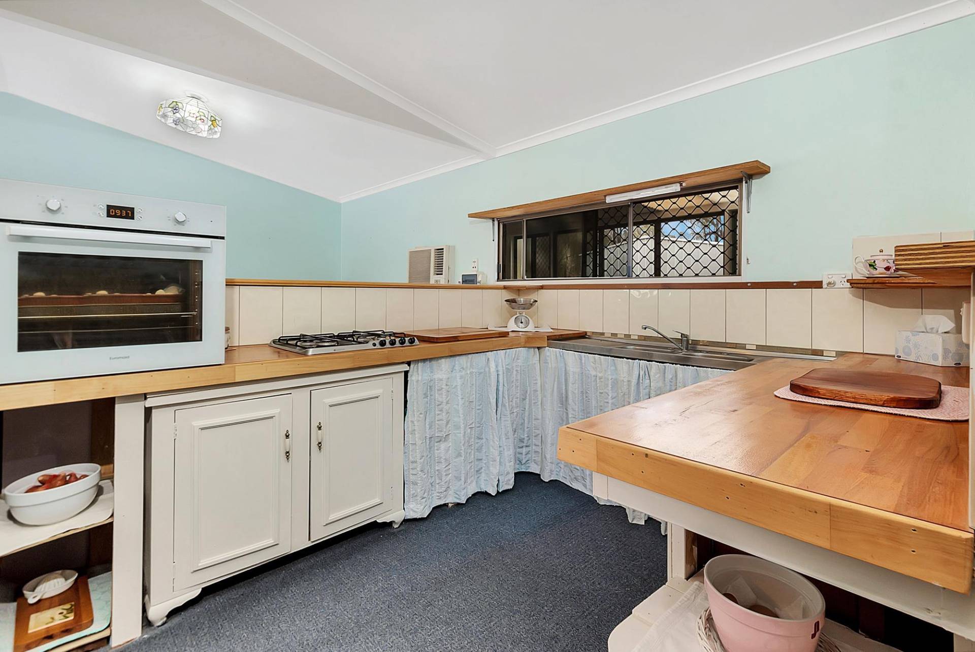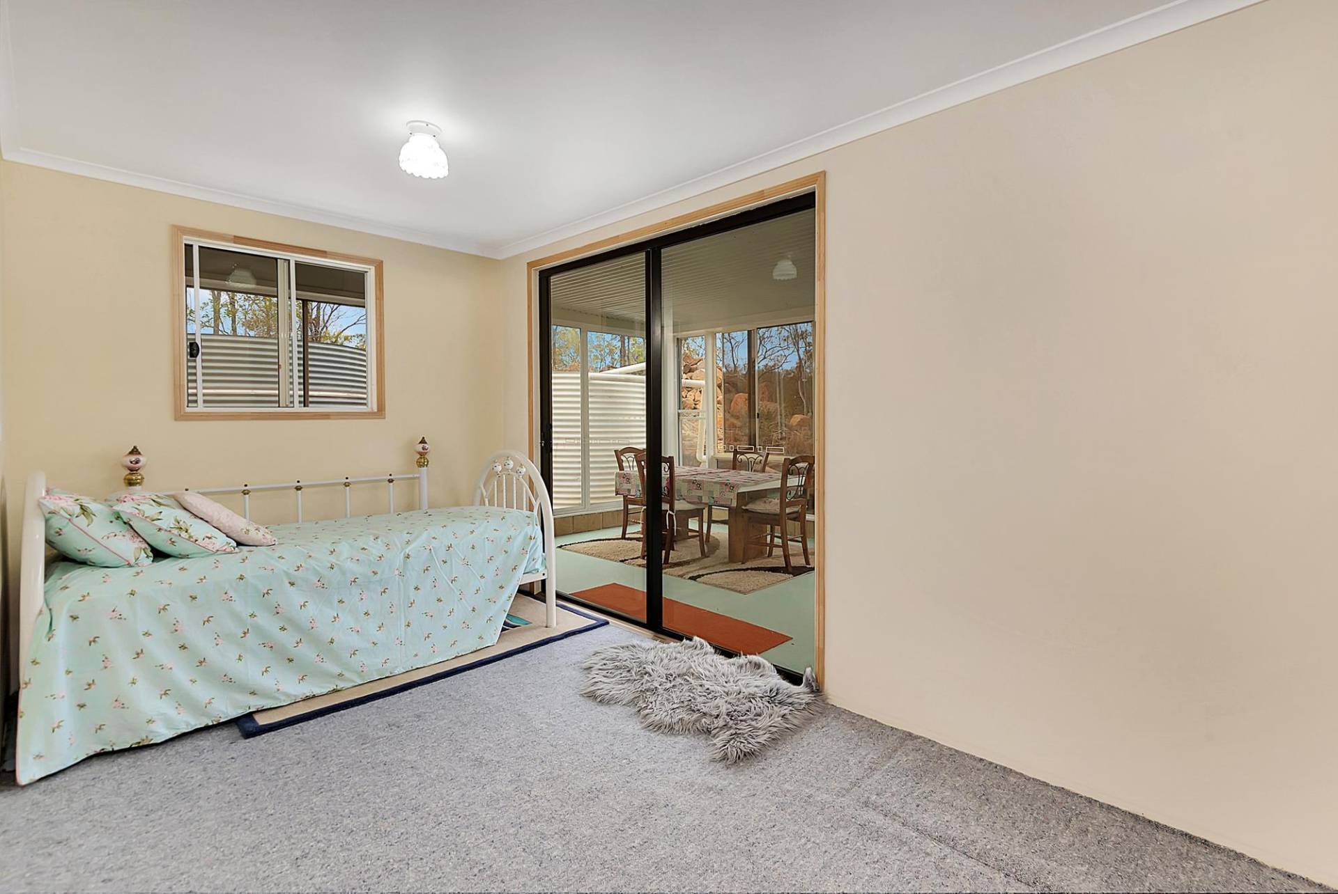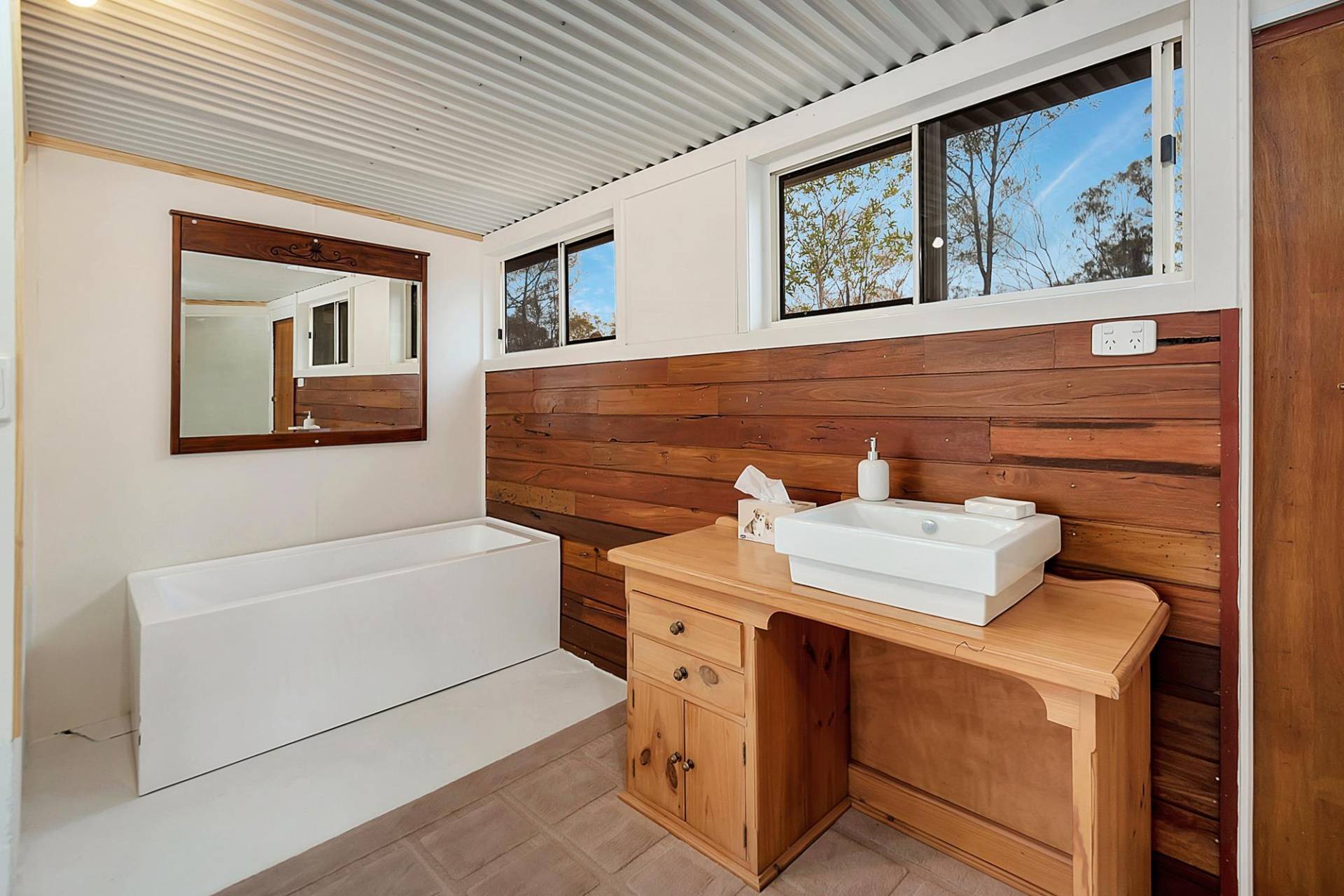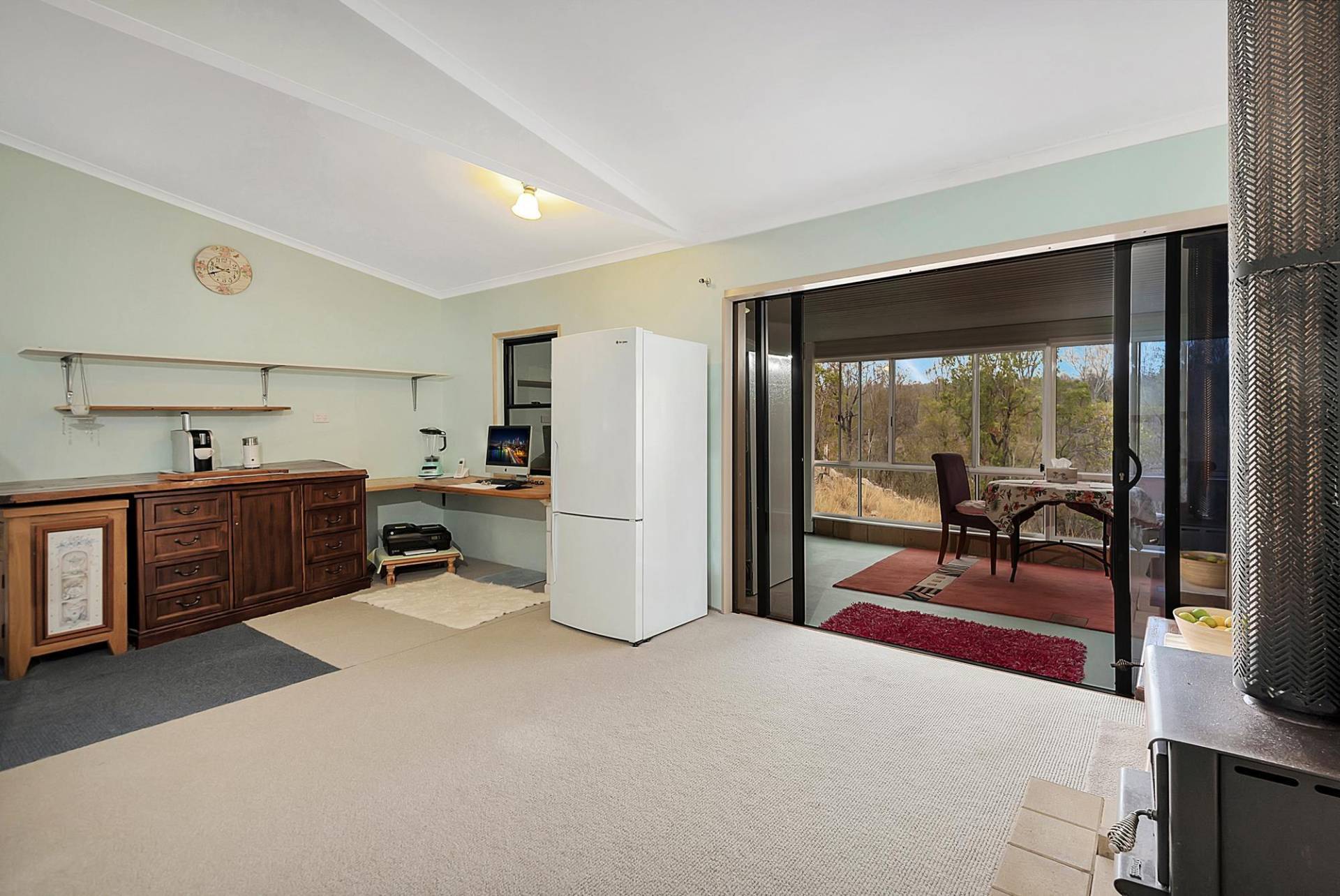 The house is an open plan cottage, steel construction on a slab floor. It is fully enclosed in a sunroom, right around. In fact, that’s the main living area. You can open or close any side to control the weather. Inside the living area has elevated ceilings, the lounge has slow combustion heating & air conditioning, and the kitchen, while simple, is functional & has a gas cooking. There are 2 bedrooms and 1 bathroom.