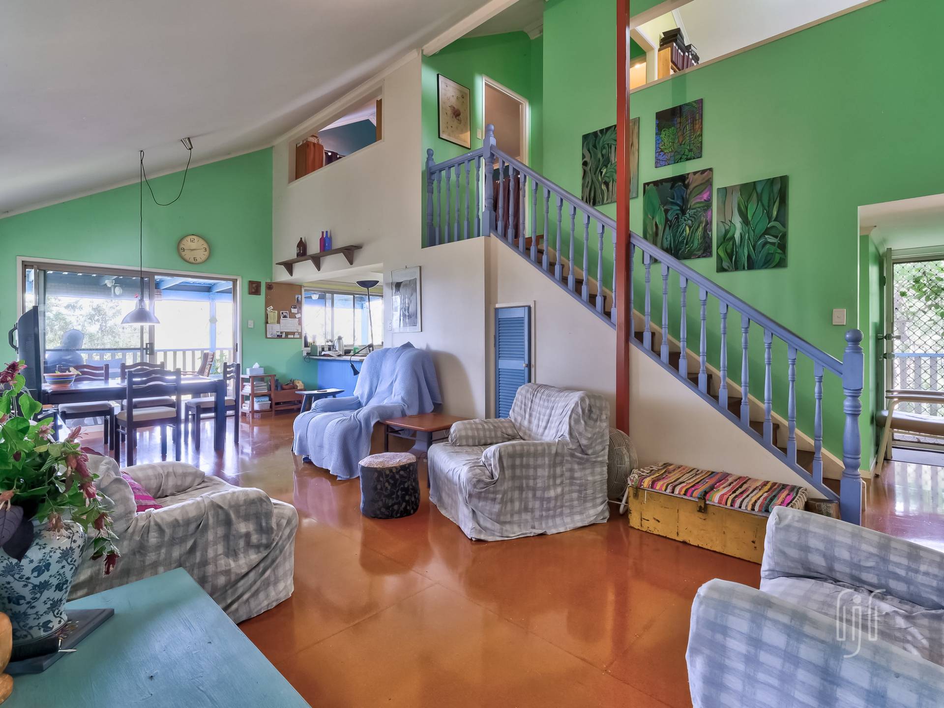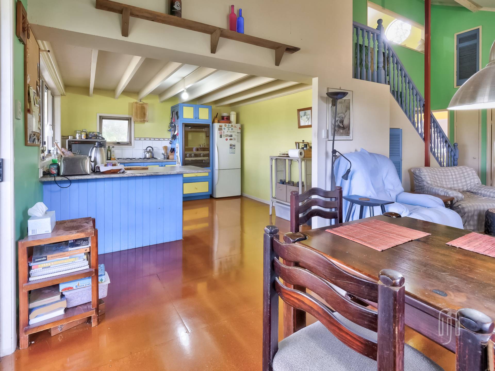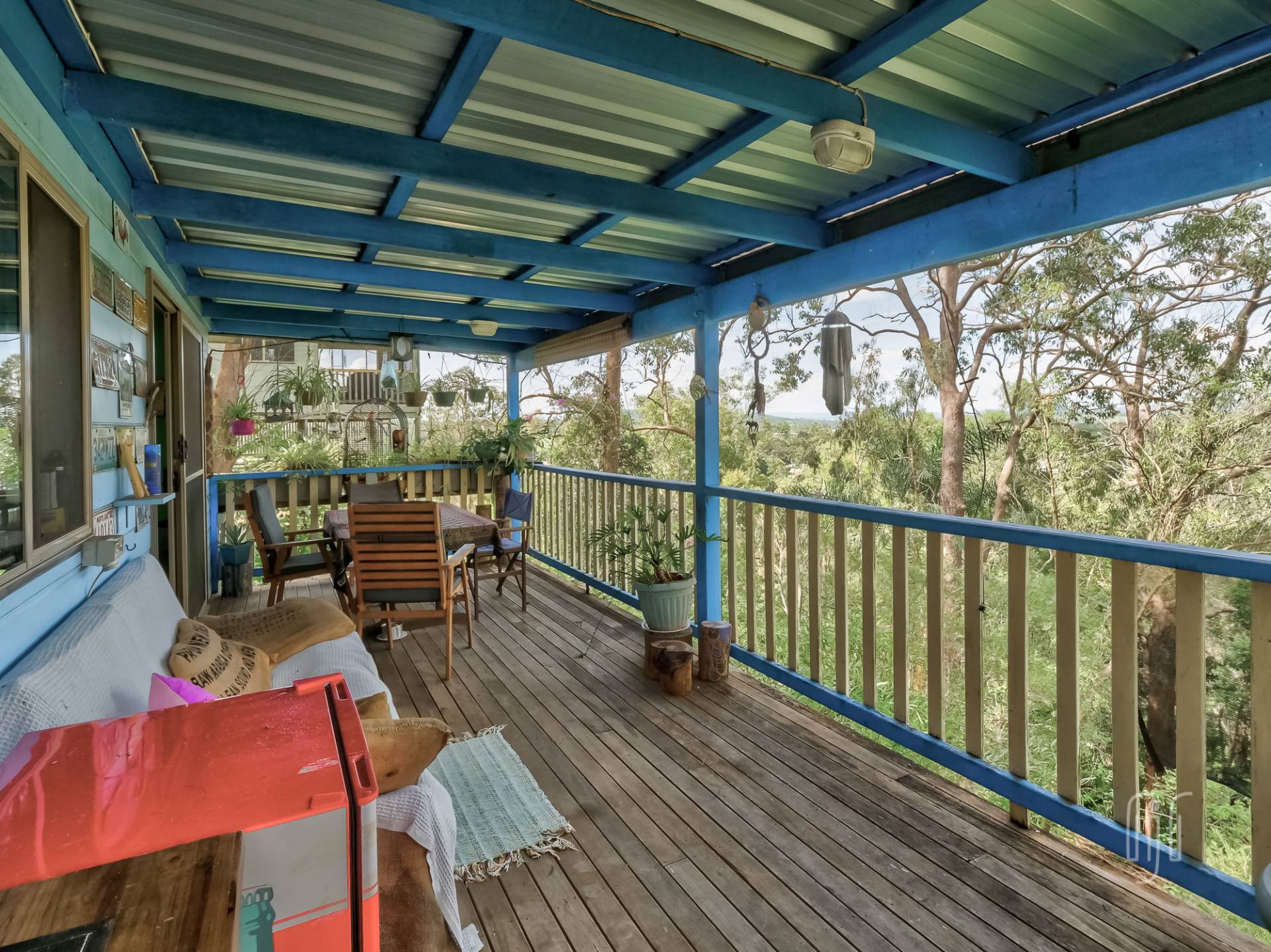 All the living area of this double storey home is on the lower level, L-shaped, semi open plan. The living room has cathedral ceilings while the kitchen has a gas cooktop and plenty of space. It all flows to the main relaxation & entertainment space, the rear deck. Now you are in the tree tops!