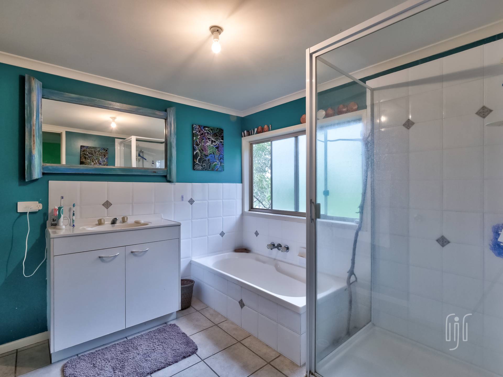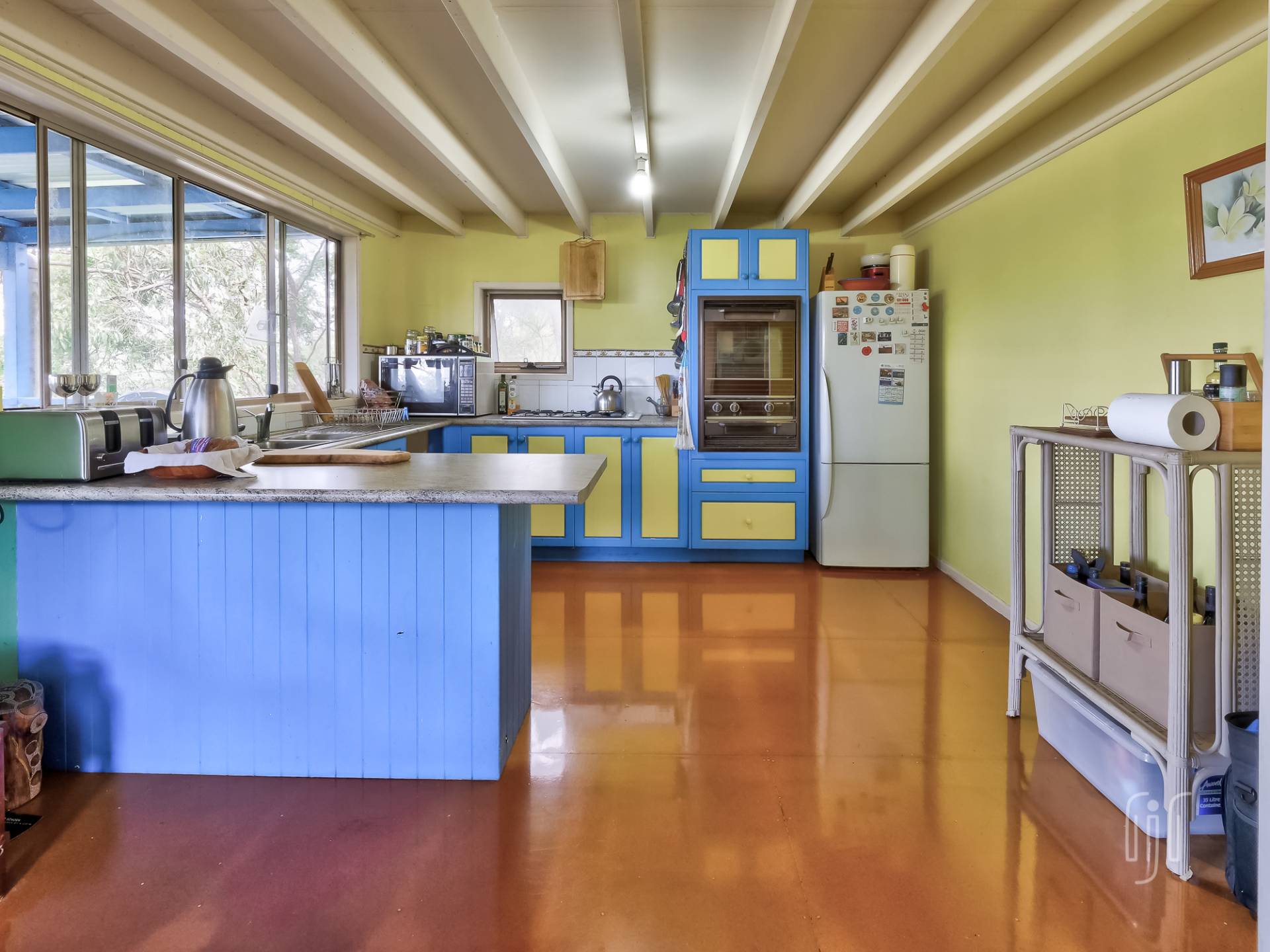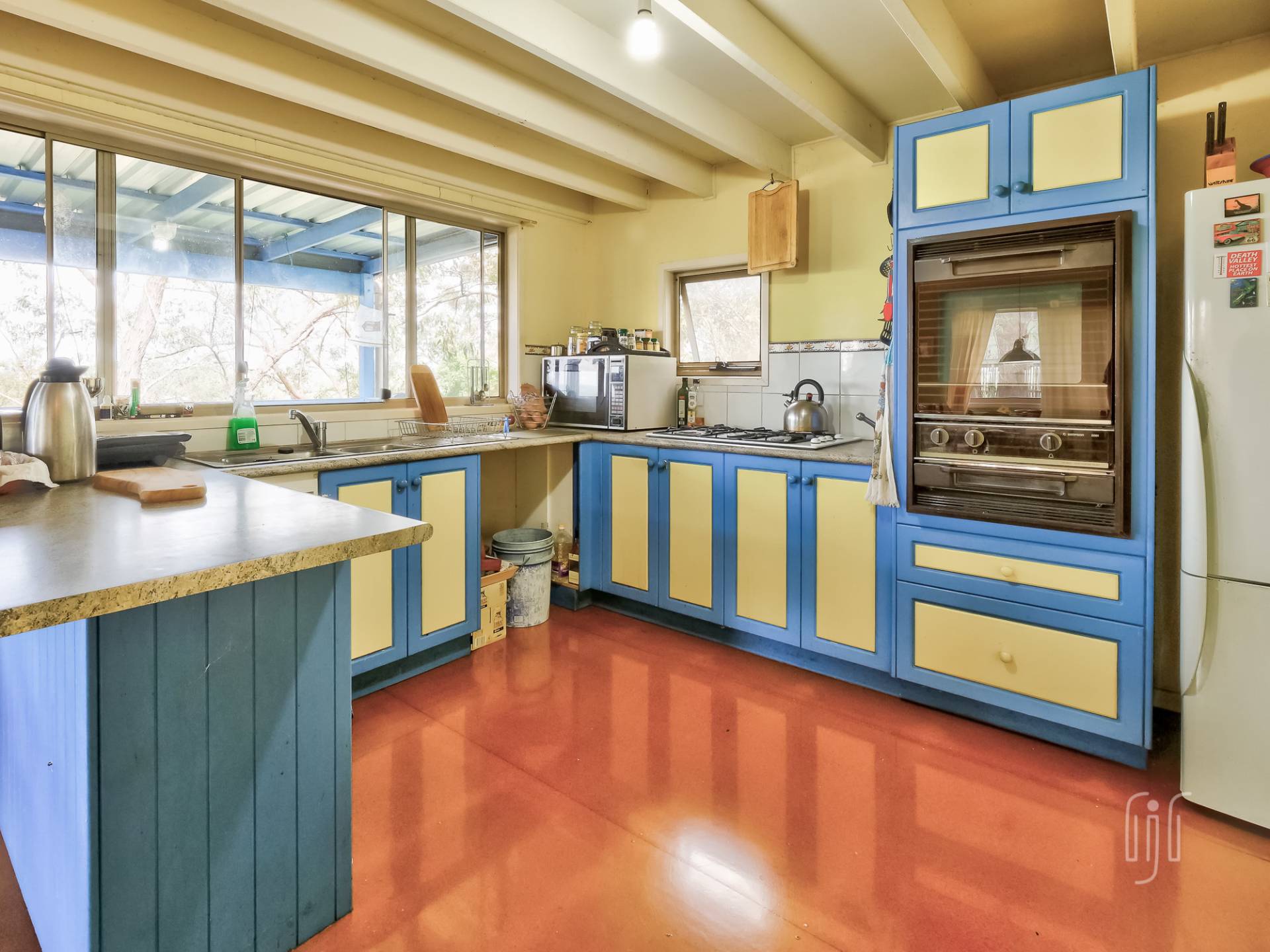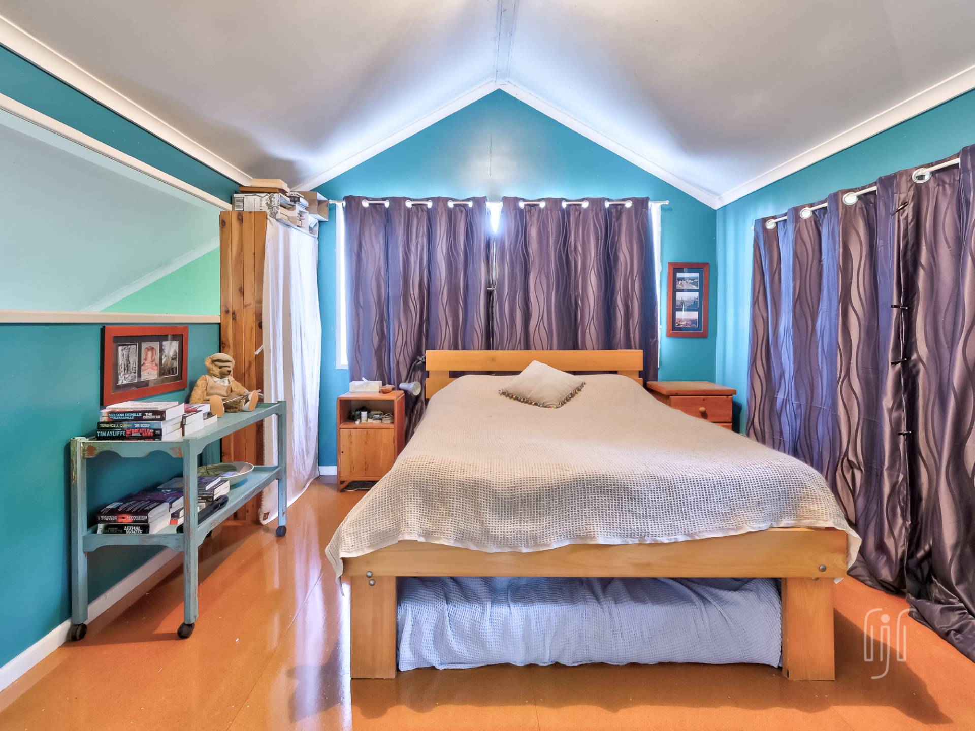 All the living area of this double storey home is on the lower level, L-shaped, semi open plan. The living room has cathedral ceilings while the kitchen has a gas cooktop and plenty of space. It all flows to the main relaxation & entertainment space, the rear deck. Now you are in the tree tops!