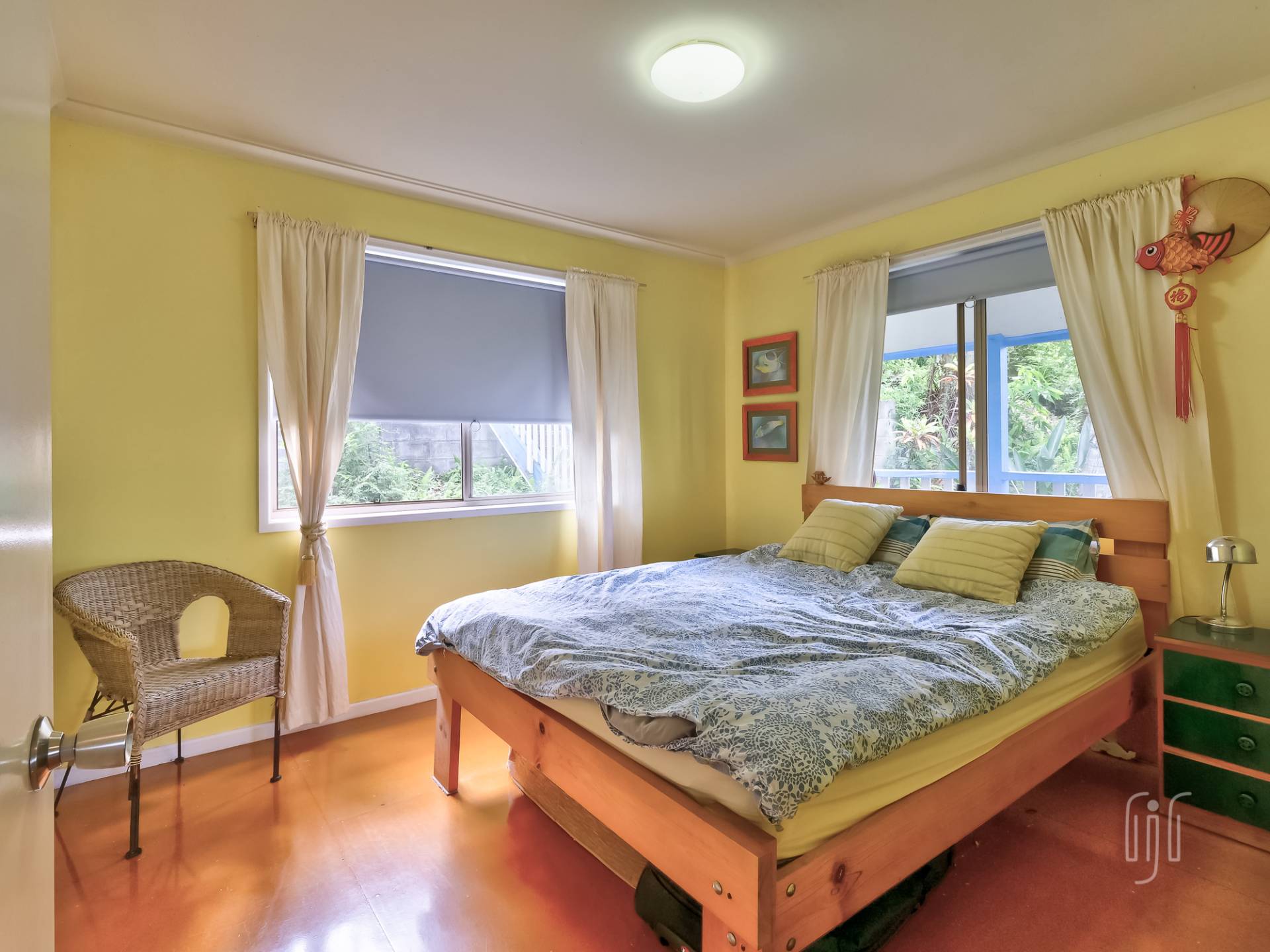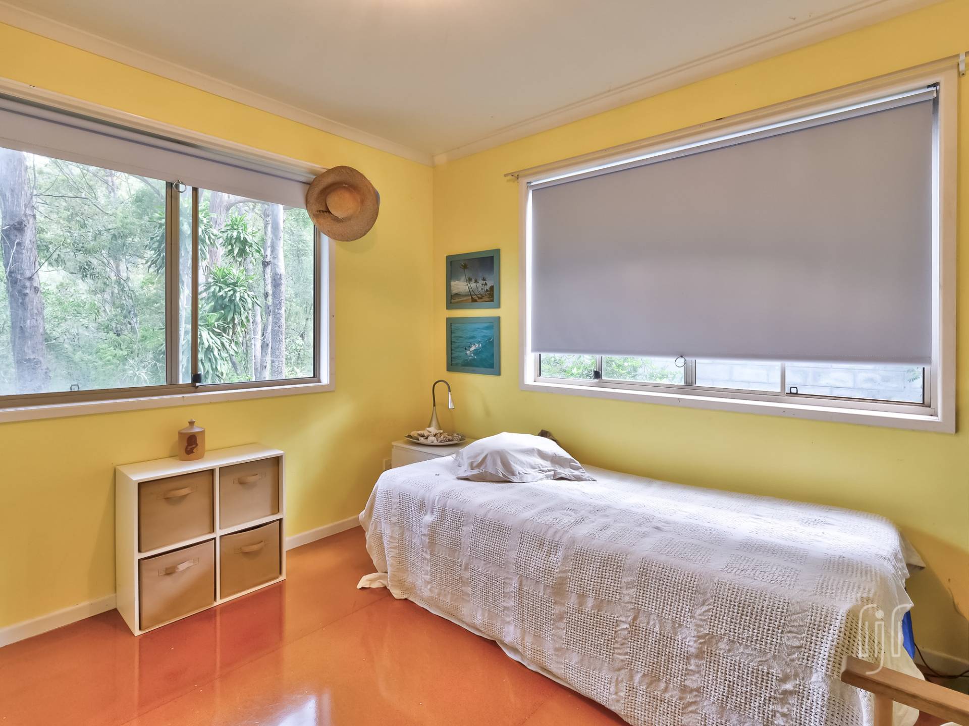 There are two bedrooms and the main bathroom on the lower level and another two on the top level (one currently used as a study). There are toilets on both levels.