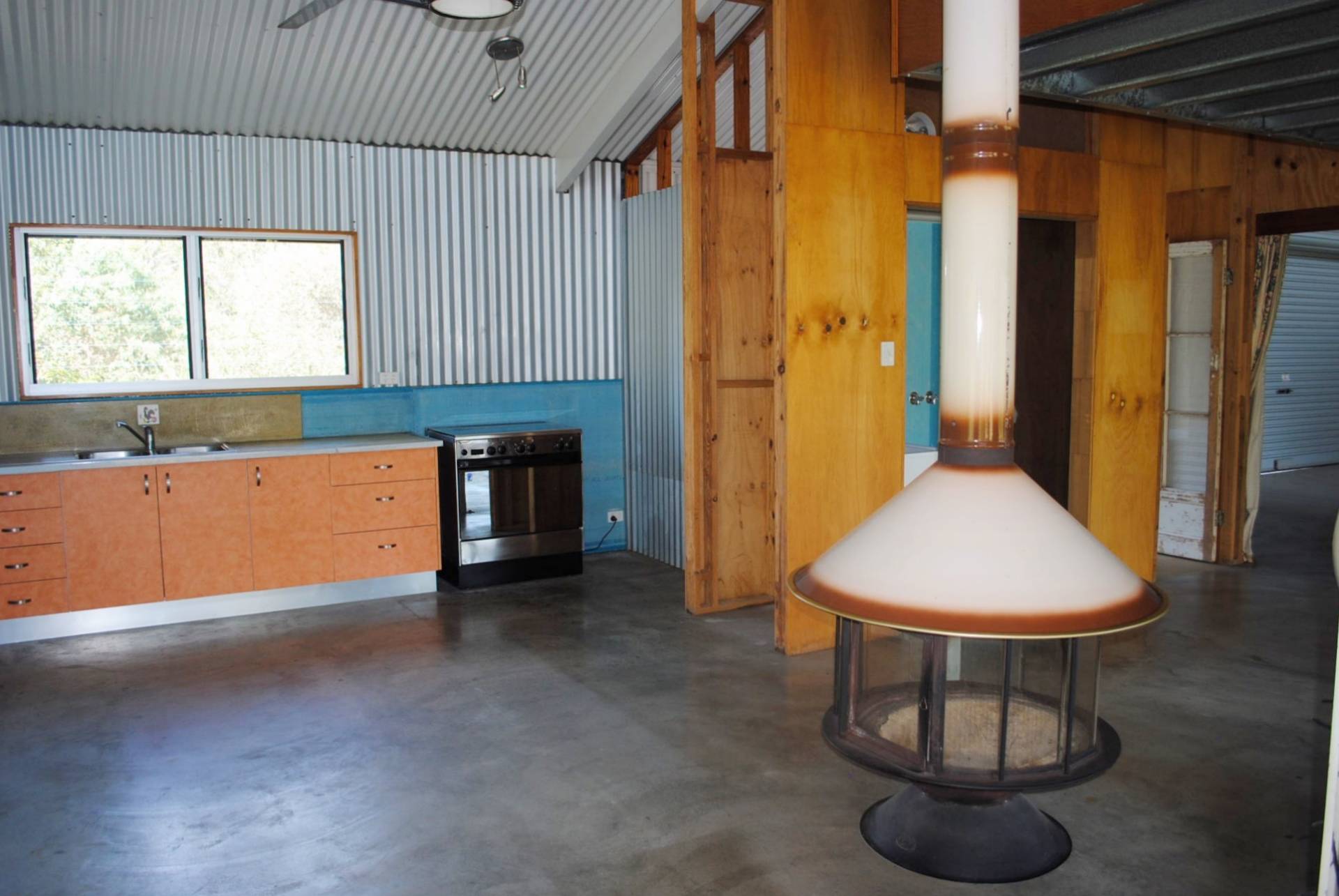 Open planned lounge, dining and kitchen areas with raked ceilings, polished concrete floors and ceiling fans throughout.  The lounge has a feature stone wall and wood circulation heater, the kitchen has a gas stove and the hot water system is also gas.