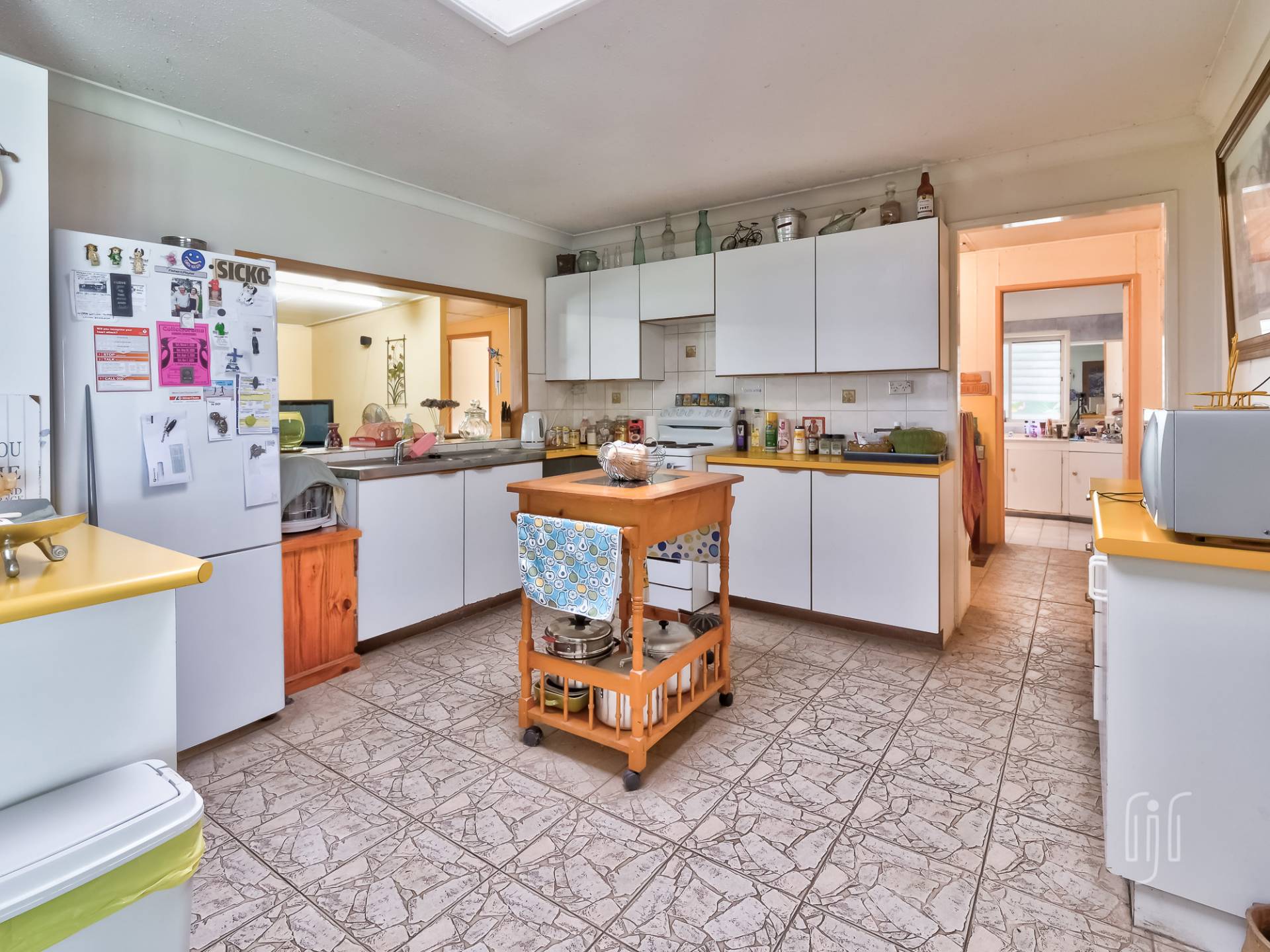 The house is larger than its street frontage suggests. It has been extended over the years, increasing the living area of the home. Speaking of living area, we enter from the wide, covered outside living space at the rear of the house to a lounge room with a slow combustion heater. This area is semi-separated from the kitchen/dining room. There is a third living room, beside the dining room, with vaulted ceilings. The kitchen has electric cooking and, because it’s in the centre of the home, a skylight.
