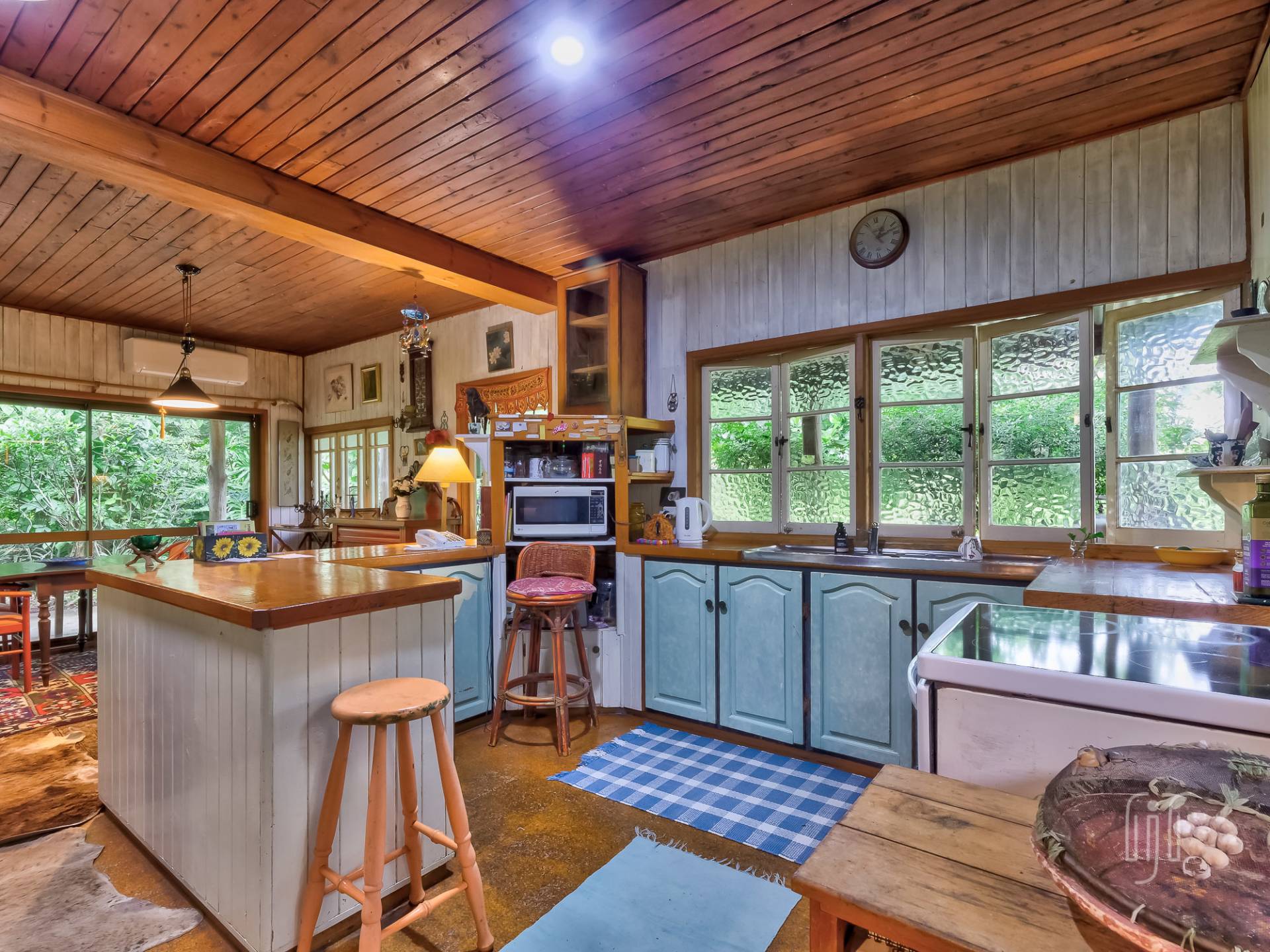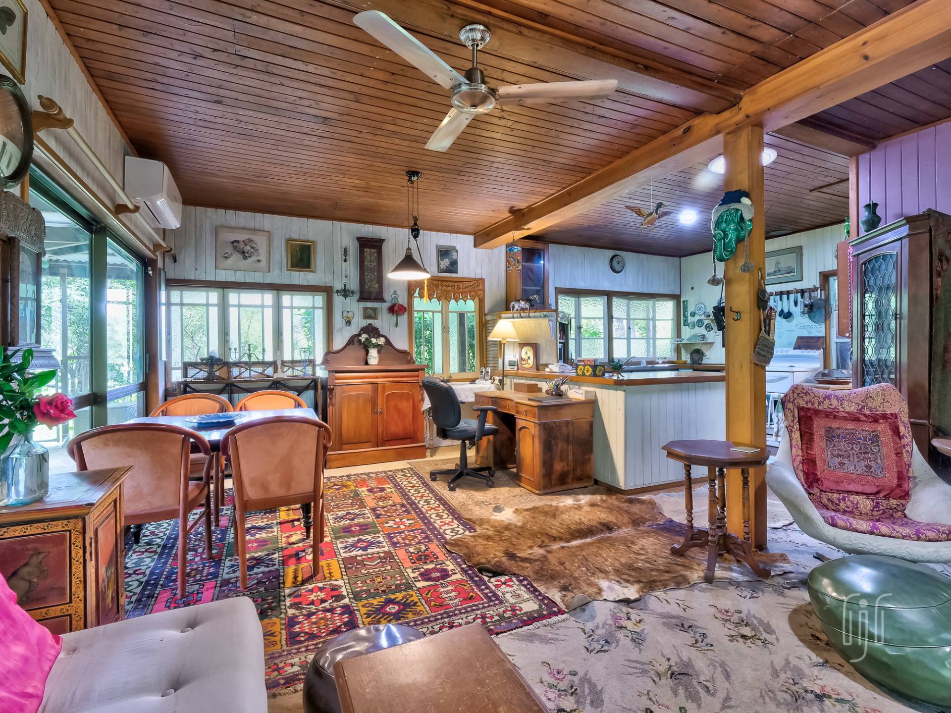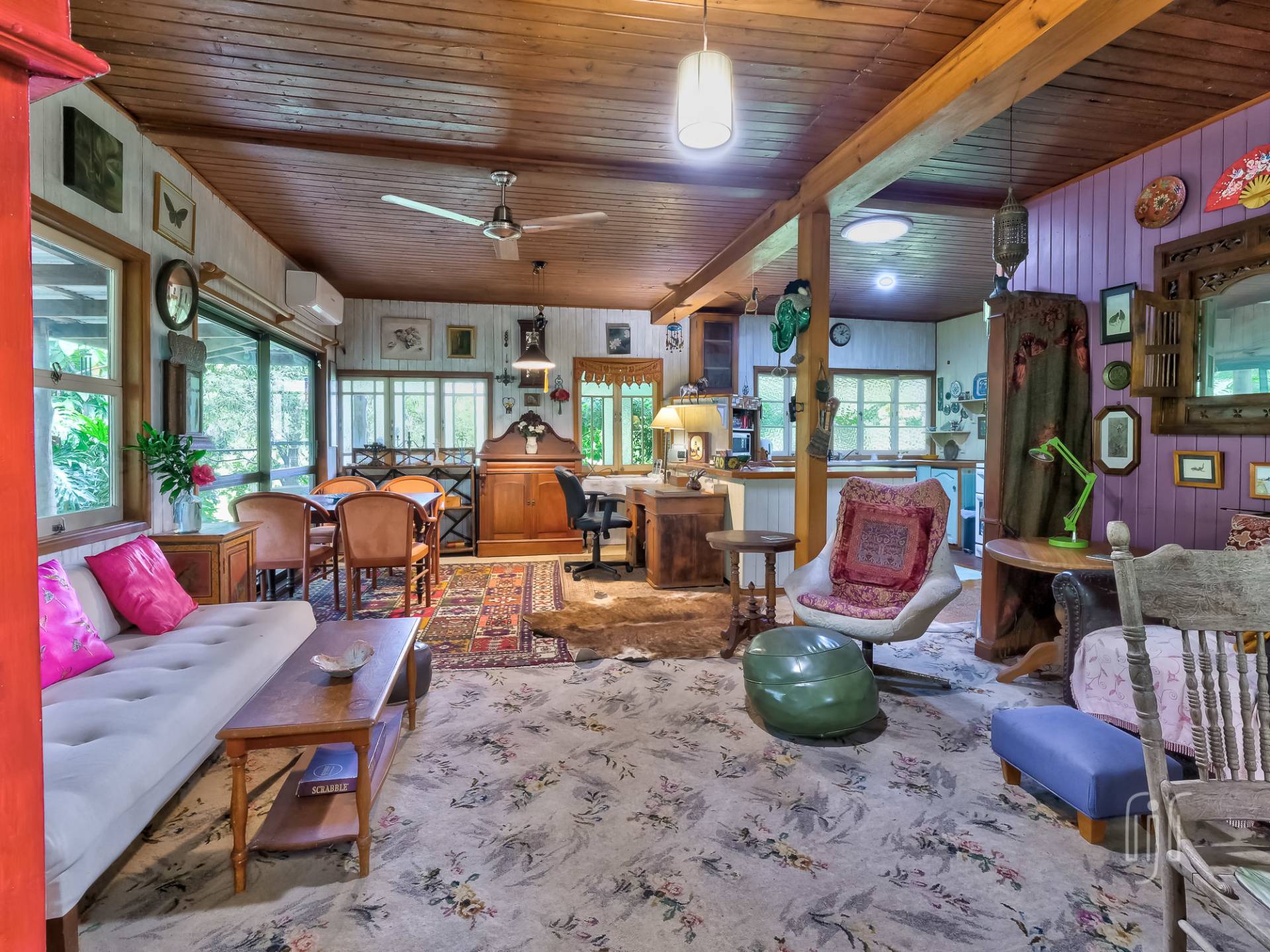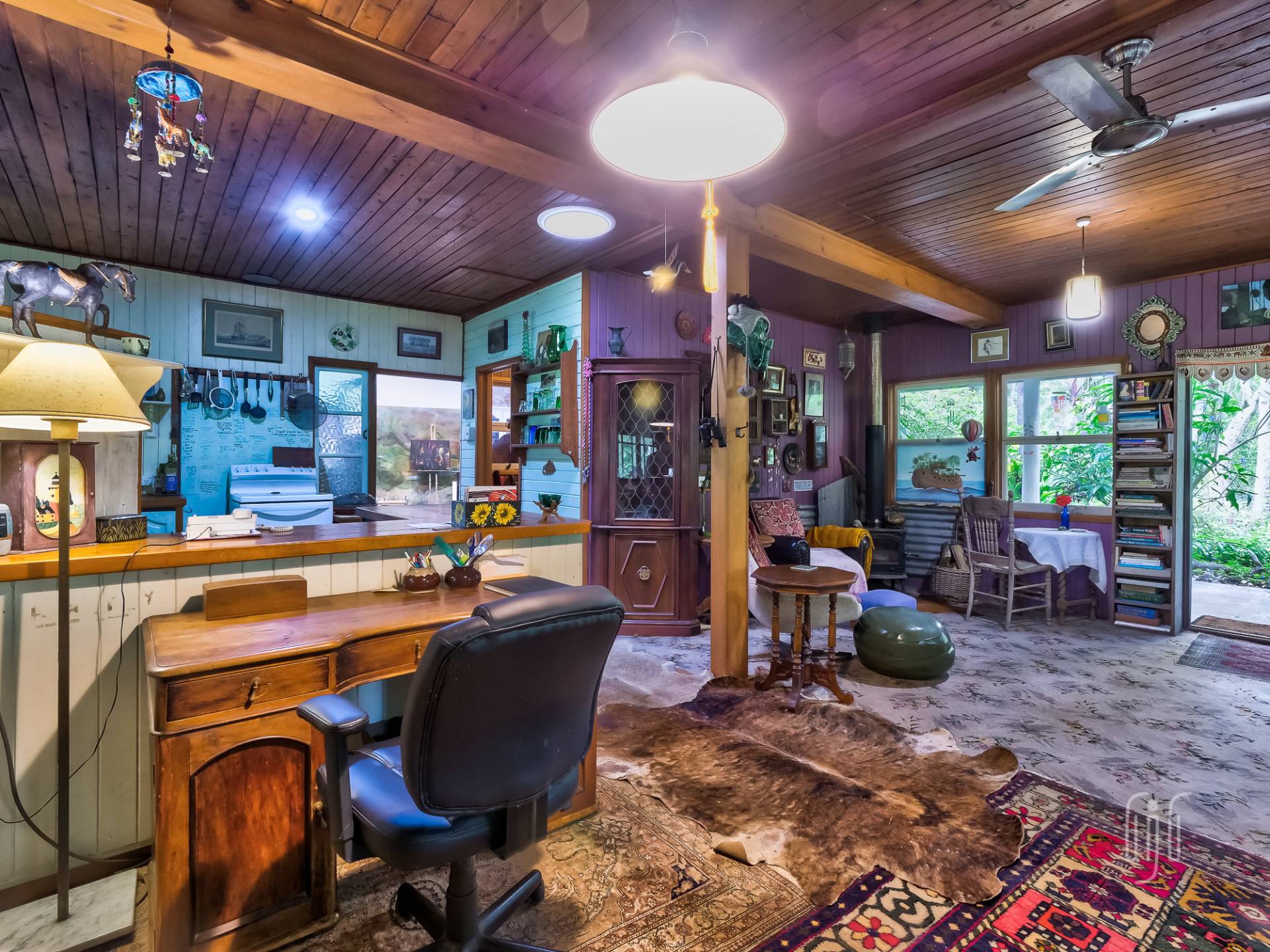 A wide veranda all but surrounds the home and makes a great entertainment / relaxation spot. Inside, the living area is open plan with plenty of light coming from doors and windows on three sides. The former home of an artist, it is full of her artistic touches. There are lots of timber features that include large beams, painted timber walls and timber kitchen bench tops. The floors are concrete with scatter rugs and carpet. A pantry room is the feature of the kitchen.