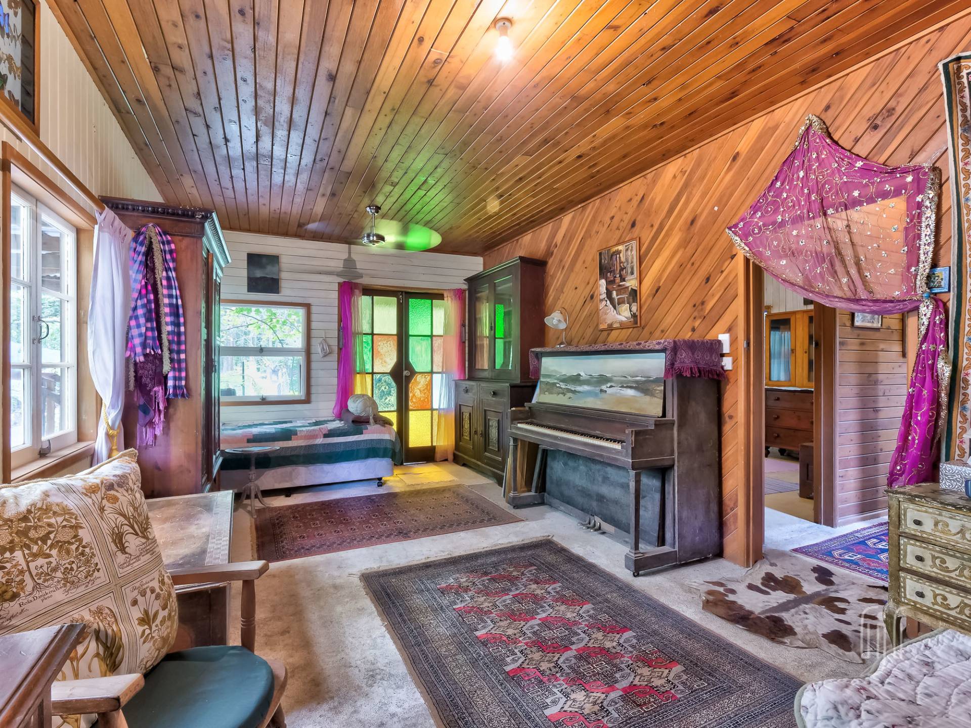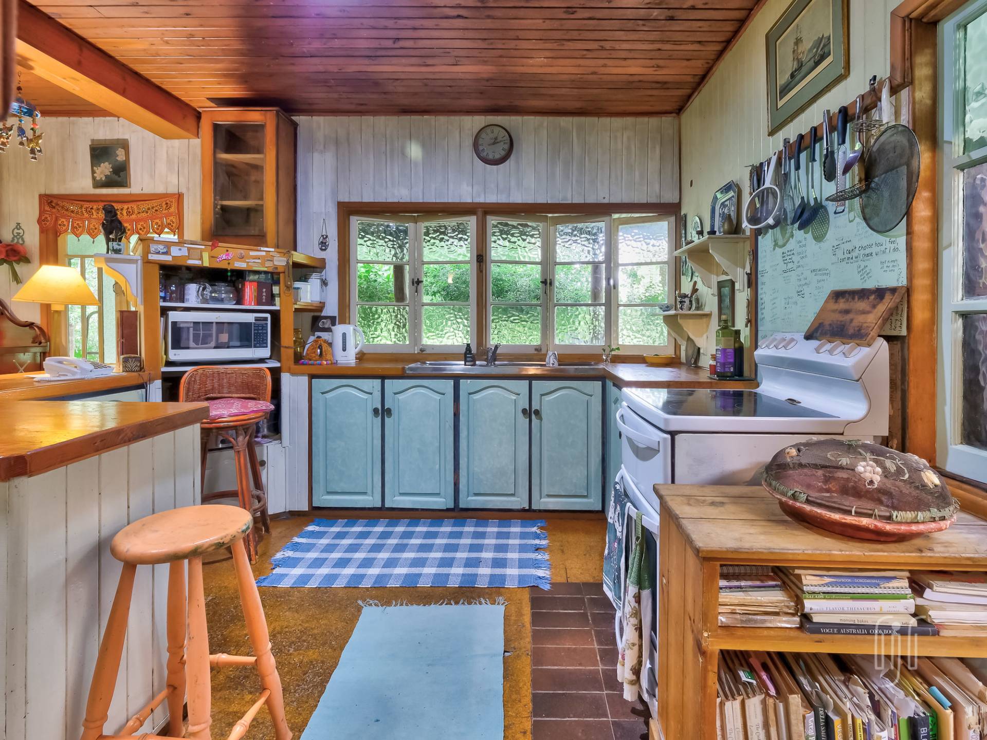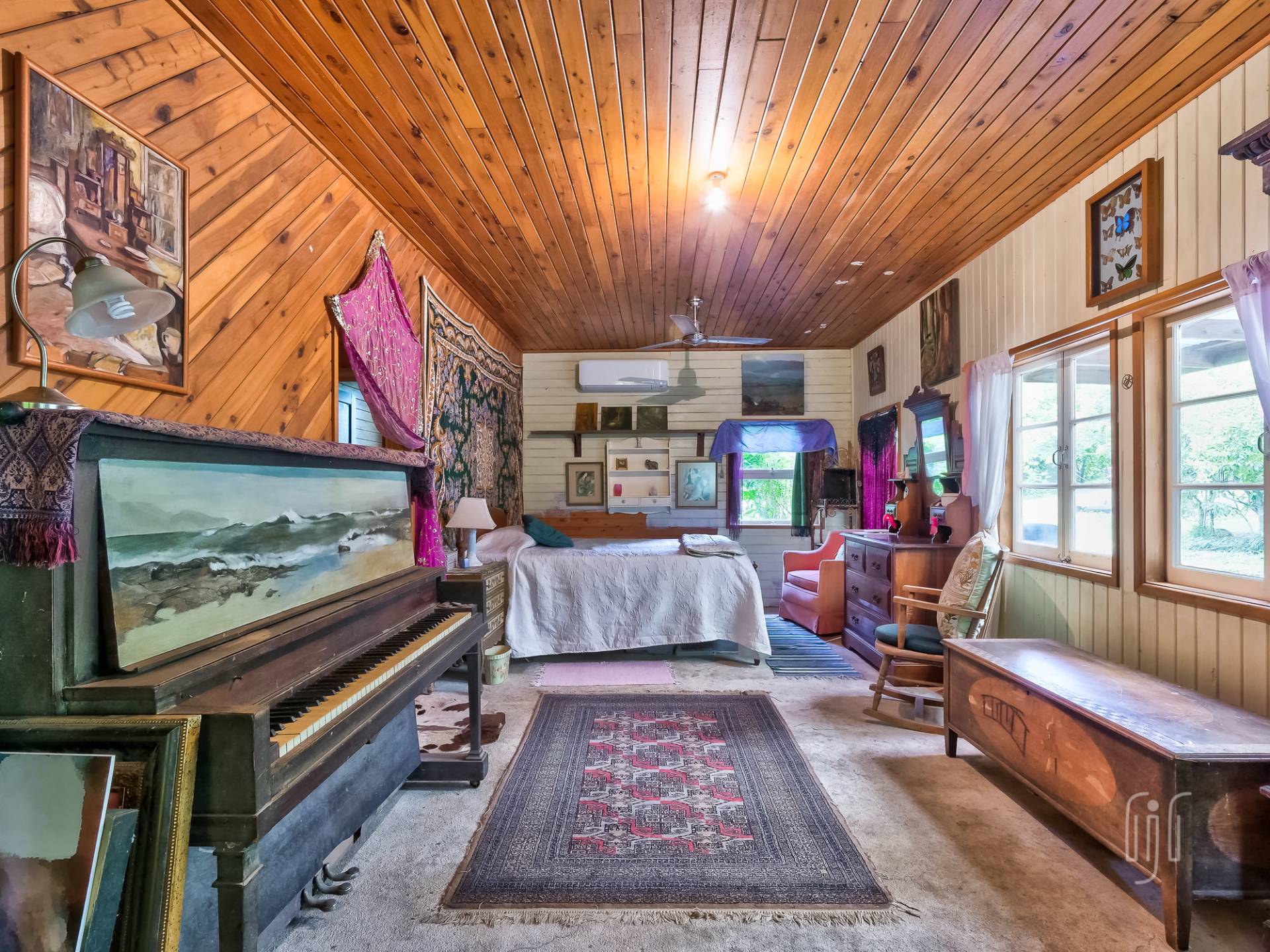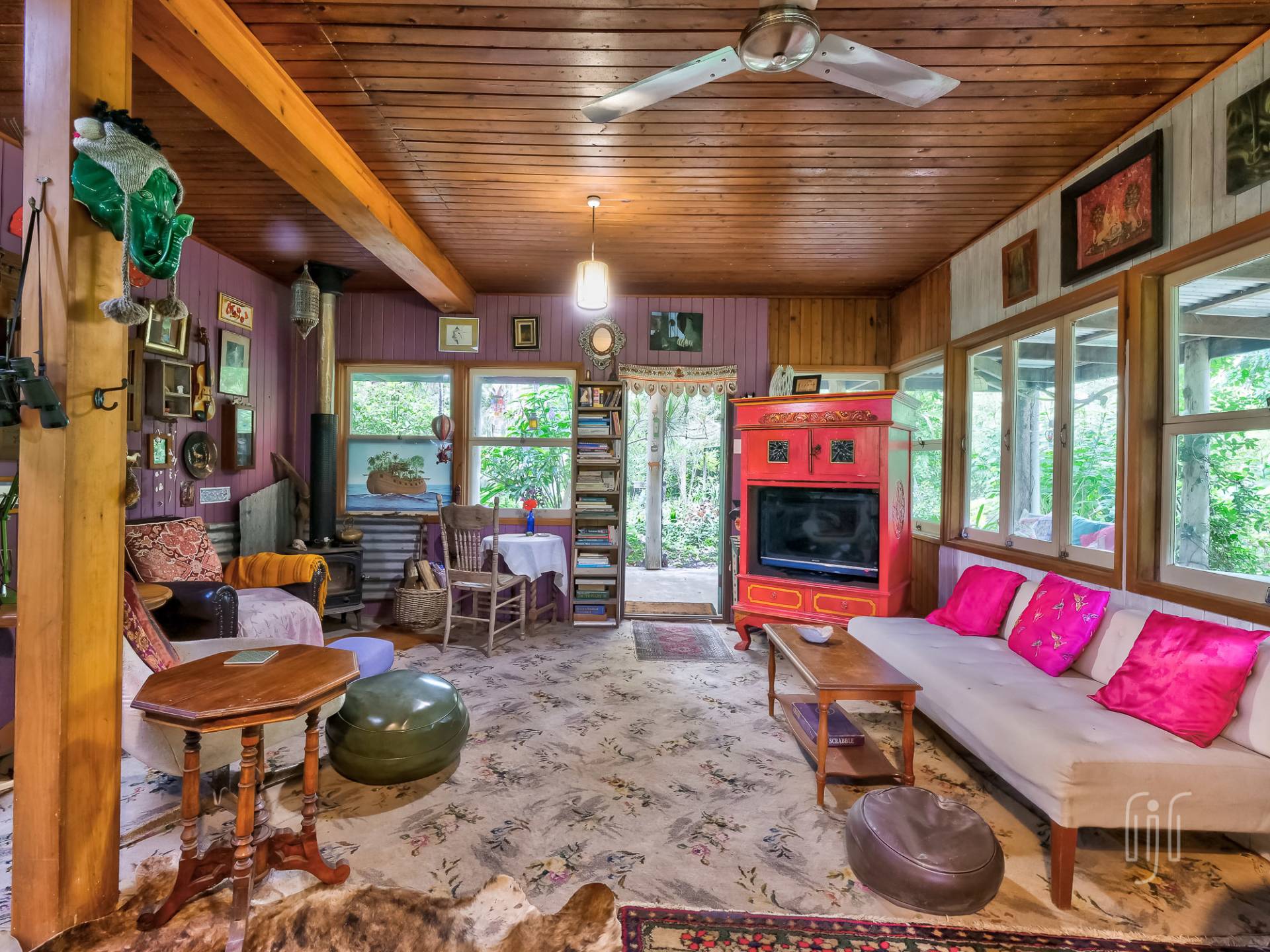 A wide veranda all but surrounds the home and makes a great entertainment / relaxation spot. Inside, the living area is open plan with plenty of light coming from doors and windows on three sides. The former home of an artist, it is full of her artistic touches. There are lots of timber features that include large beams, painted timber walls and timber kitchen bench tops. The floors are concrete with scatter rugs and carpet. A pantry room is the feature of the kitchen.