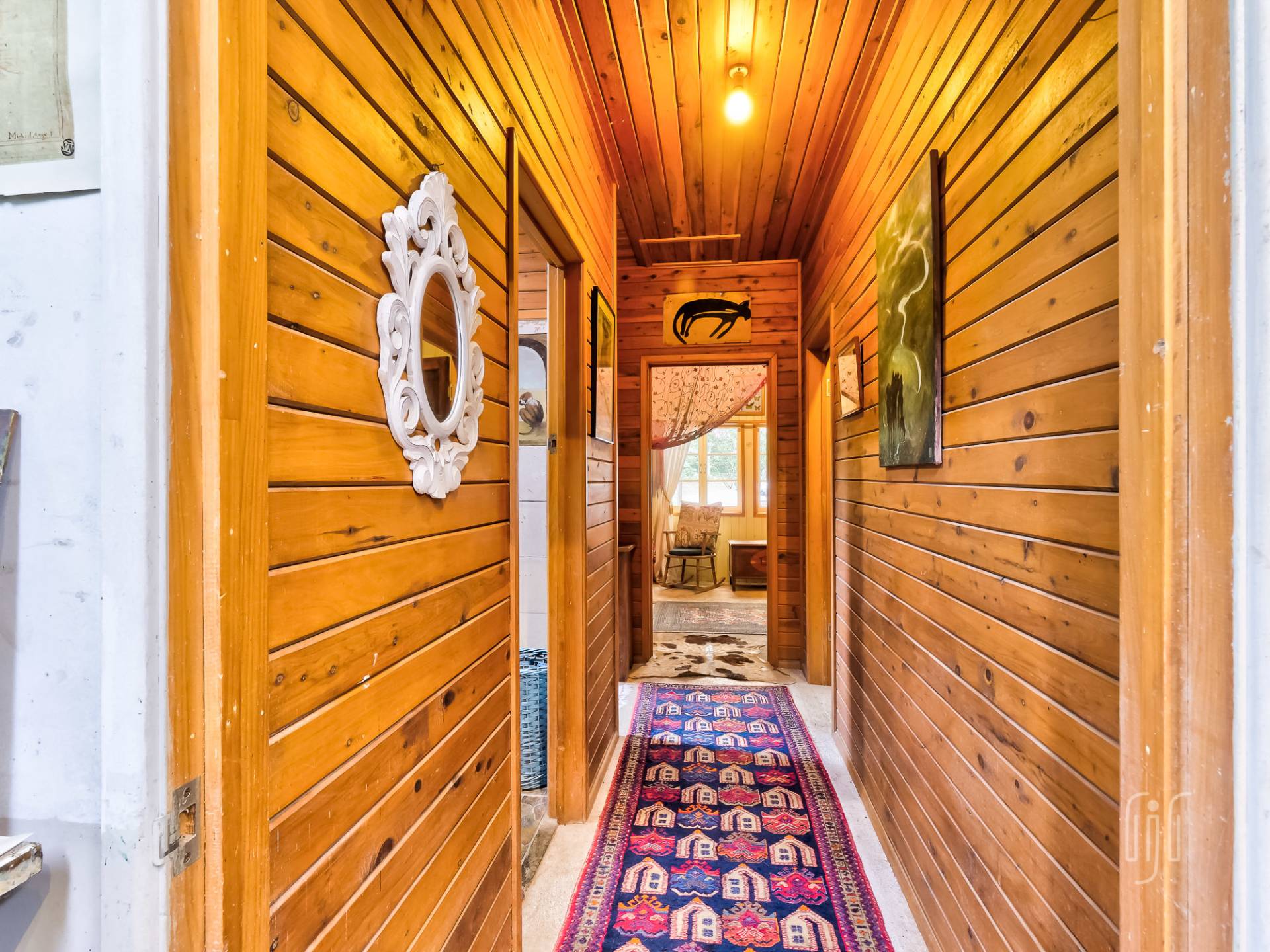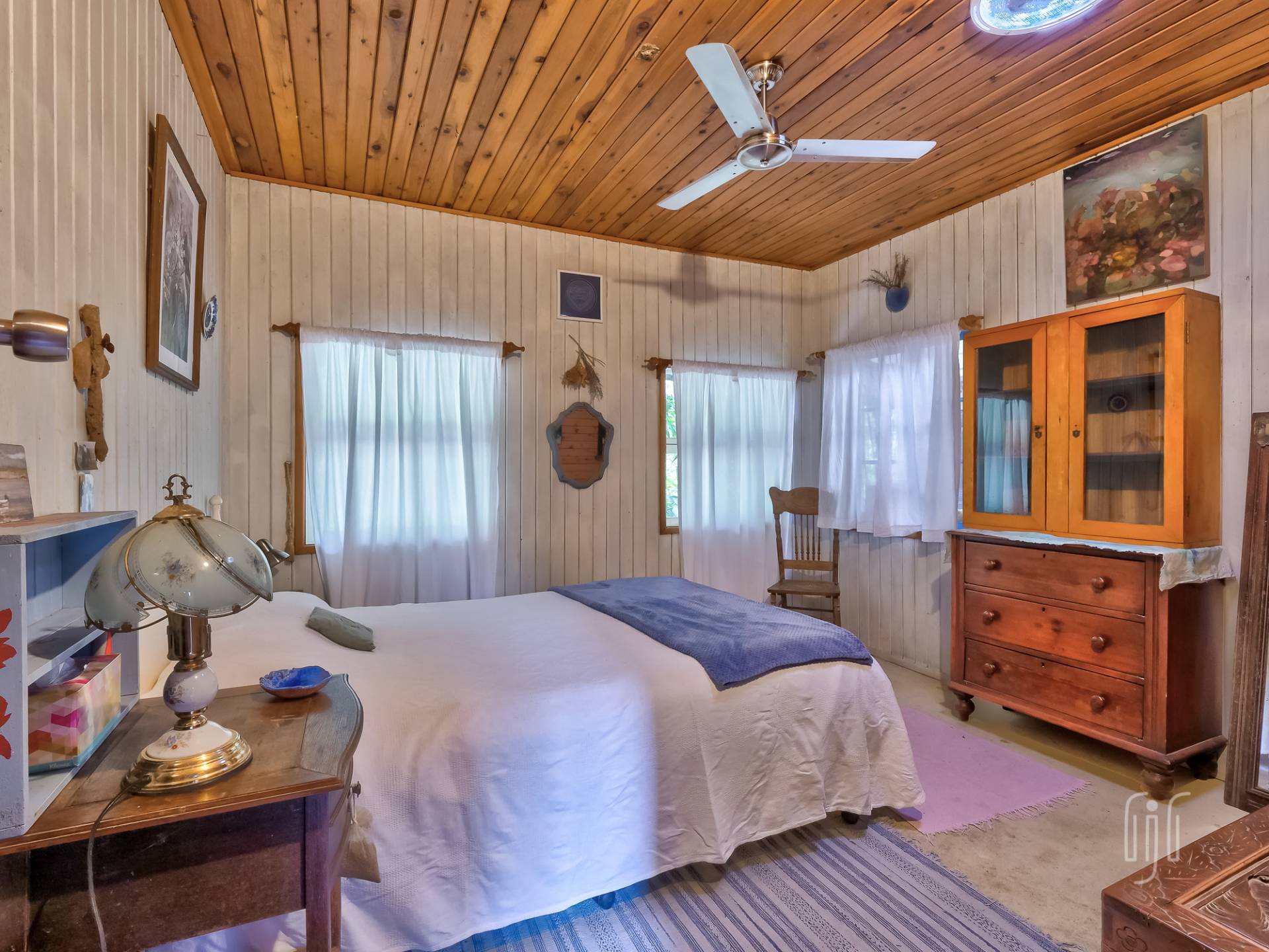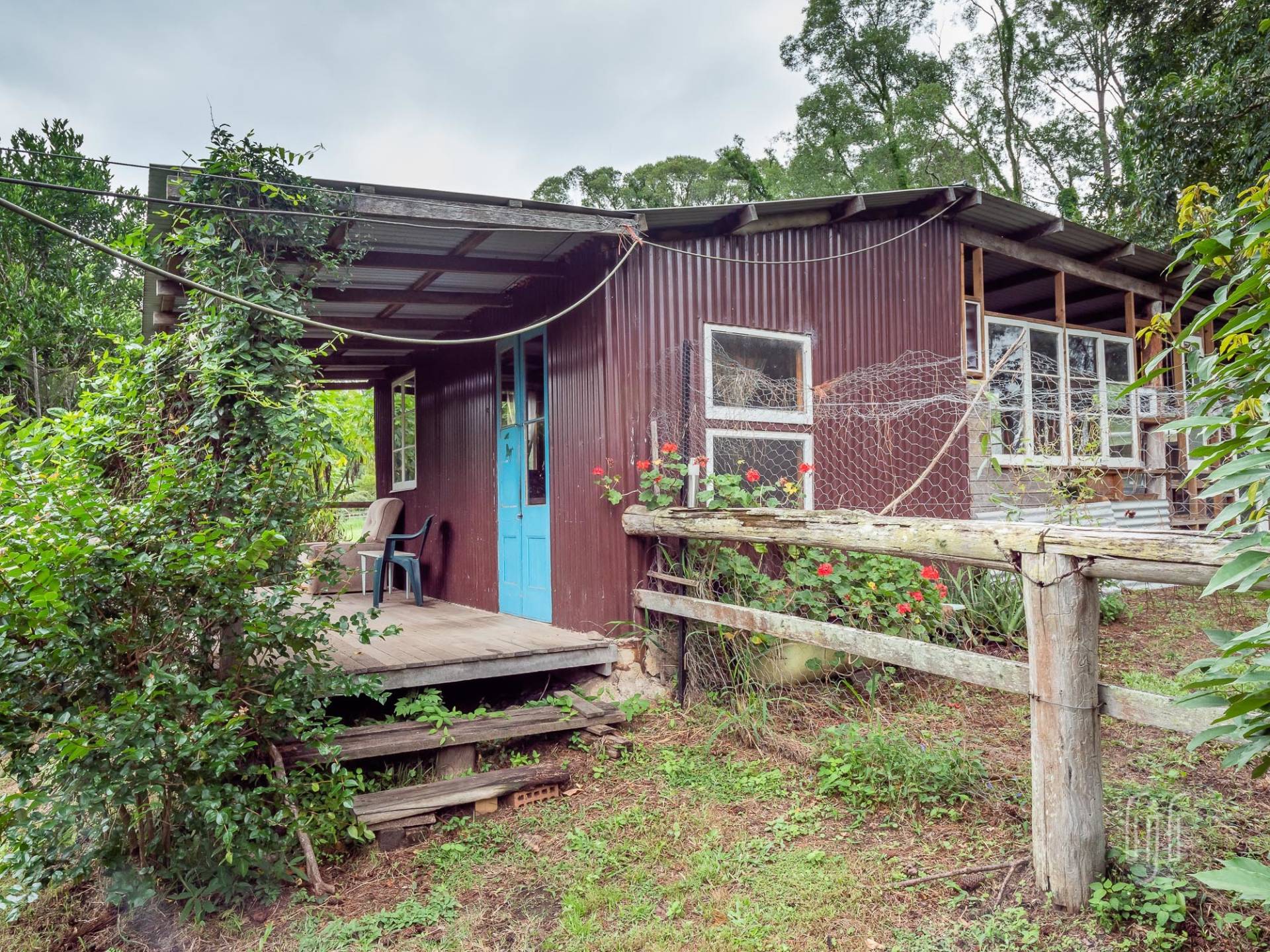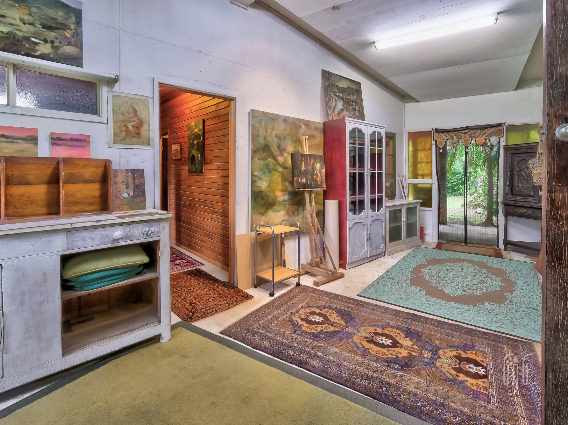 A wide veranda all but surrounds the home and makes a great entertainment / relaxation spot. Inside, the living area is open plan with plenty of light coming from doors and windows on three sides. The former home of an artist, it is full of her artistic touches. There are lots of timber features that include large beams, painted timber walls and timber kitchen bench tops. The floors are concrete with scatter rugs and carpet. A pantry room is the feature of the kitchen.