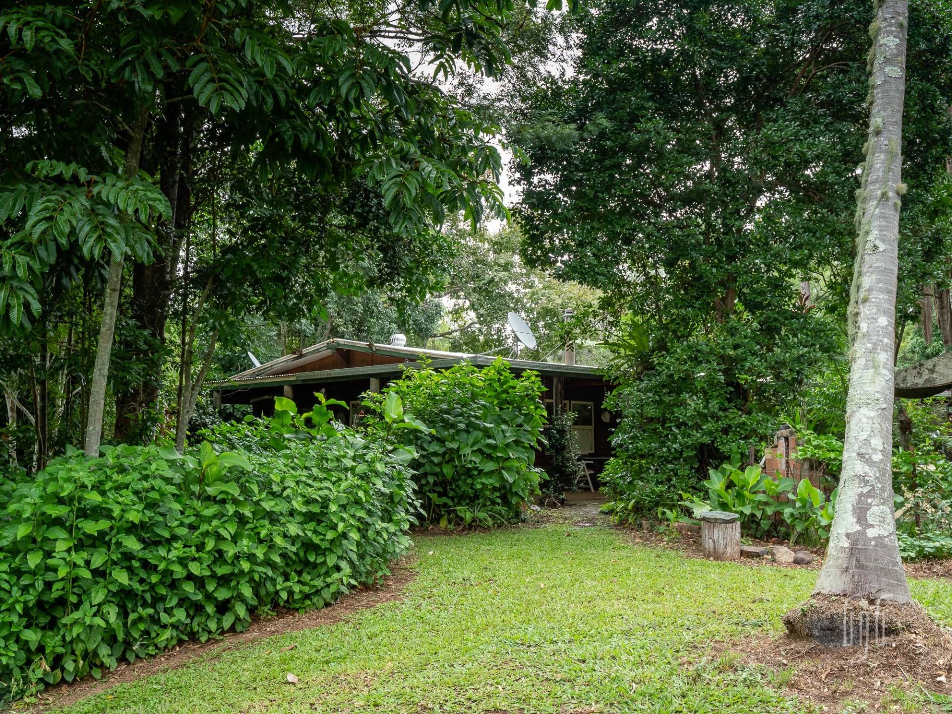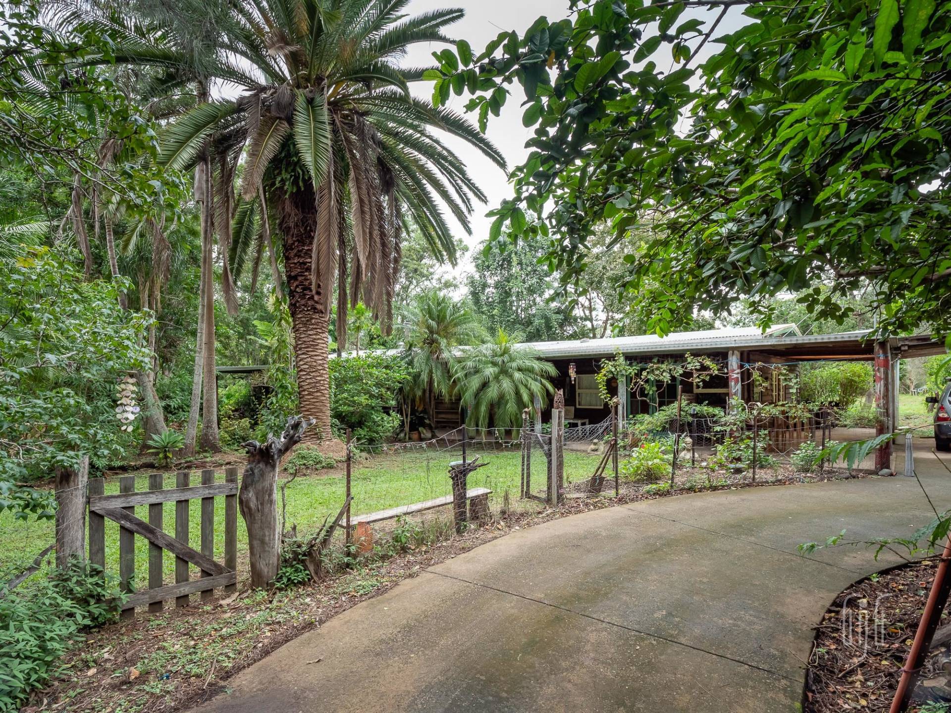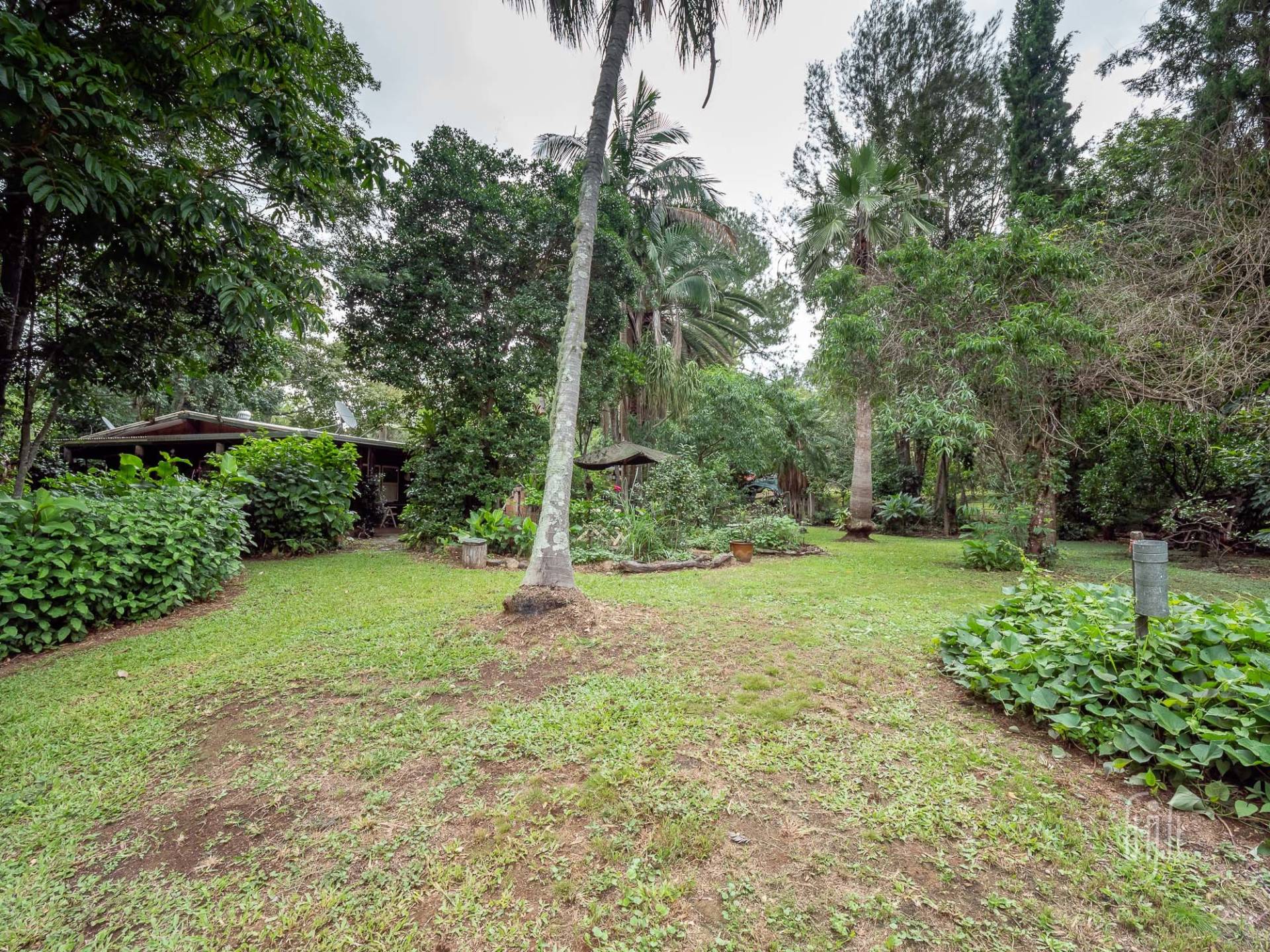 The quirky home at 7 Marroo Rd Brooloo is tucked into its leafy setting on this 8 acre (3.25 ha) block where you arrive at the house on a concrete circular-driveway. If the house is quirky, the grounds are rambly! It’s largely a tropical garden with palm trees as the feature. It’s sooo peaceful here!