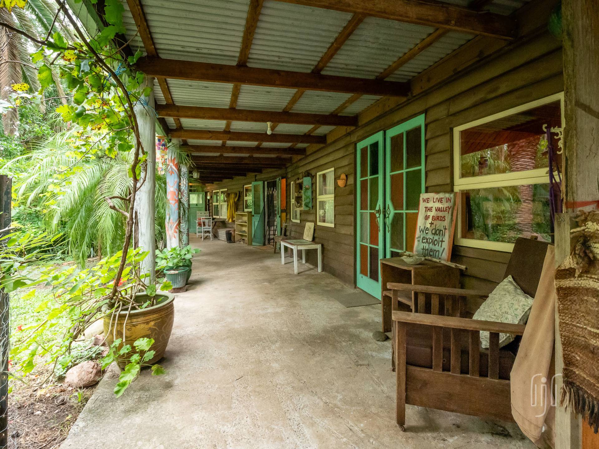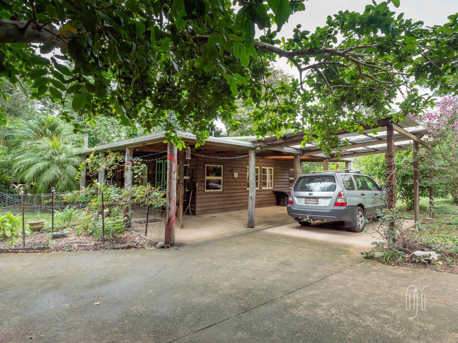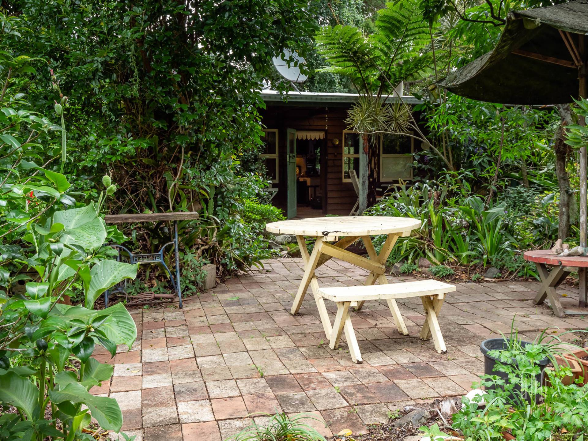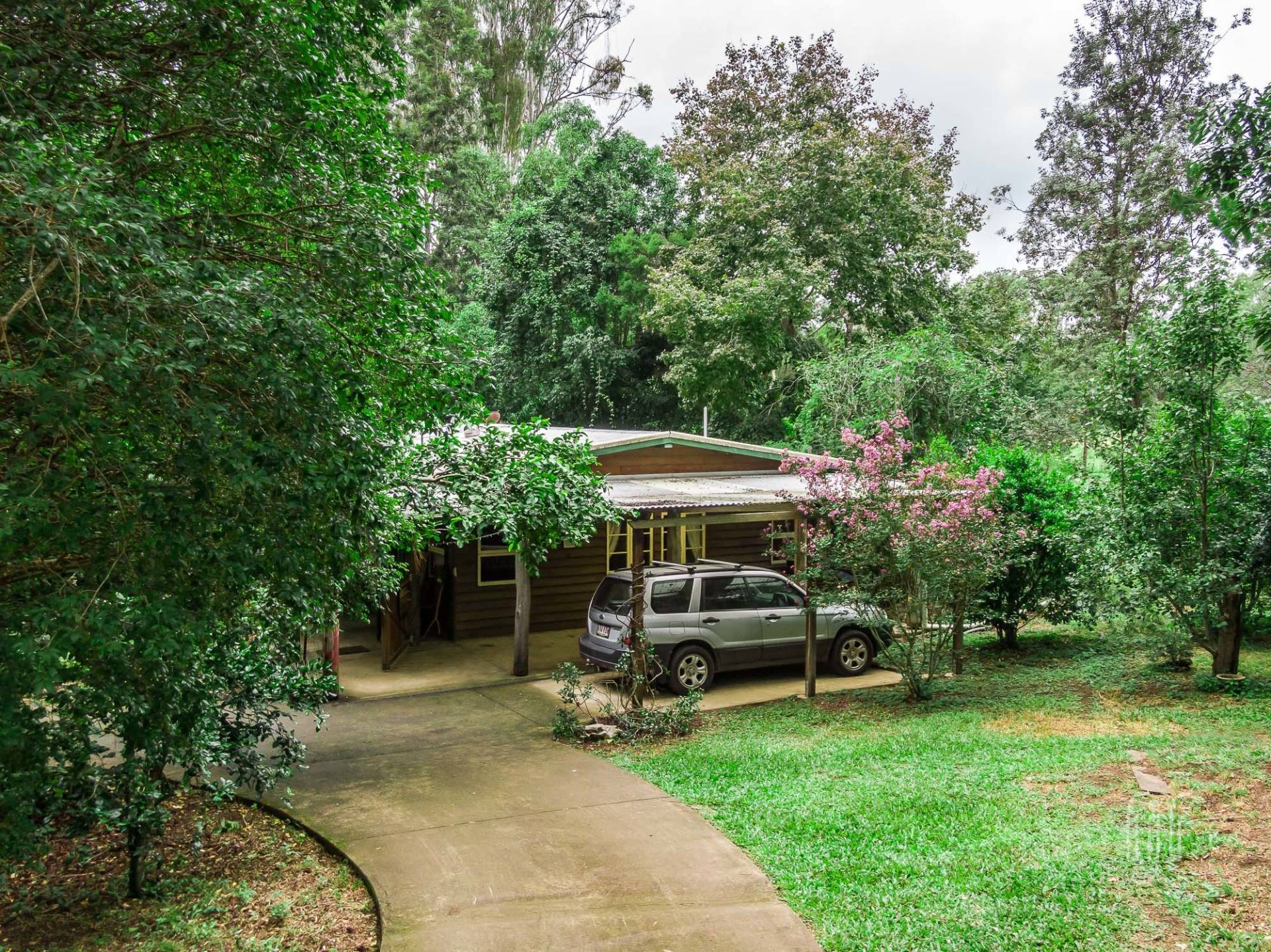 The quirky home at 7 Marroo Rd Brooloo is tucked into its leafy setting on this 8 acre (3.25 ha) block where you arrive at the house on a concrete circular-driveway. If the house is quirky, the grounds are rambly! It’s largely a tropical garden with palm trees as the feature. It’s sooo peaceful here!