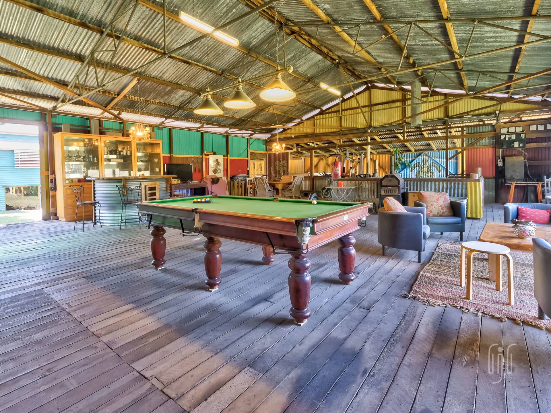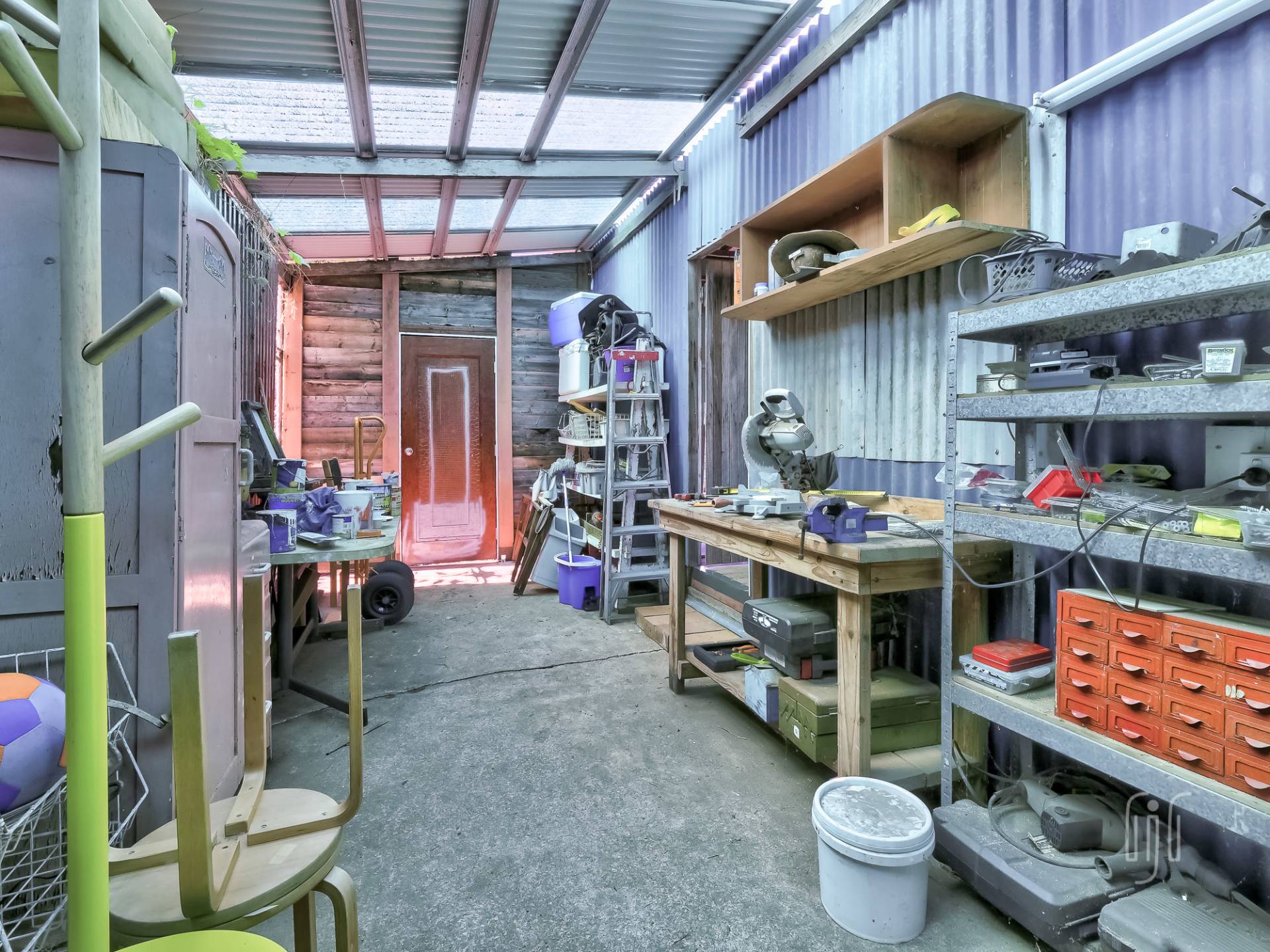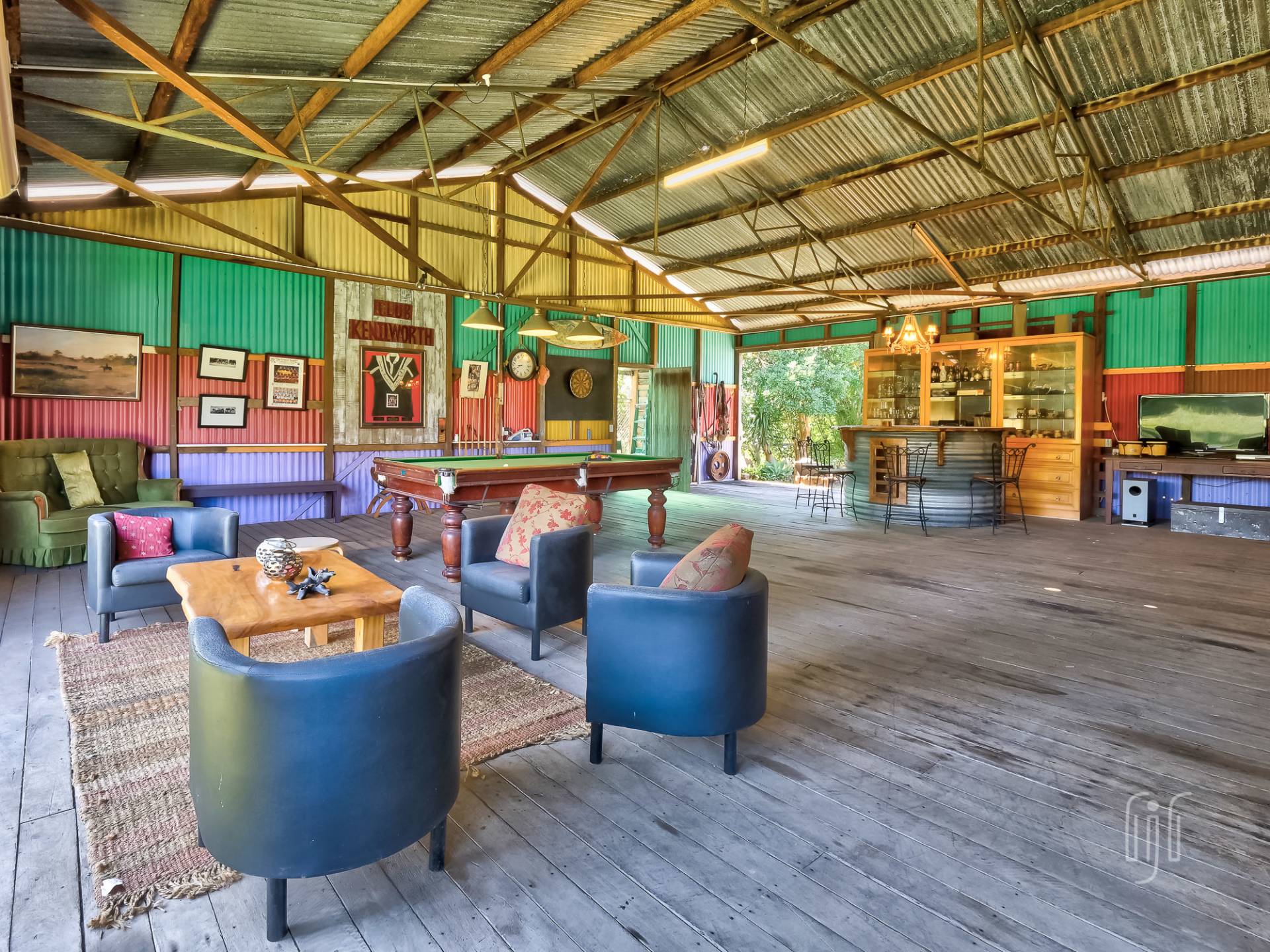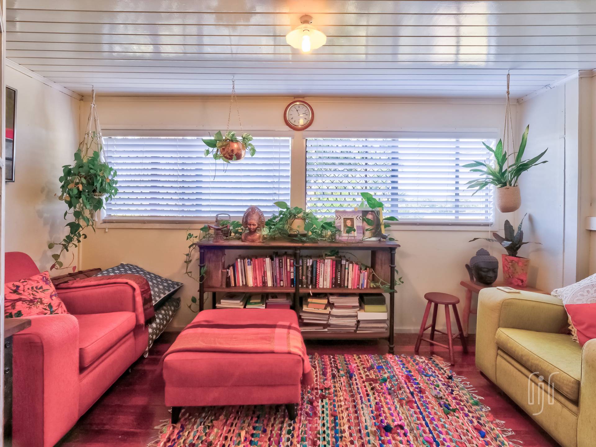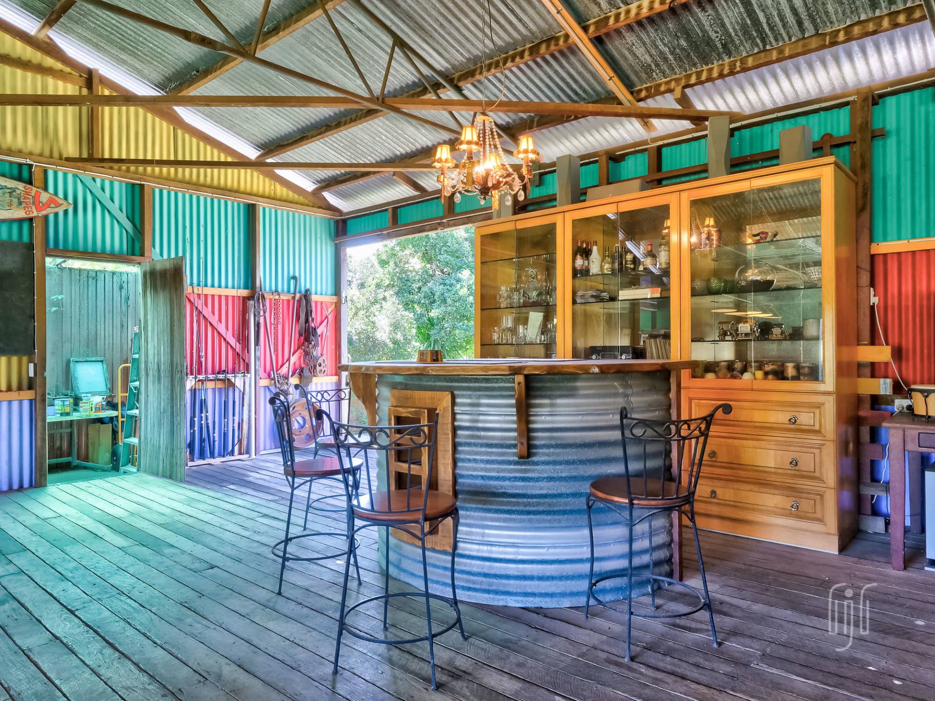 A repurposed industrial shed at the rear of the block helps to create a courtyard that includes a covered area for morning coffee/afternoon drinks and a BBQ shed! The shed, reminiscent of an Australian shearing shed, is a great he/she cave, the perfect party venue. It’s a quirky building that has everything from a bar to a pool table and is decorated with splashes of colour and chandeliers! There is plenty of storage room and under cover parking for at least 3 vehicles.