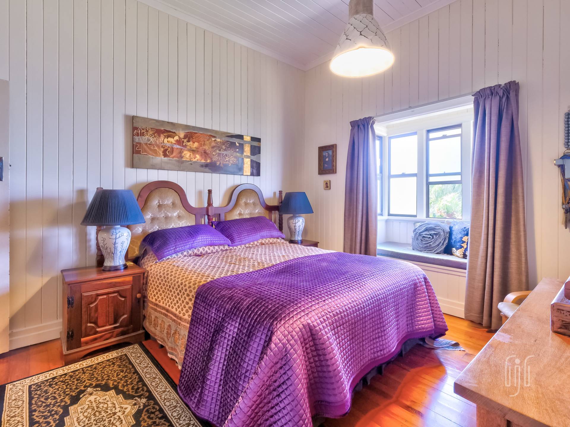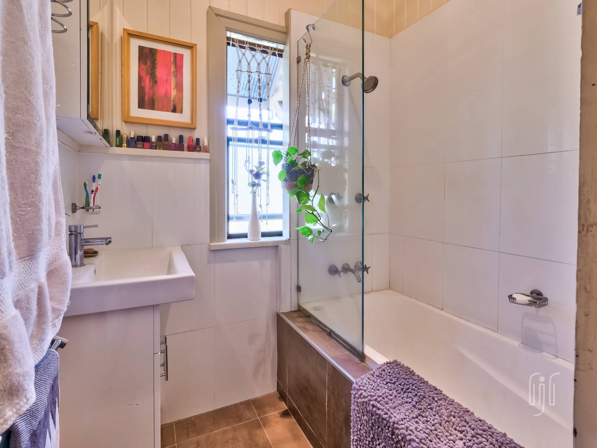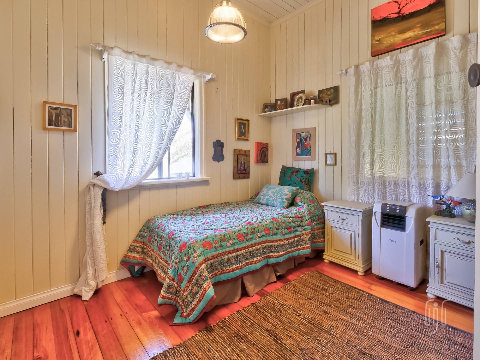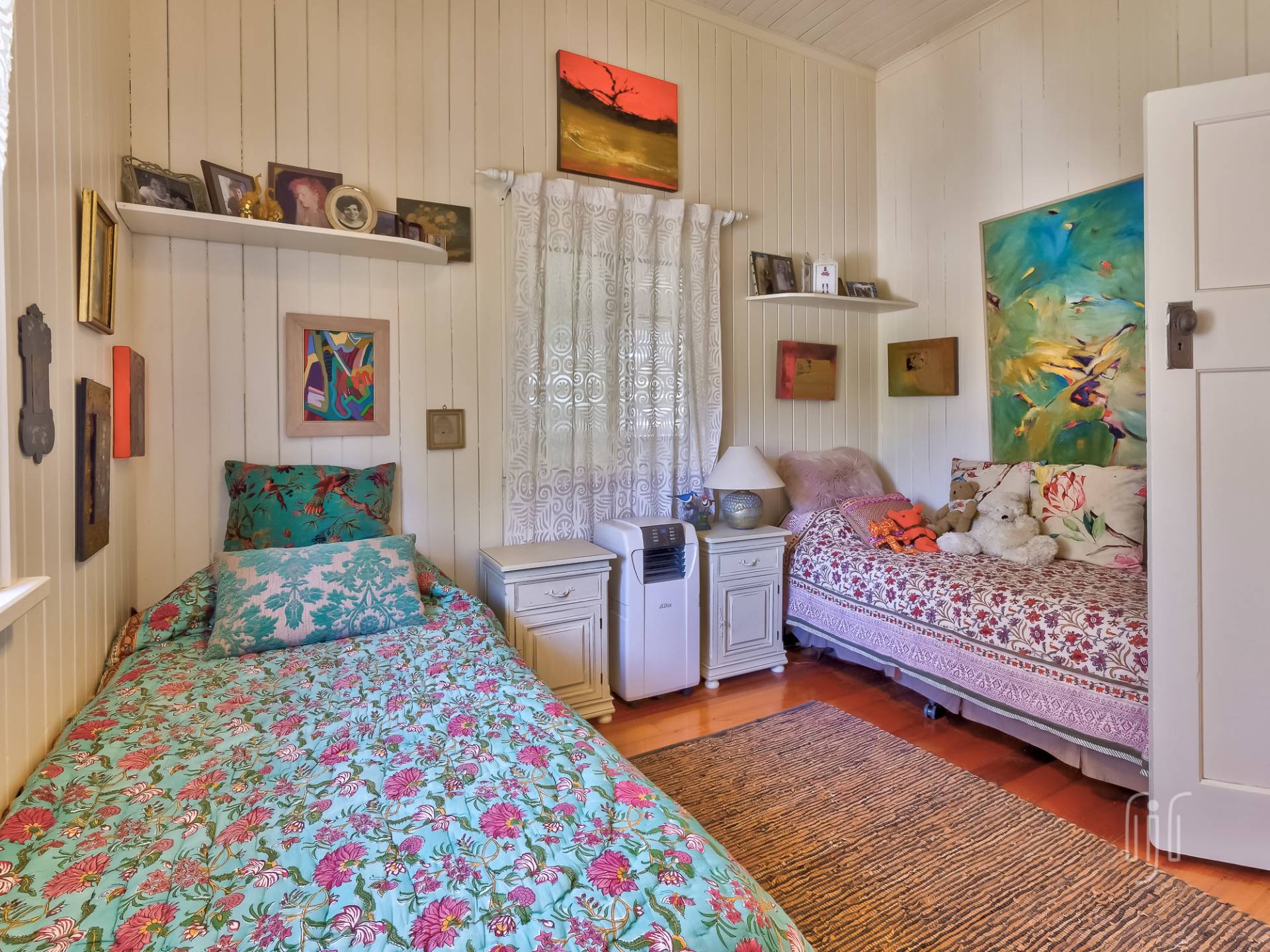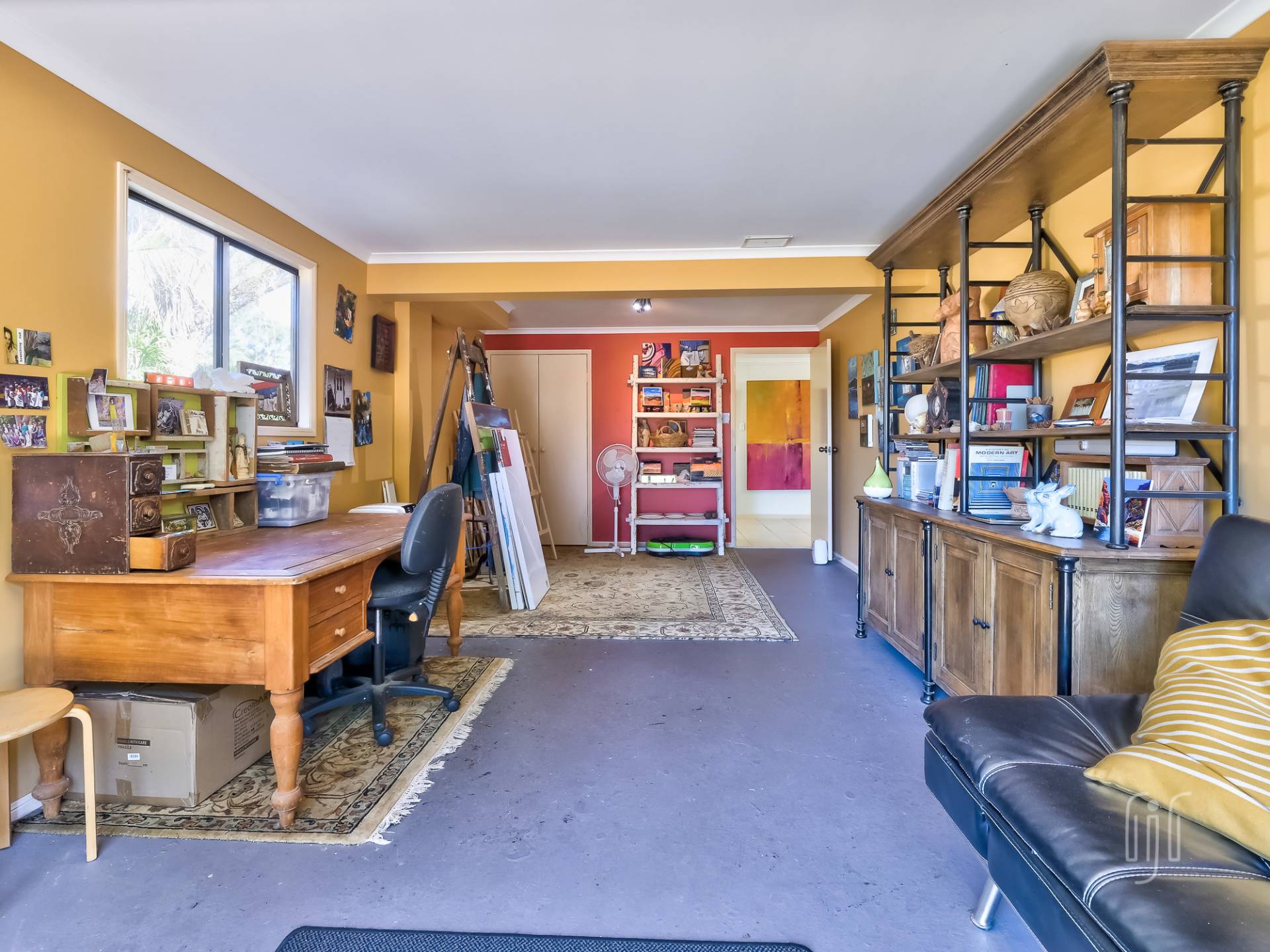Internal stairs lead to the lower level. An artist’s home, the central room on this level is currently her gallery and the second bedroom is her studio. These, together with a kitchenette, another bedroom and full bathroom facilities, makes this level totally self-contained.