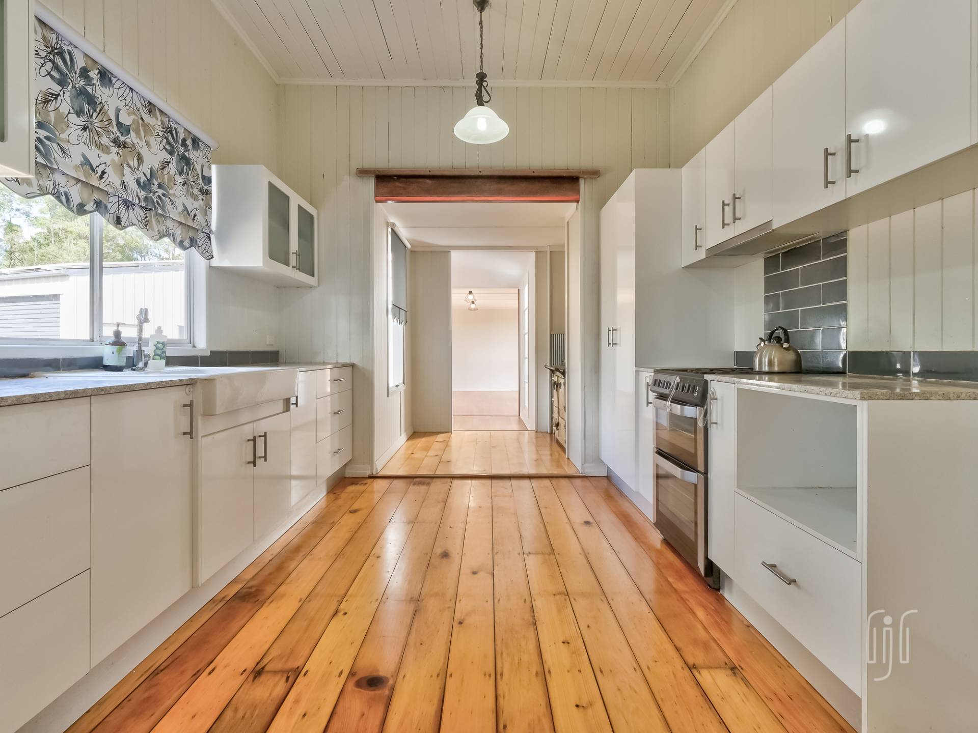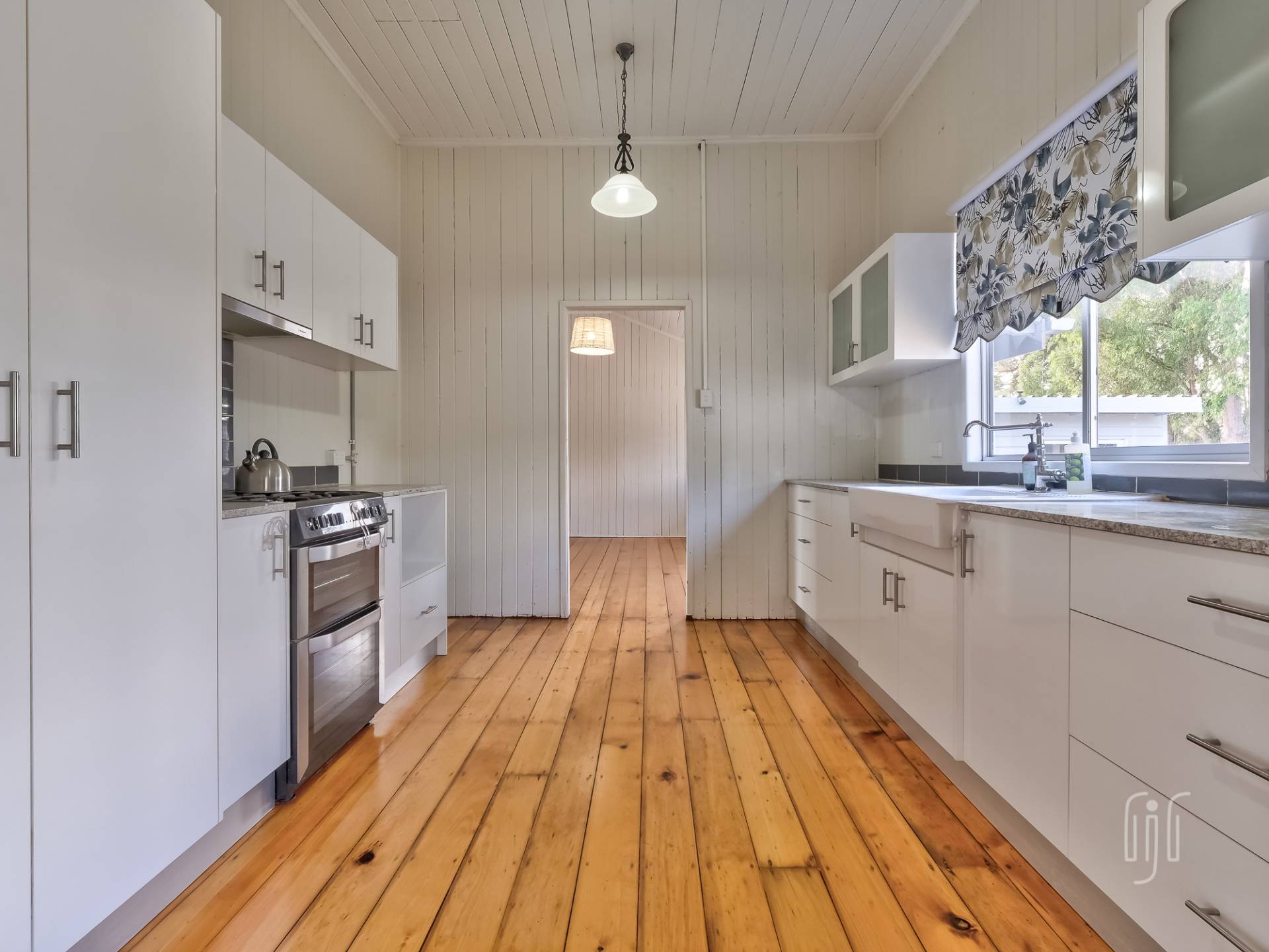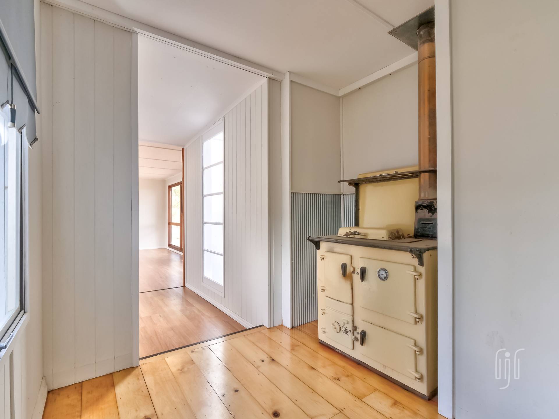 The weatherboard cottage was relocated to this site before being refurbished and extended. There are a choice of three north- facing decks but we enter from the main veranda, straight into the lounge room. The original part of the cottage has high ceilings & polished timber floors and a versatile floor plan with three individual living spaces - lounge, dining & rumpus/3rd bedroom. The galley-style kitchen has good storage that includes a pantry and a choice of two stoves – gas & slow combustion. There are two dedicated bedrooms, the main with a walk-in robe, a study and one bathroom with a feature bath.