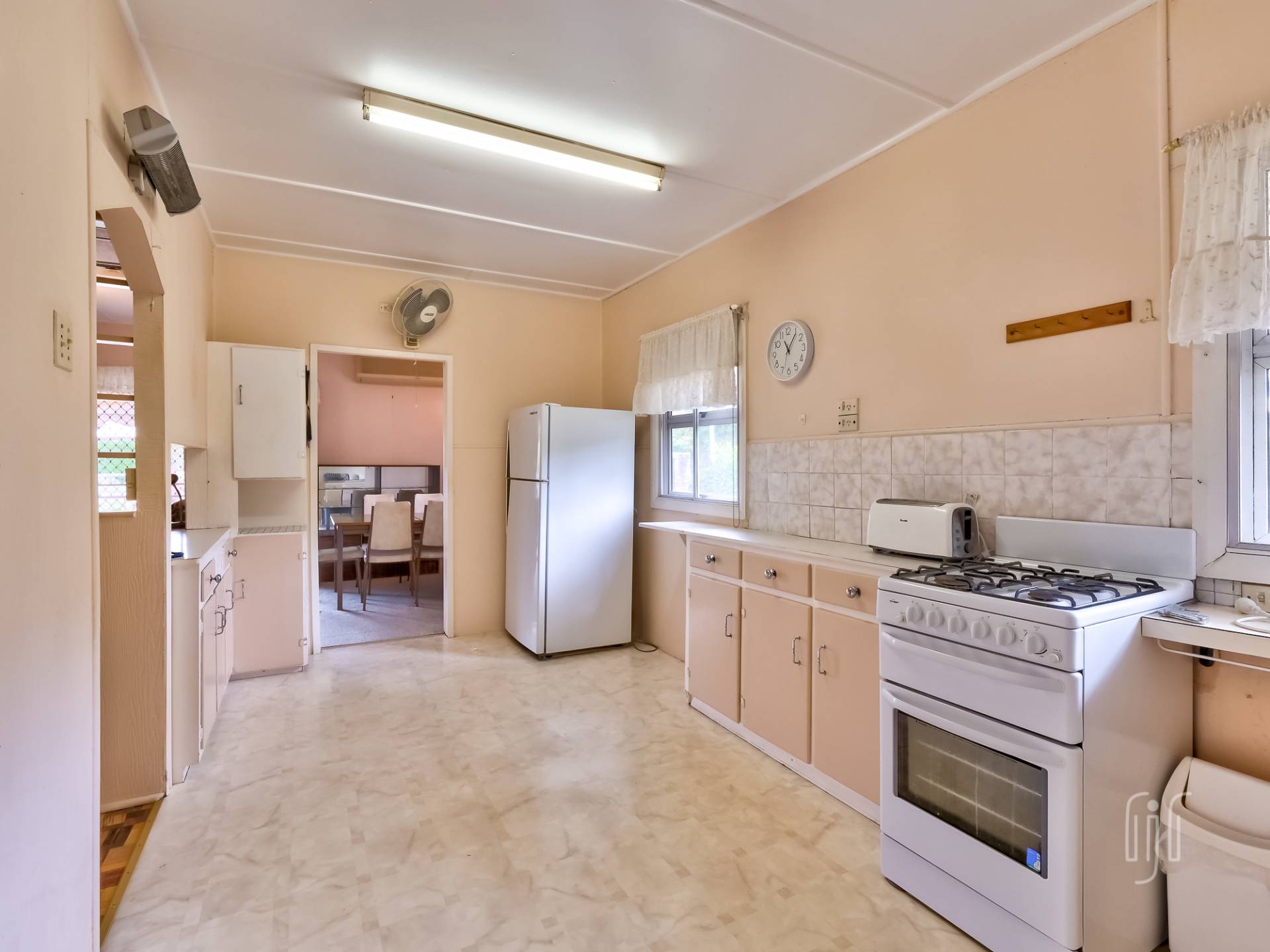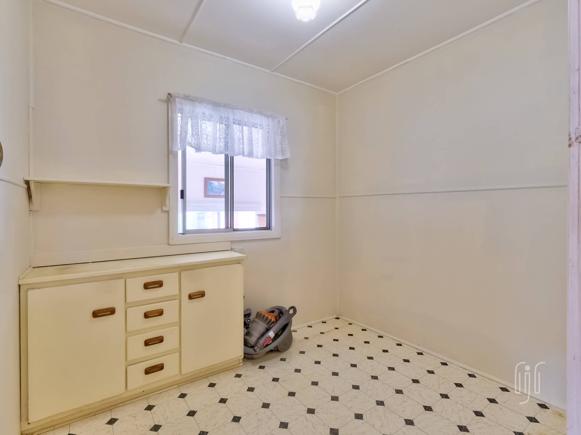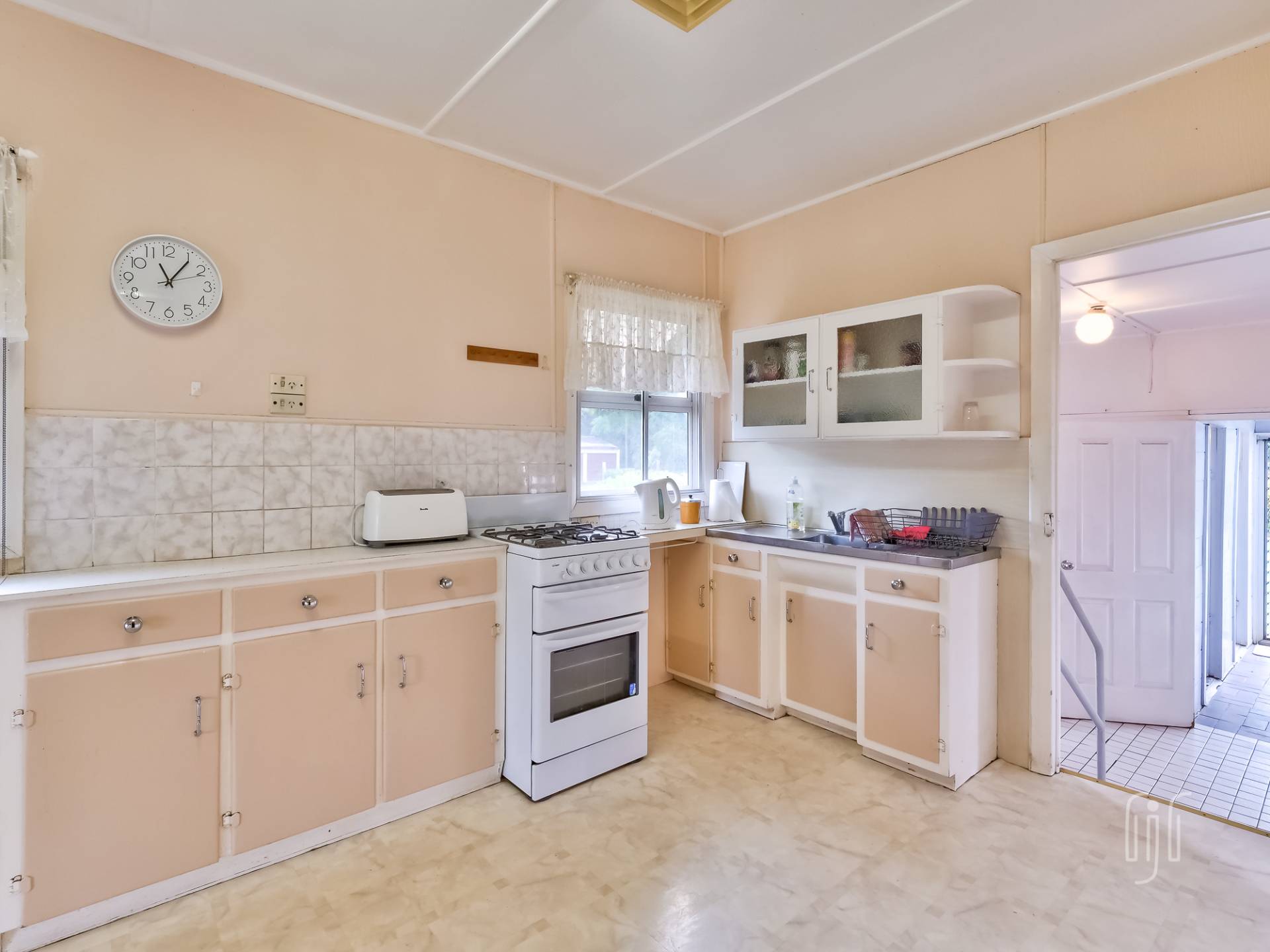 The chamfer board clad house has a characteristic front veranda that gives access to the home either via the front door to the hallway or a sliding door to the lounge/dining. A 60’s built-in wall divider separates the hall from the air conditioned living room. The kitchen is separate and while very original, is large enough to be eat-in style. There’s gas cooking and plenty of storage options.