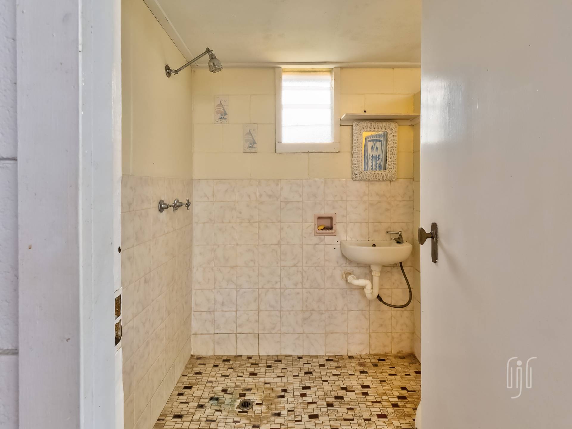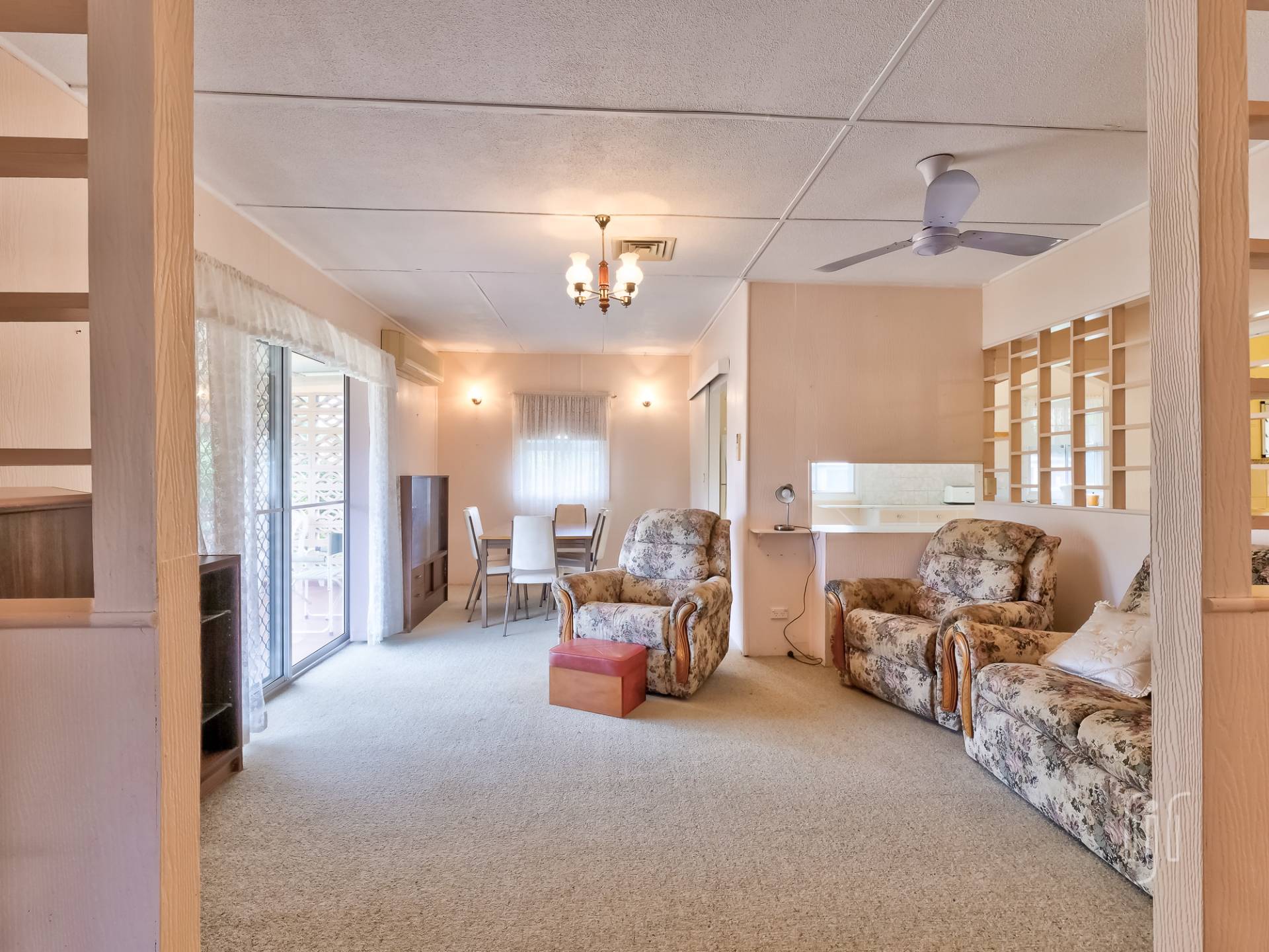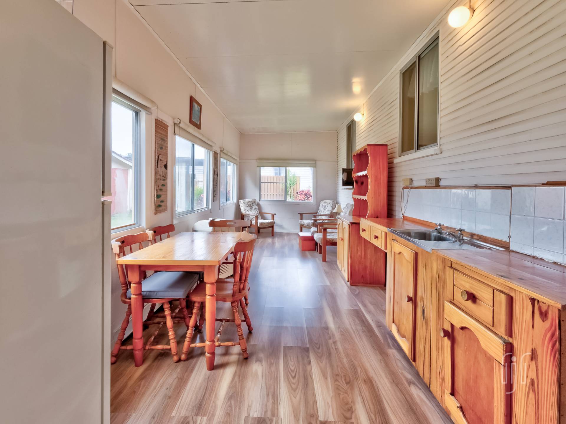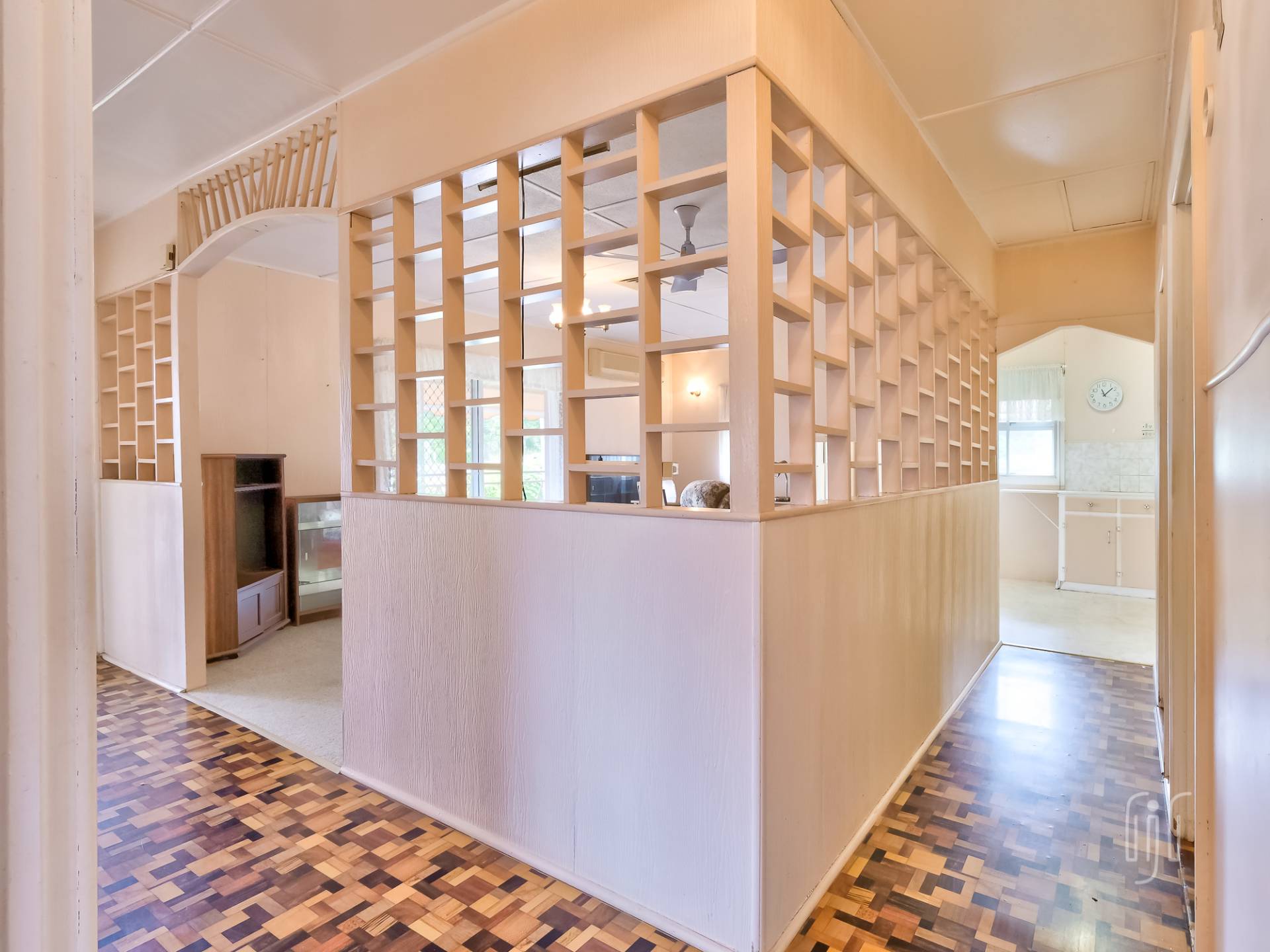 The chamfer board clad house has a characteristic front veranda that gives access to the home either via the front door to the hallway or a sliding door to the lounge/dining. A 60’s built-in wall divider separates the hall from the air conditioned living room. The kitchen is separate and while very original, is large enough to be eat-in style. There’s gas cooking and plenty of storage options.