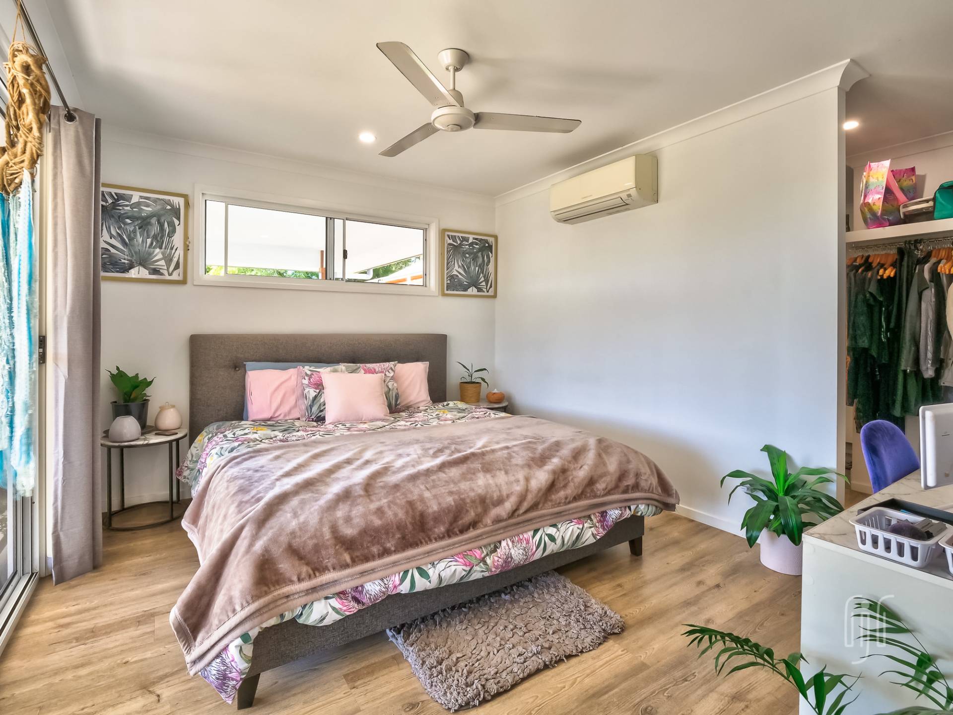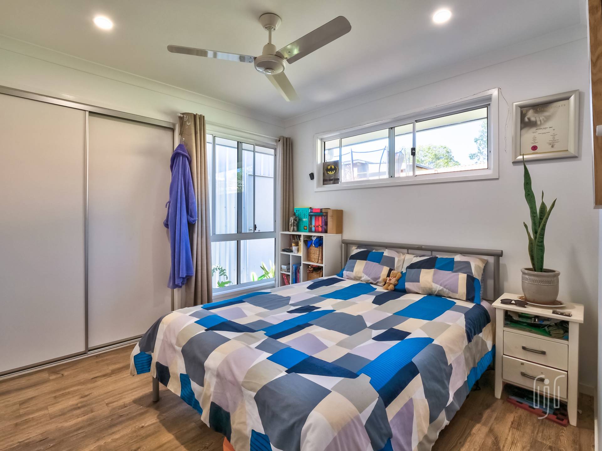 Inside, the home features open plan living that includes spacious lounge and dining areas and a modern kitchen. The kitchen, separated from the lounge by an island bench, has electric cooking, a dishwasher and great storage that includes a pantry. The living area is air conditioned … the whole house has ceiling fans and timber-look vinyl floorcoverings.