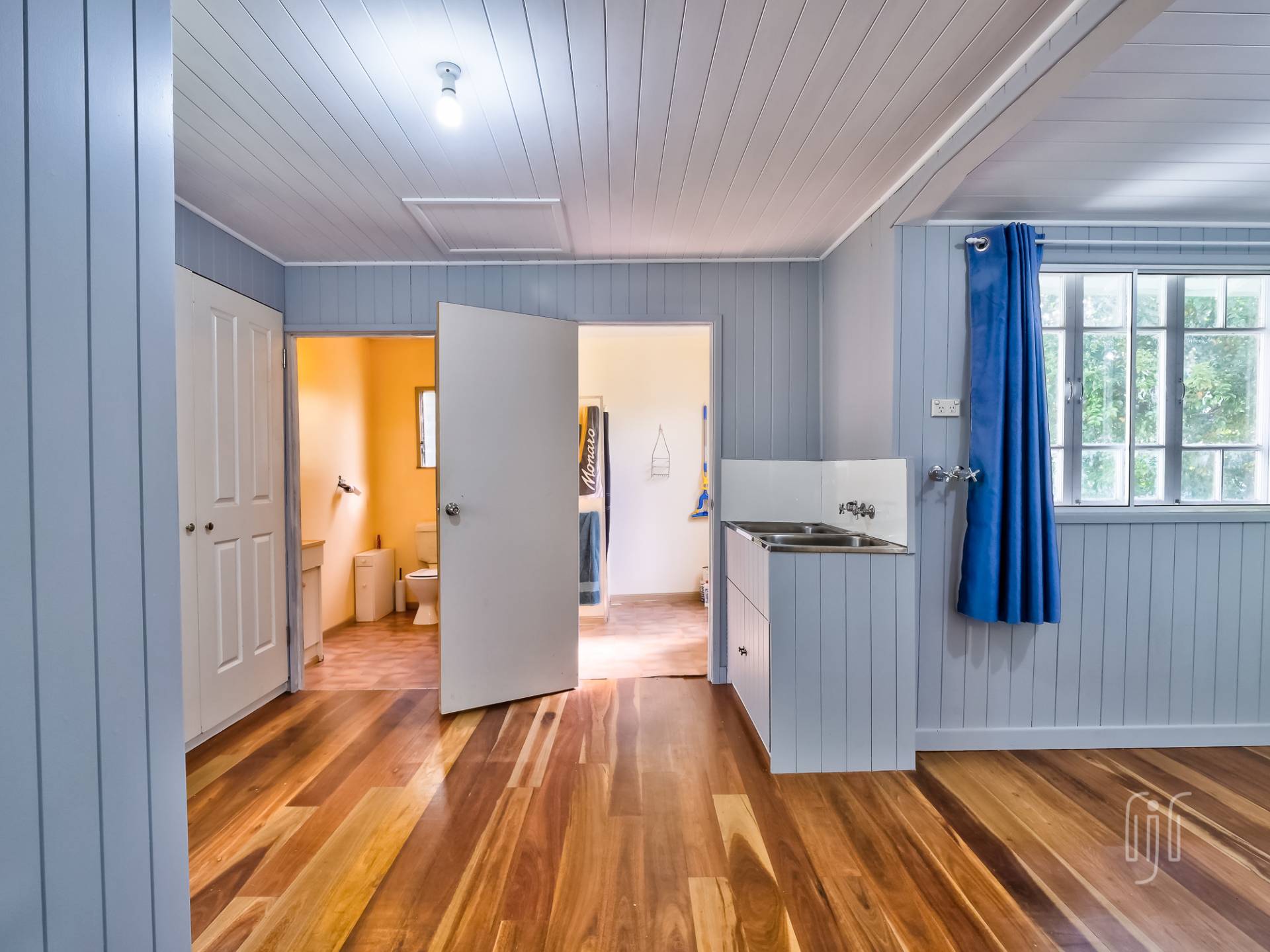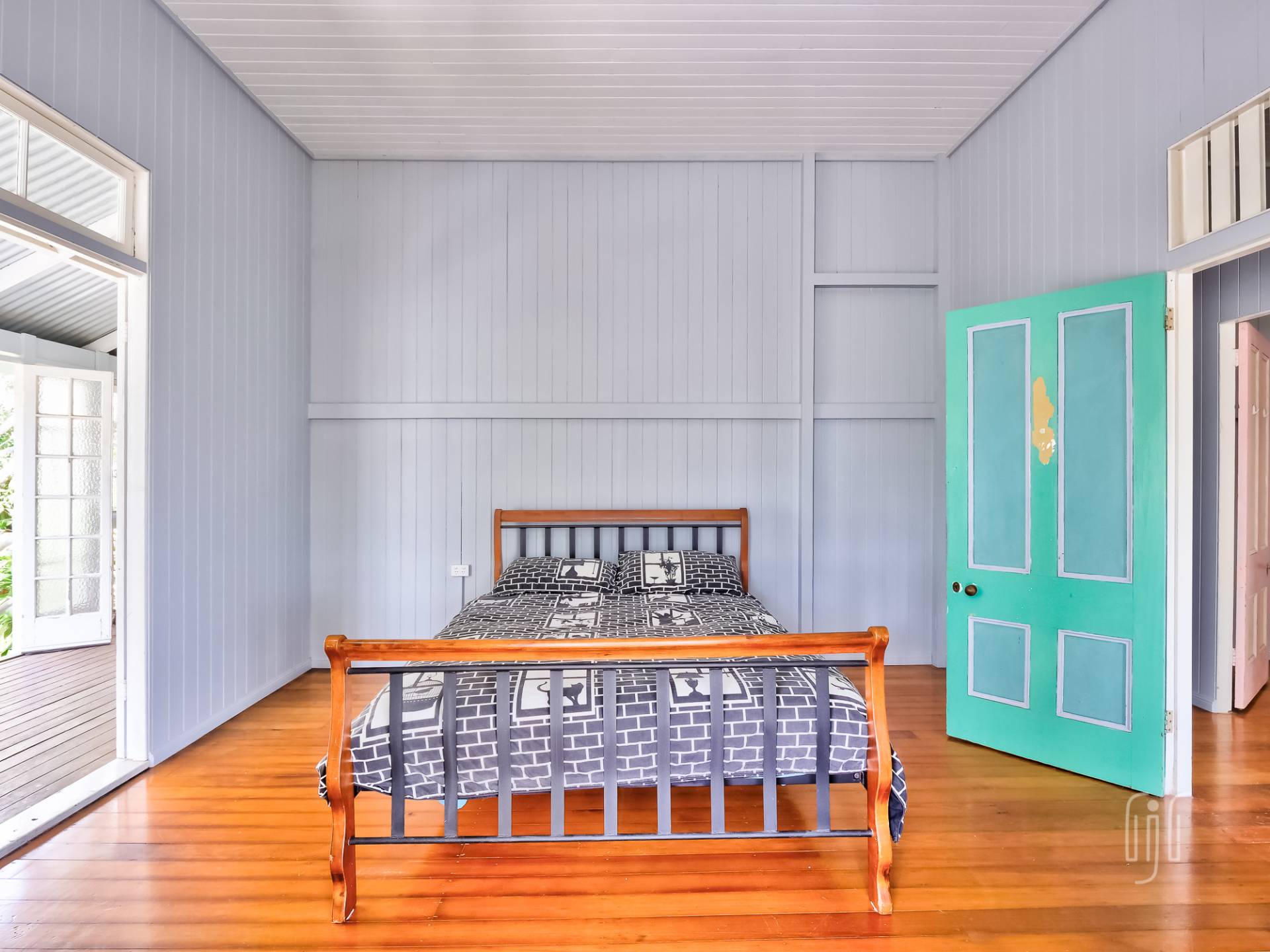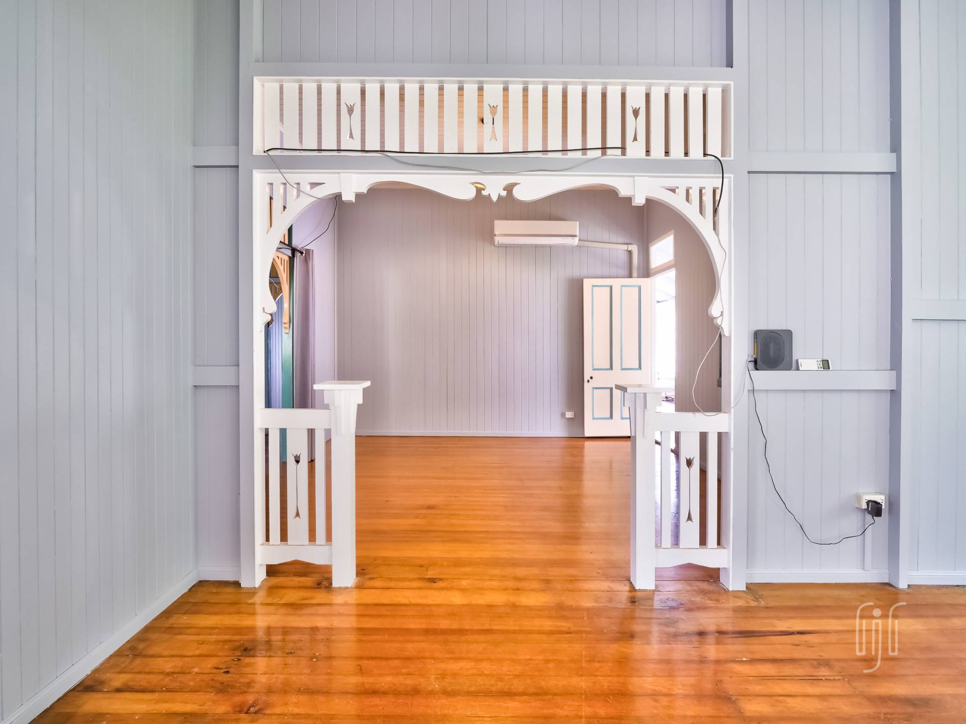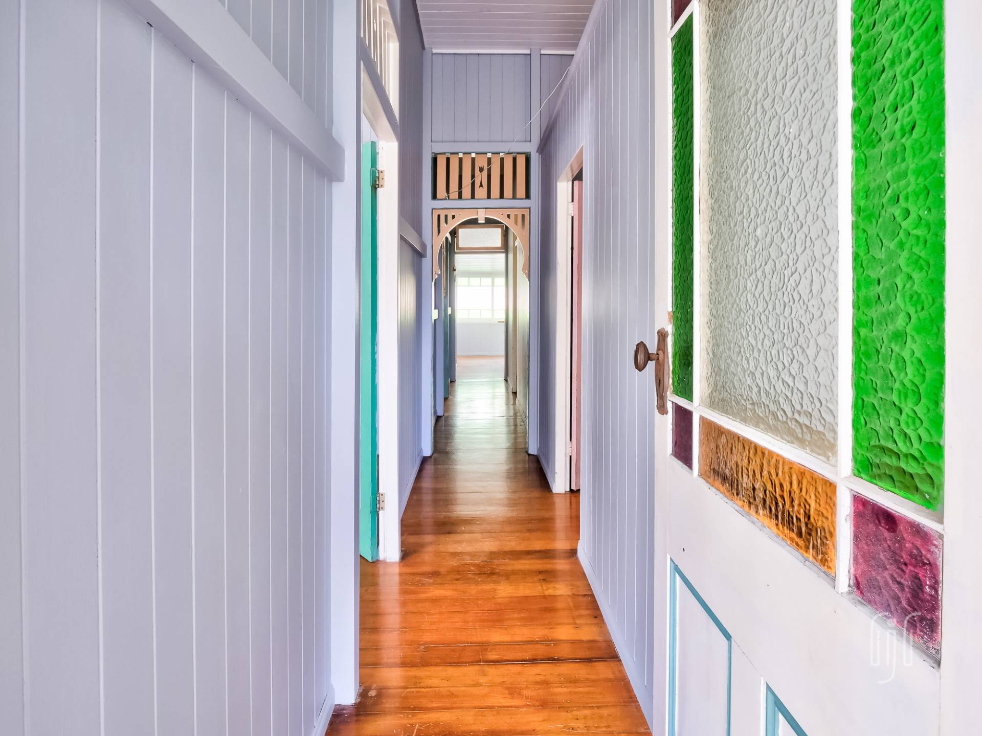 Queenslanders also have a central hallway. Here, it gives access to the living area and kitchen, as well as three of the five bedrooms. The home has the usual Queenslander features that include timber floors, and period windows, doors & trims.