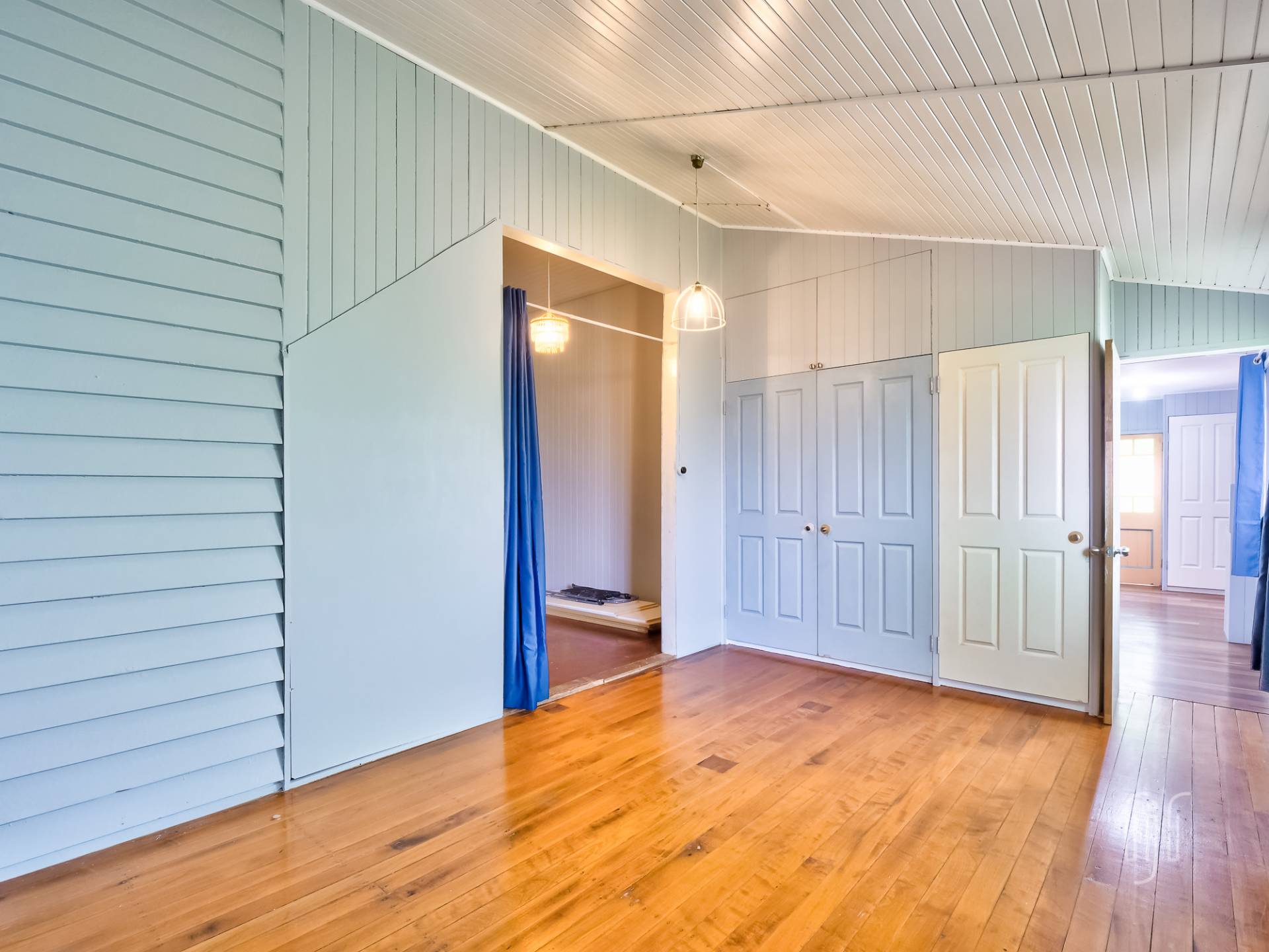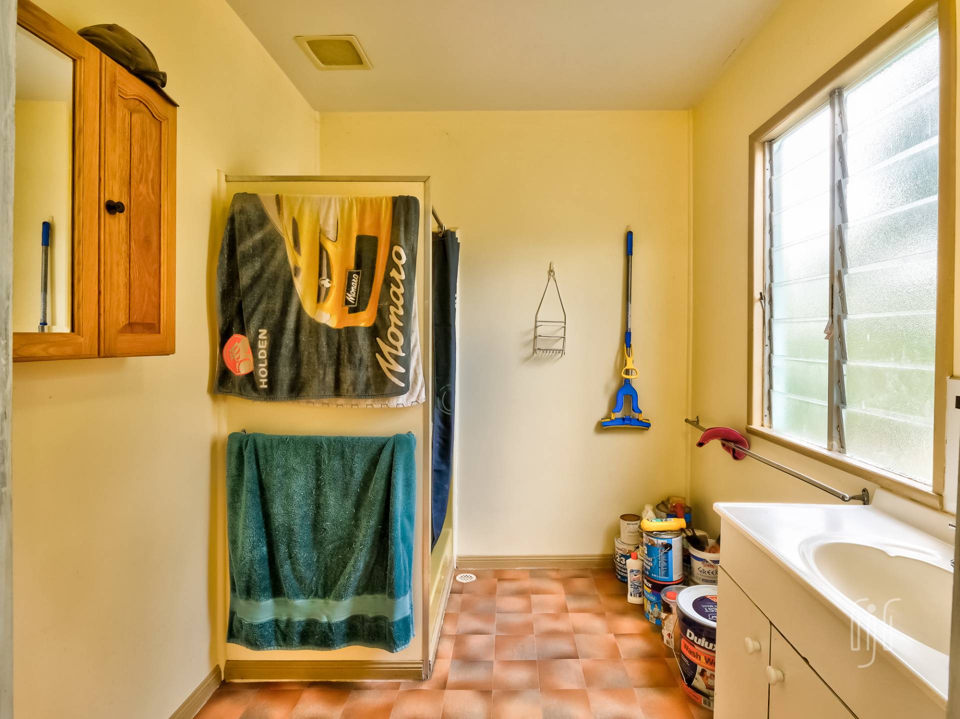 The living room is divided into two rooms, one air conditioned, both with external access. The kitchen has a freestanding gas cooker, a dishwasher, plenty of storage and a breakfast bar. There are five bedrooms in total, and one bathroom with a separate toilet. There is a covered entertaining area at the rear, room for storage and vehicle parking under the house, and solar power back to the grid.