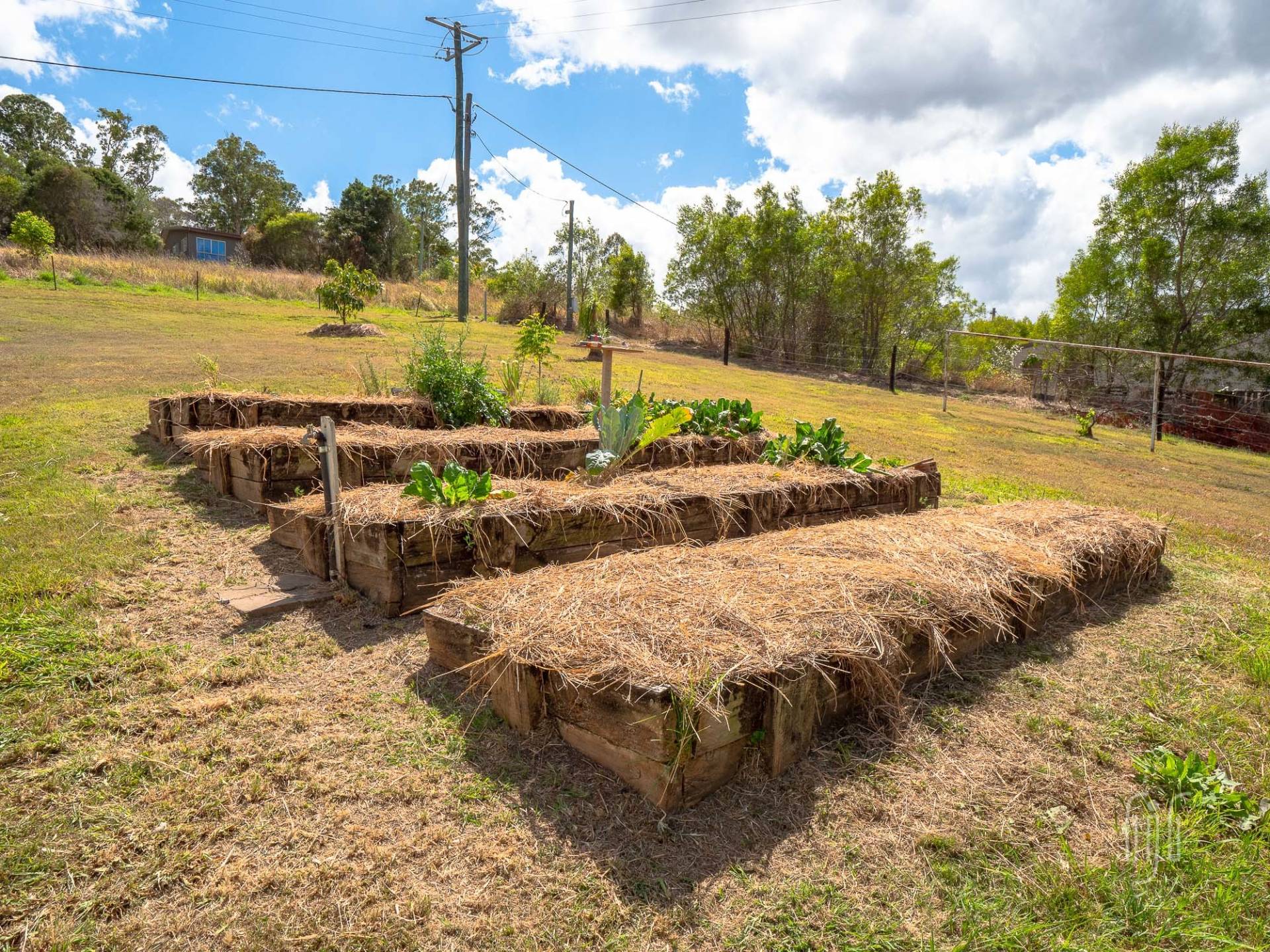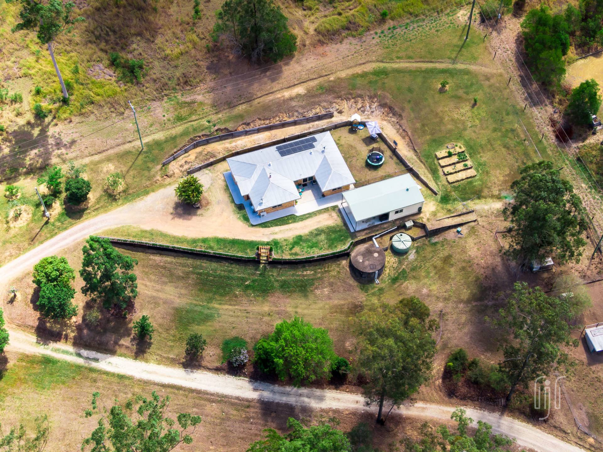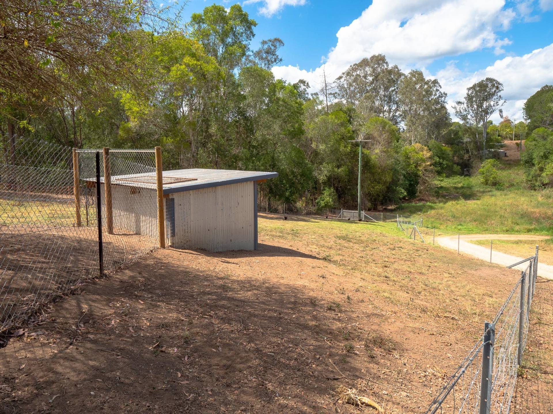 The adjacent garage is multi purpose … 2 bays enclosed, 2 bays open carport. It caters for 4 vehicles if necessary. When you are in the country, with plenty of room, you need a veggie garden and some chooks! Here, there is a great veggie garden and the chooks are well and truly covered. A seasonal creek passes through the property with some creek flats on the lower side (currently home to some goats). Property services include good tank water storage and solar power (back to the grid).