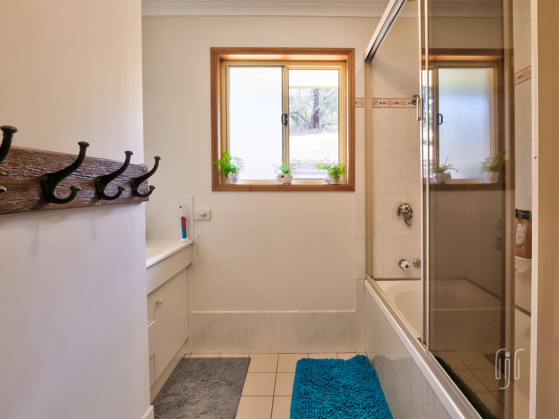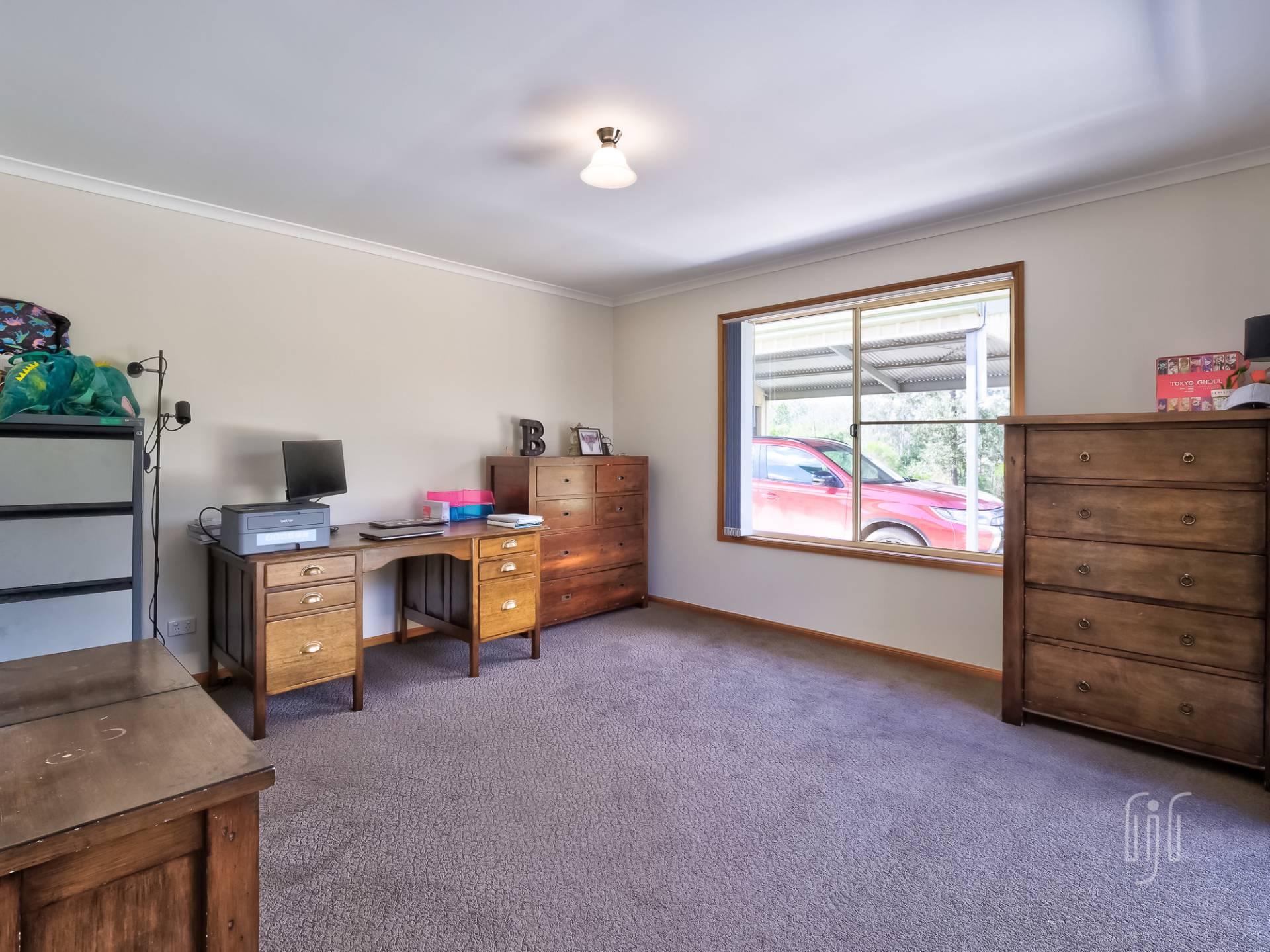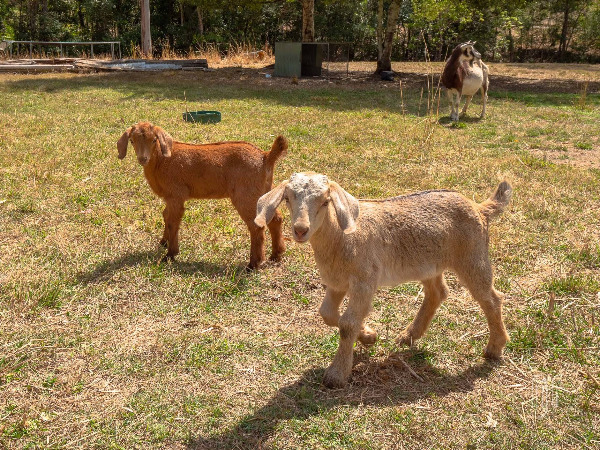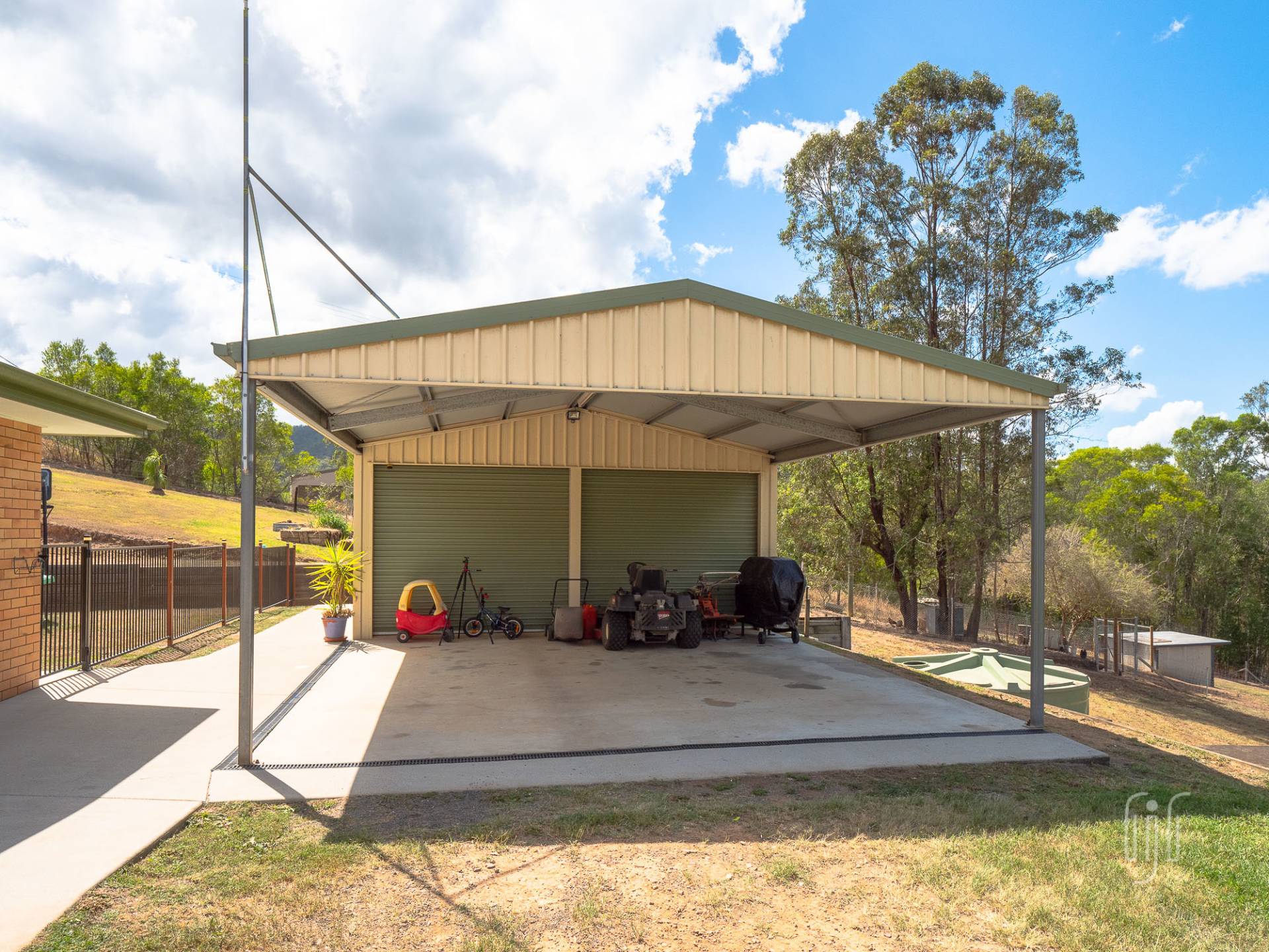 The adjacent garage is multi purpose … 2 bays enclosed, 2 bays open carport. It caters for 4 vehicles if necessary. When you are in the country, with plenty of room, you need a veggie garden and some chooks! Here, there is a great veggie garden and the chooks are well and truly covered. A seasonal creek passes through the property with some creek flats on the lower side (currently home to some goats). Property services include good tank water storage and solar power (back to the grid).