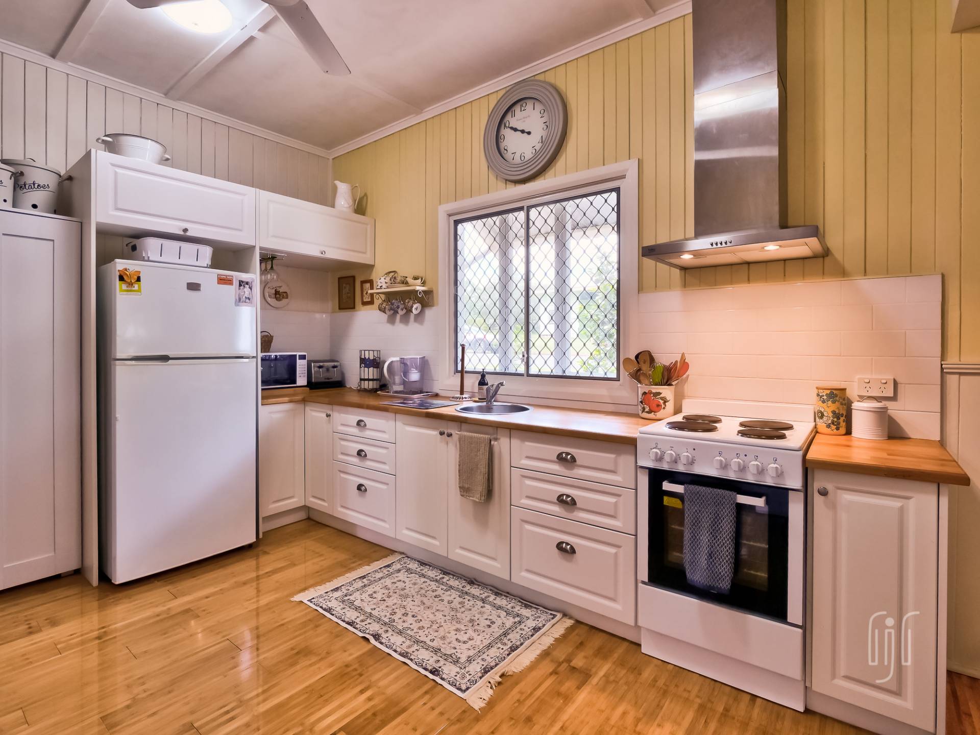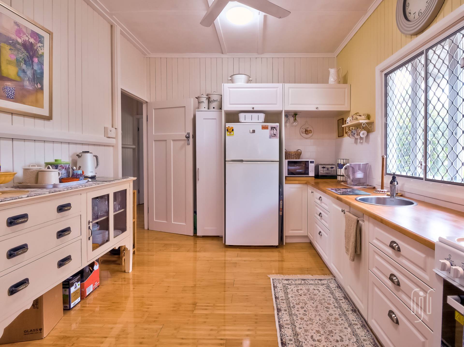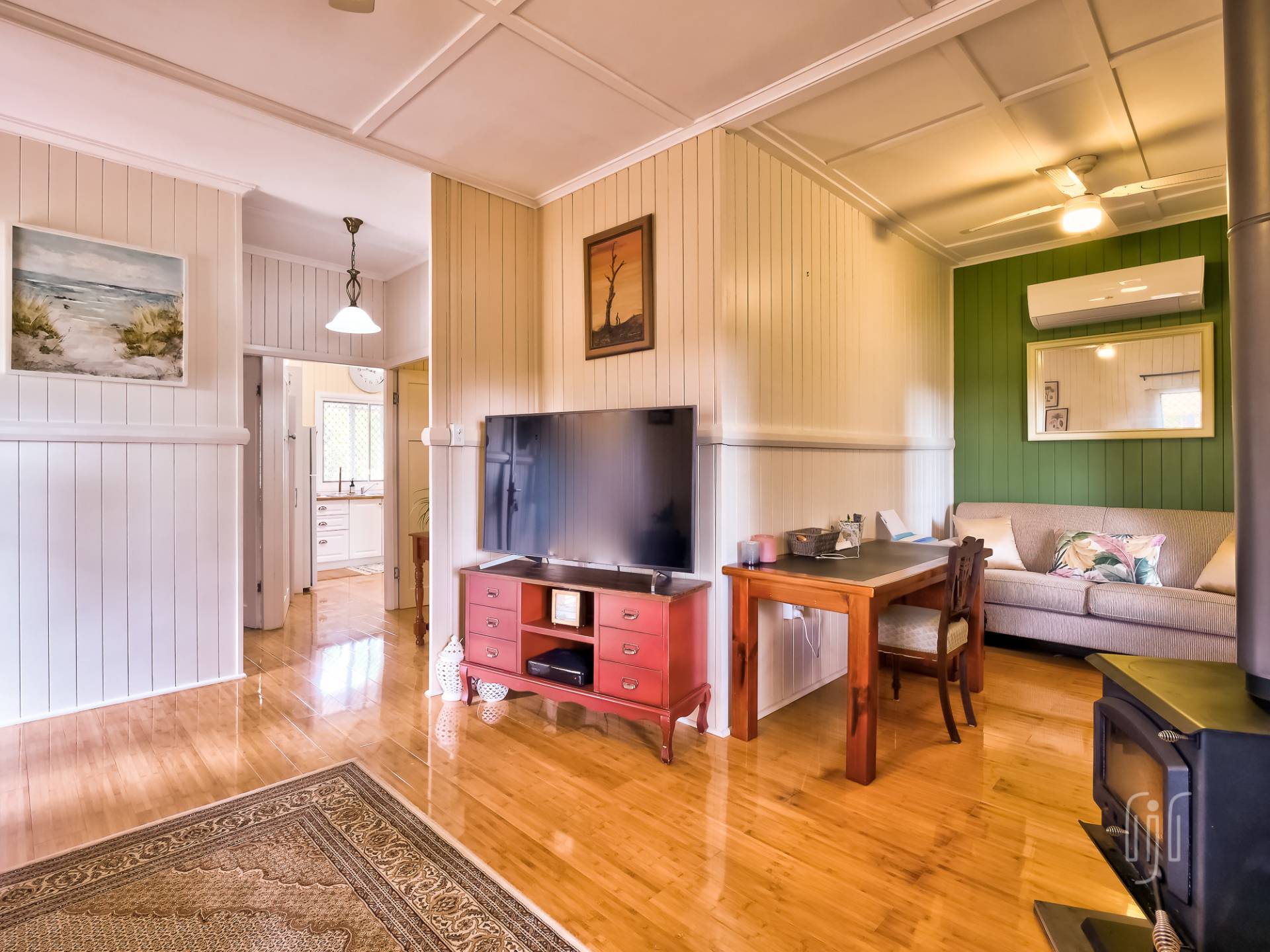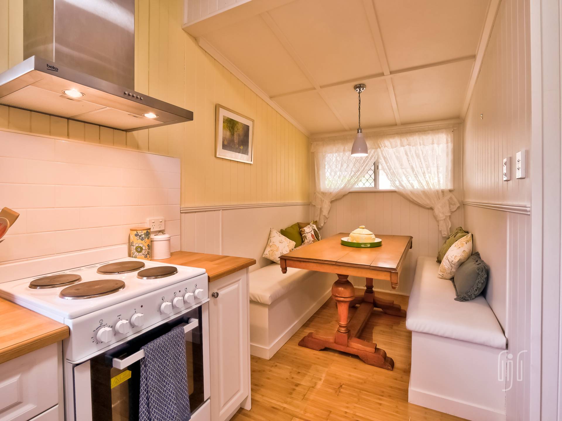 You enter the cottage from a well-proportioned L-shaped veranda to another L-shaped space, the loungeroom! It features air conditioning, slow combustion heating and bamboo flooring. The kitchen-diner features electric cooking, timber benchtops and a built-in dining booth.