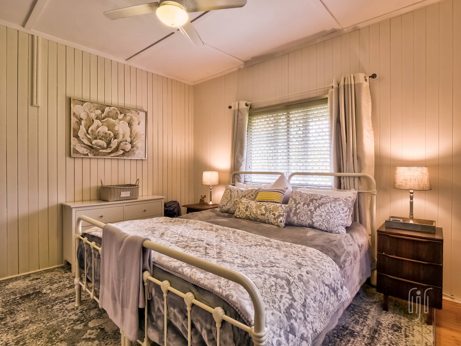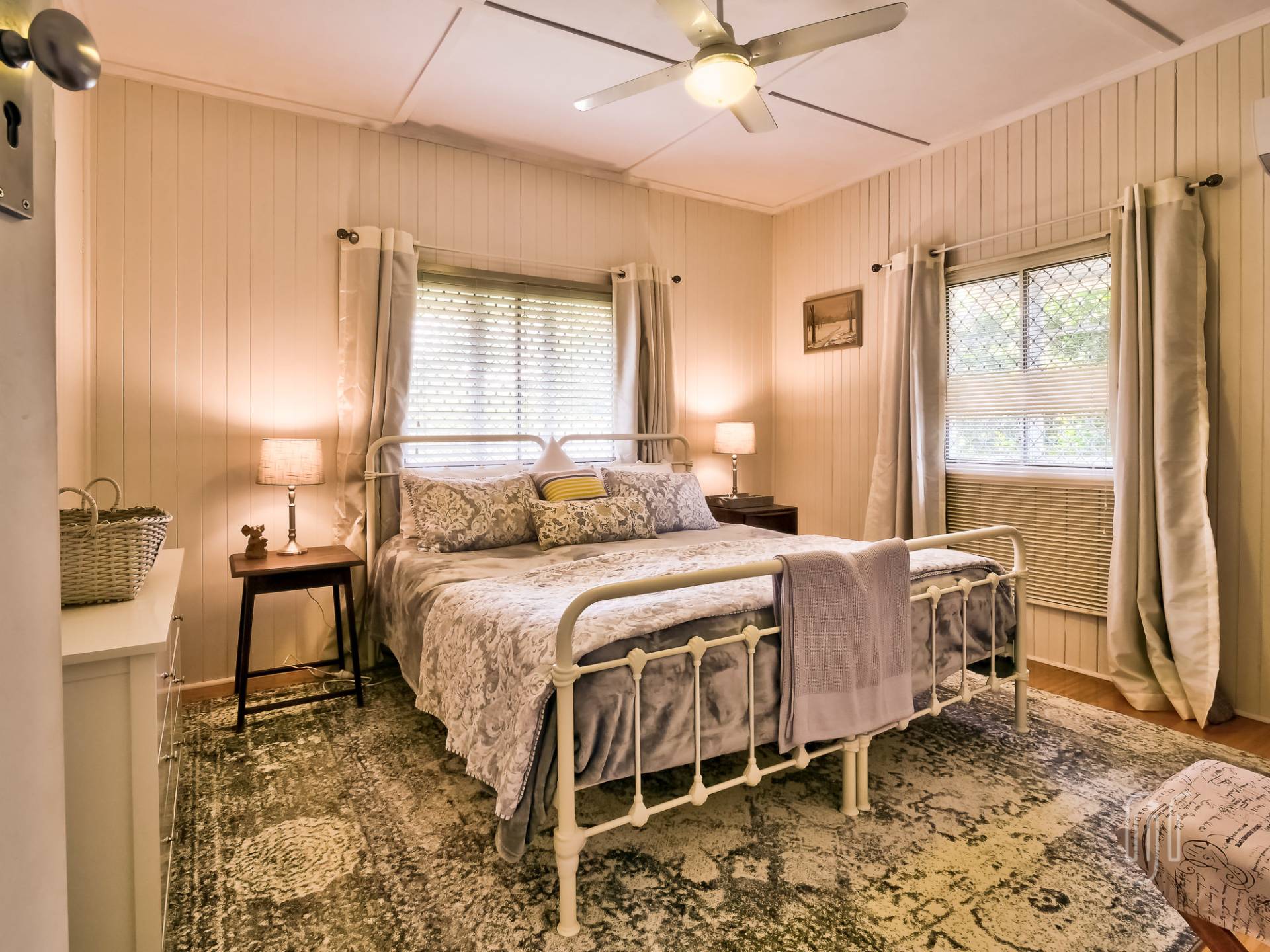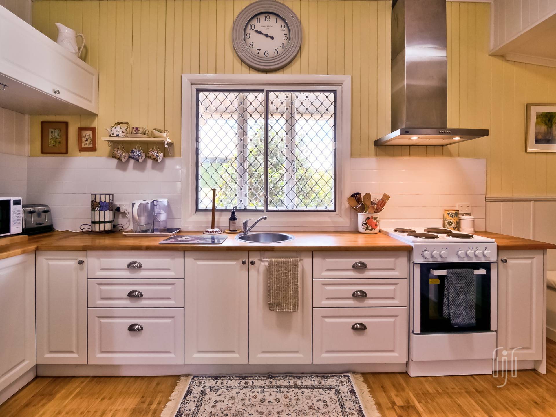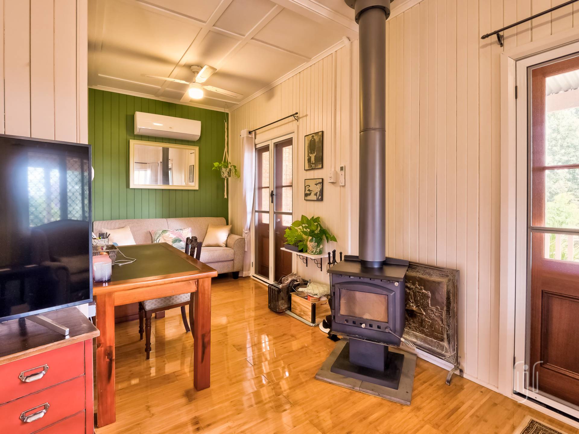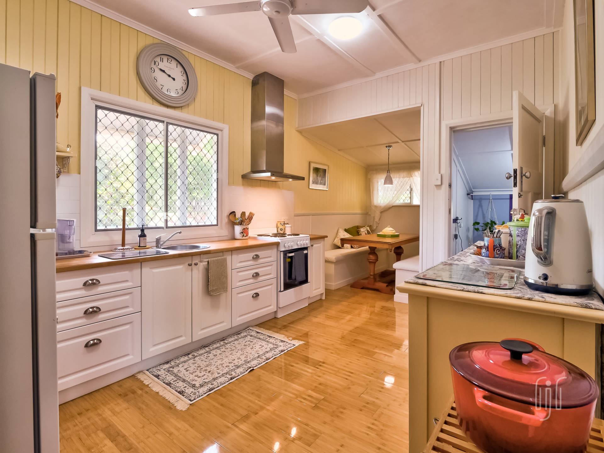 You enter the cottage from a well-proportioned L-shaped veranda to another L-shaped space, the loungeroom! It features air conditioning, slow combustion heating and bamboo flooring. The kitchen-diner features electric cooking, timber benchtops and a built-in dining booth.