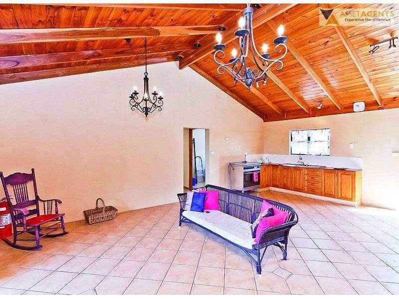 If the main house is stylish, the cottage has a touch of rustic charm. It is a little homestead-like with verandas on two sides of a painted solid block home with an iron roof. A low hedge separates the paved front veranda from the lawns that still have the posts for a great shade sail area. Vaulted pine lined ceilings with exposed beams, chandelier style lights and Mediterranean tiled floors set the scene for an open plan living area that includes a small kitchen. There are 3 bedrooms and 1 bathroom.