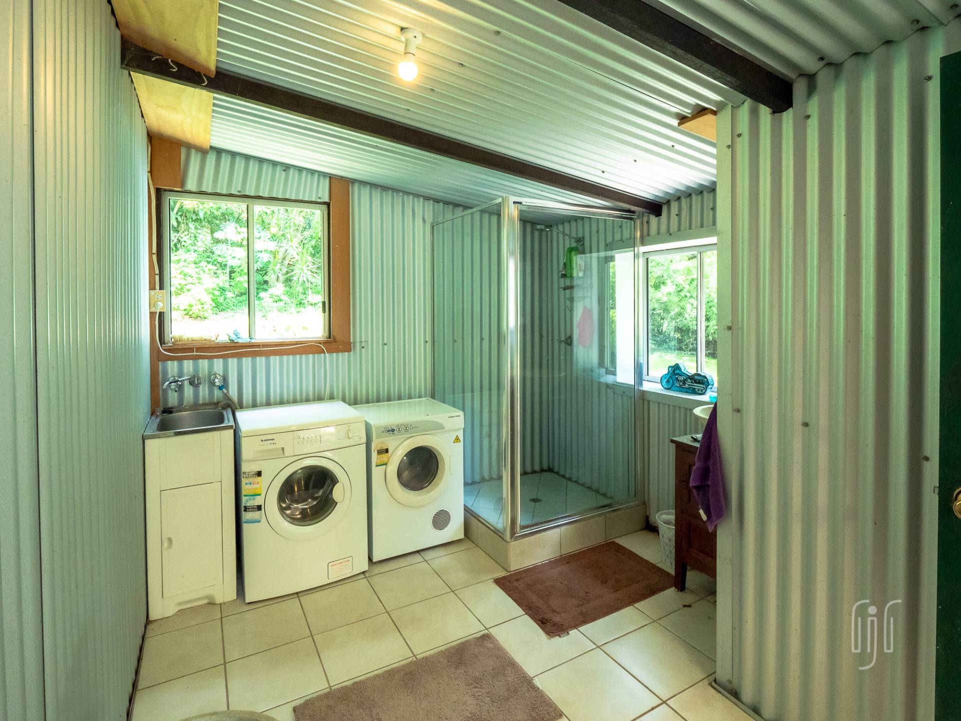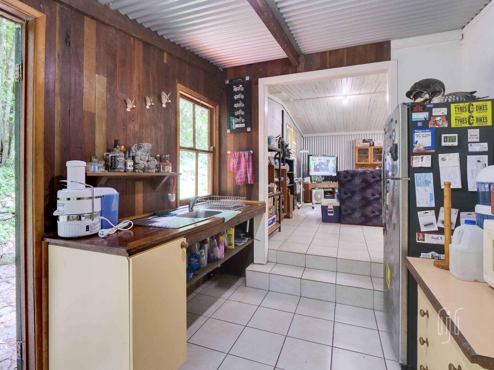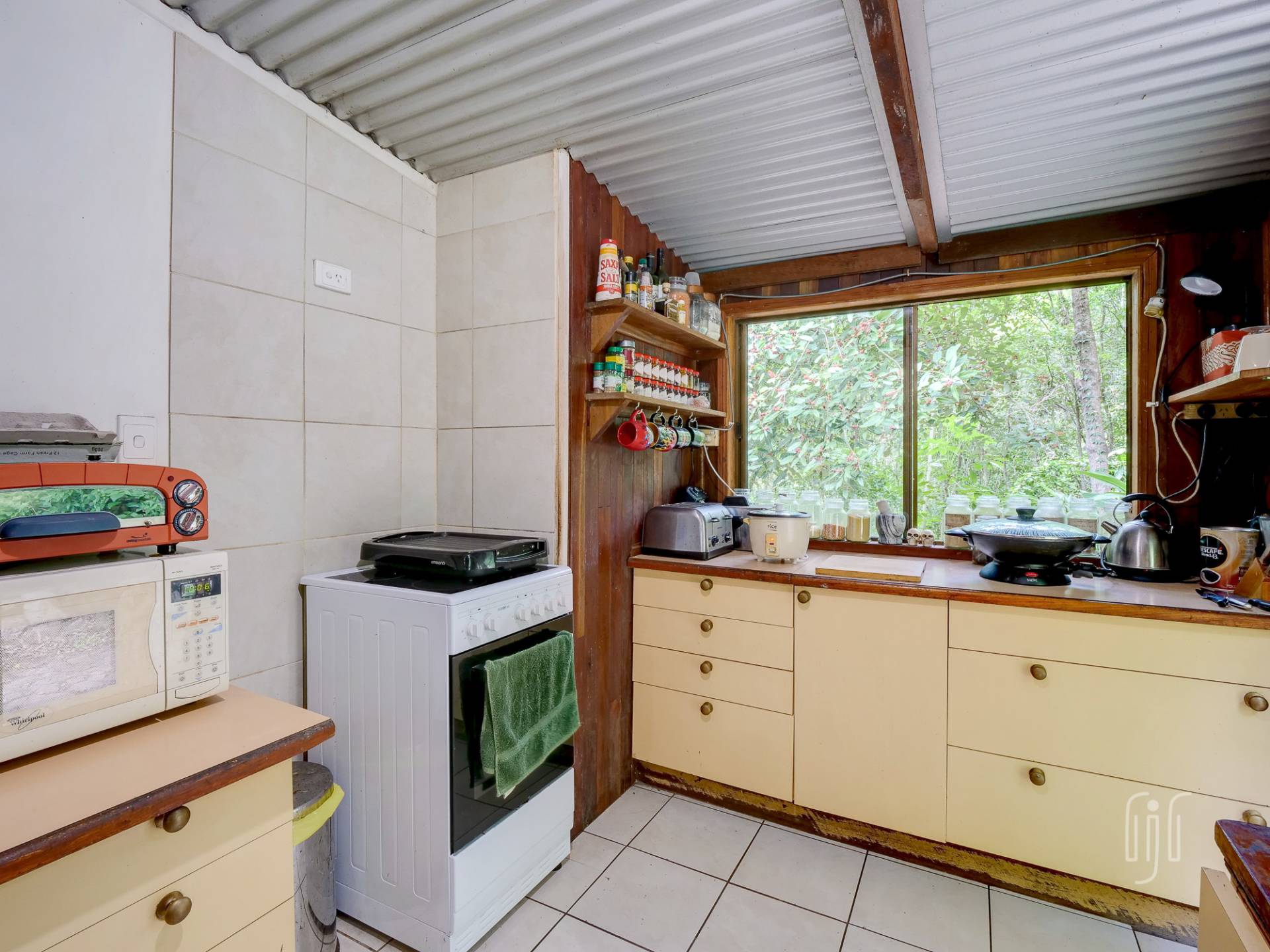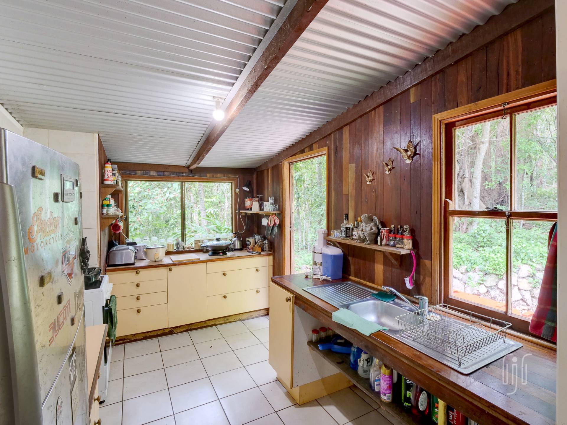 The timber & Colorbond clad cottage is open plan with a large living room at its centre. A shed-construction, the living area has a timber-lined cathedral ceiling, Zincalume feature walls and a tiled floor. Timber & Zincalume are featured right through the cottage. The kitchen, down 2 steps from the lounge, has electric cooking and external access to the rock-paved relaxation area at the rear.