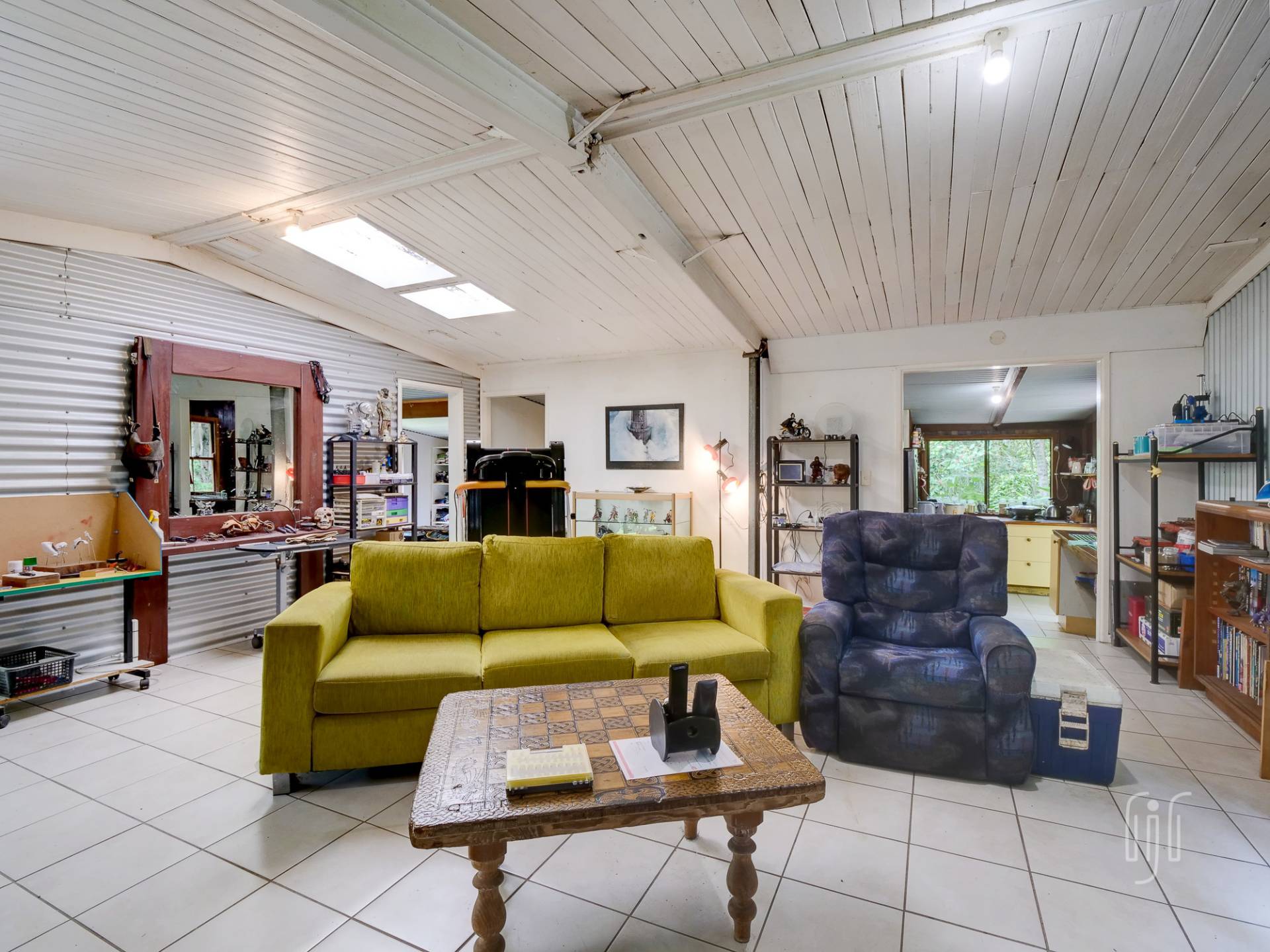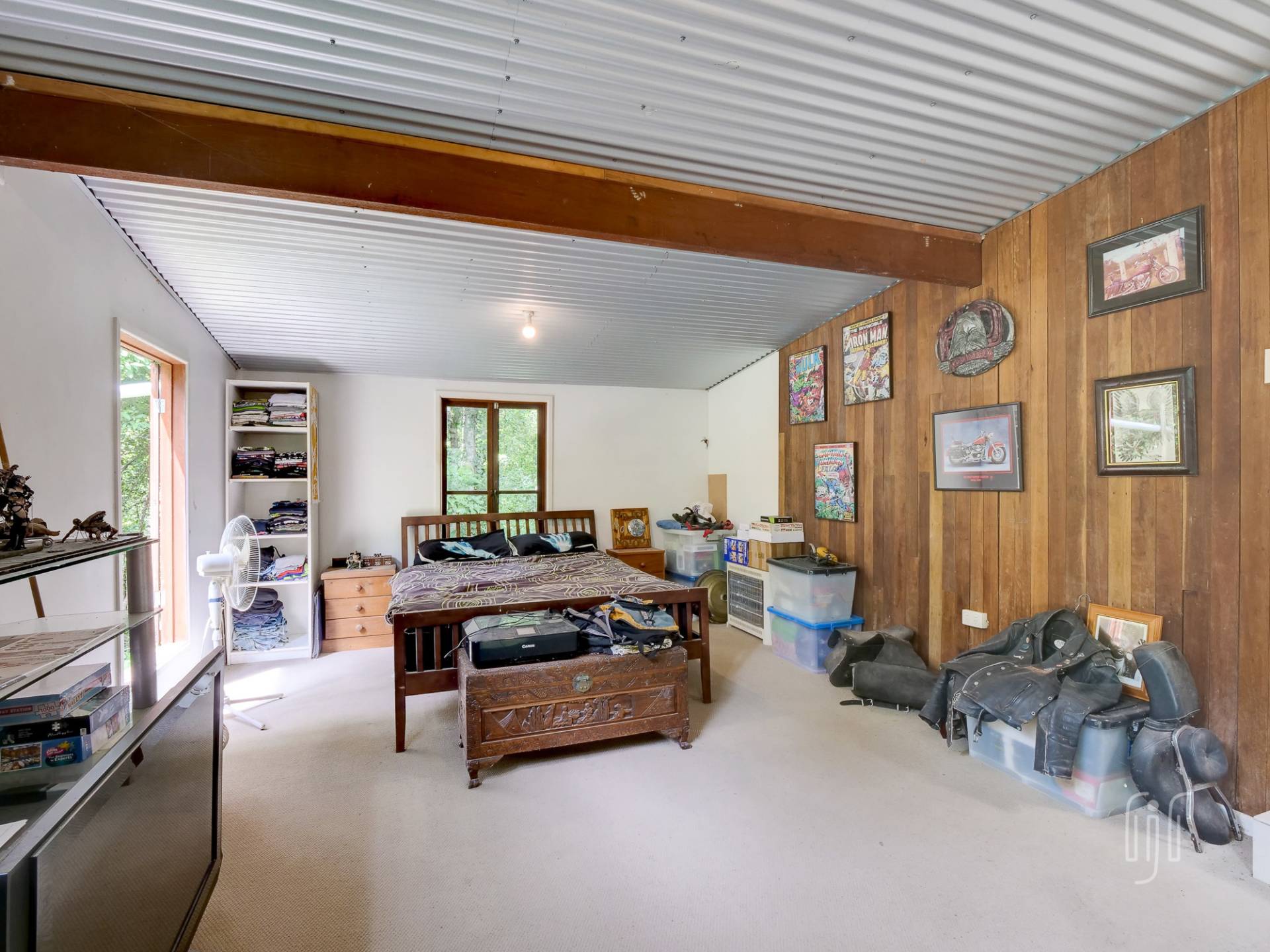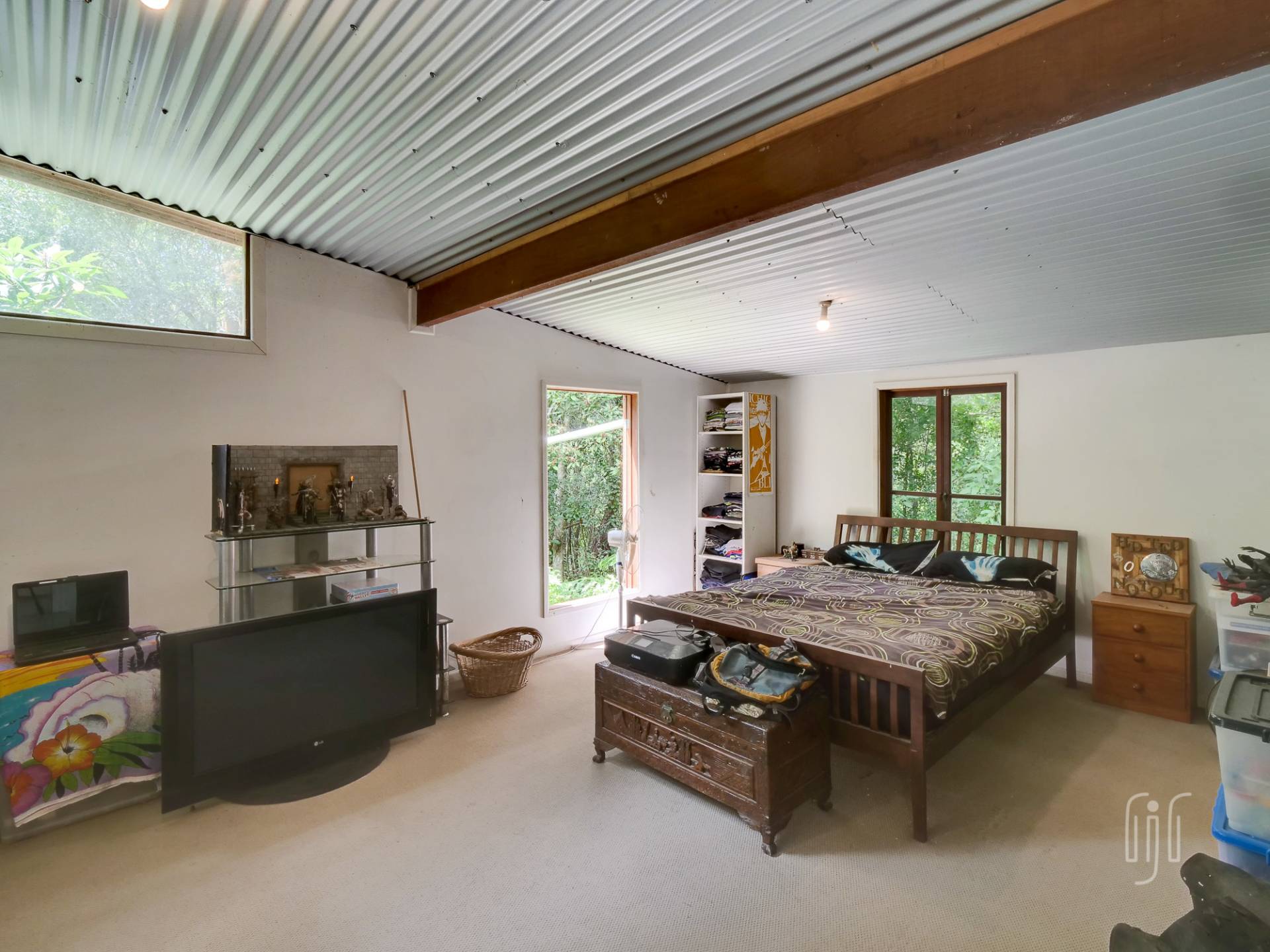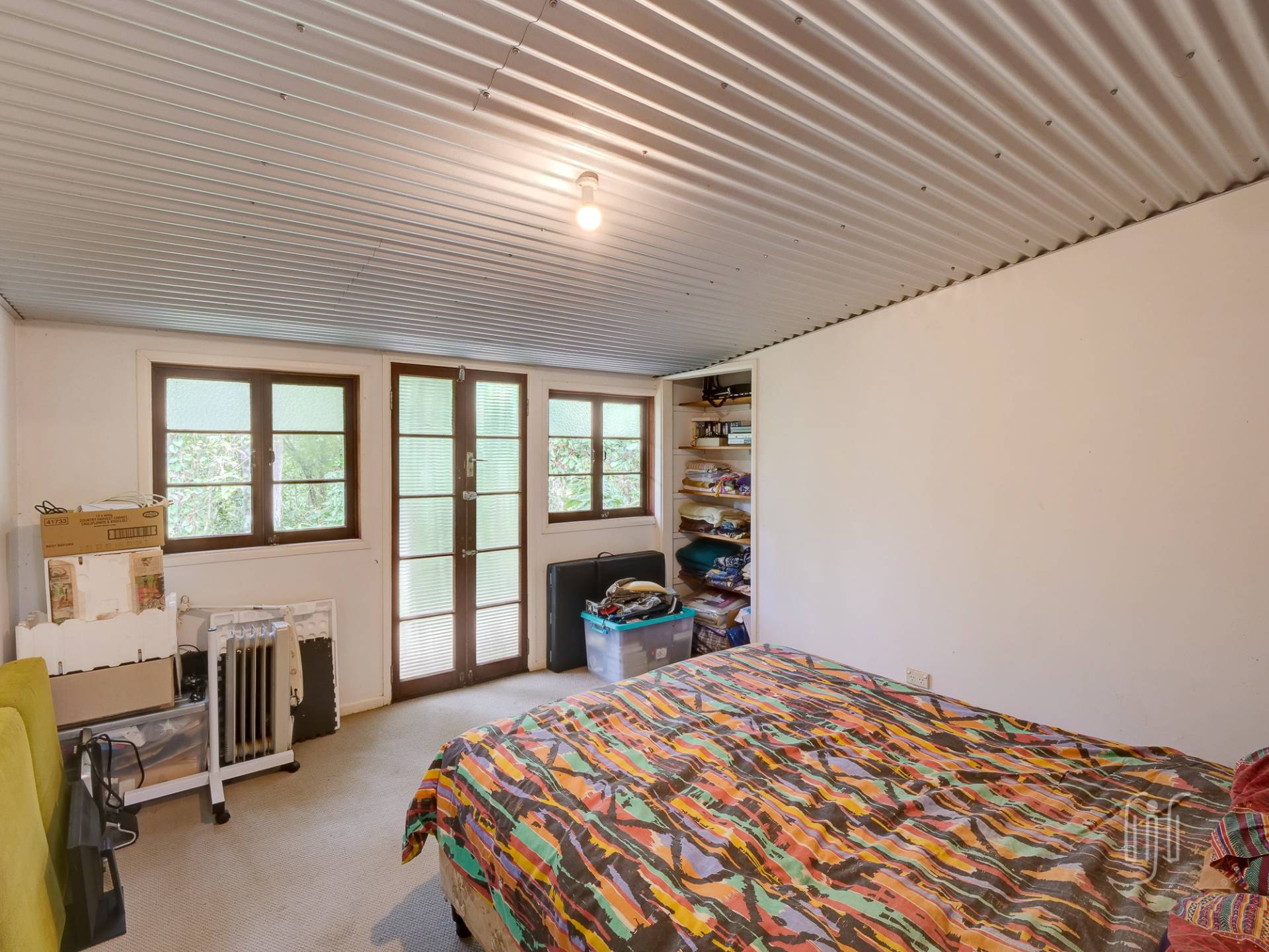 The timber & Colorbond clad cottage is open plan with a large living room at its centre. A shed-construction, the living area has a timber-lined cathedral ceiling, Zincalume feature walls and a tiled floor. Timber & Zincalume are featured right through the cottage. The kitchen, down 2 steps from the lounge, has electric cooking and external access to the rock-paved relaxation area at the rear.