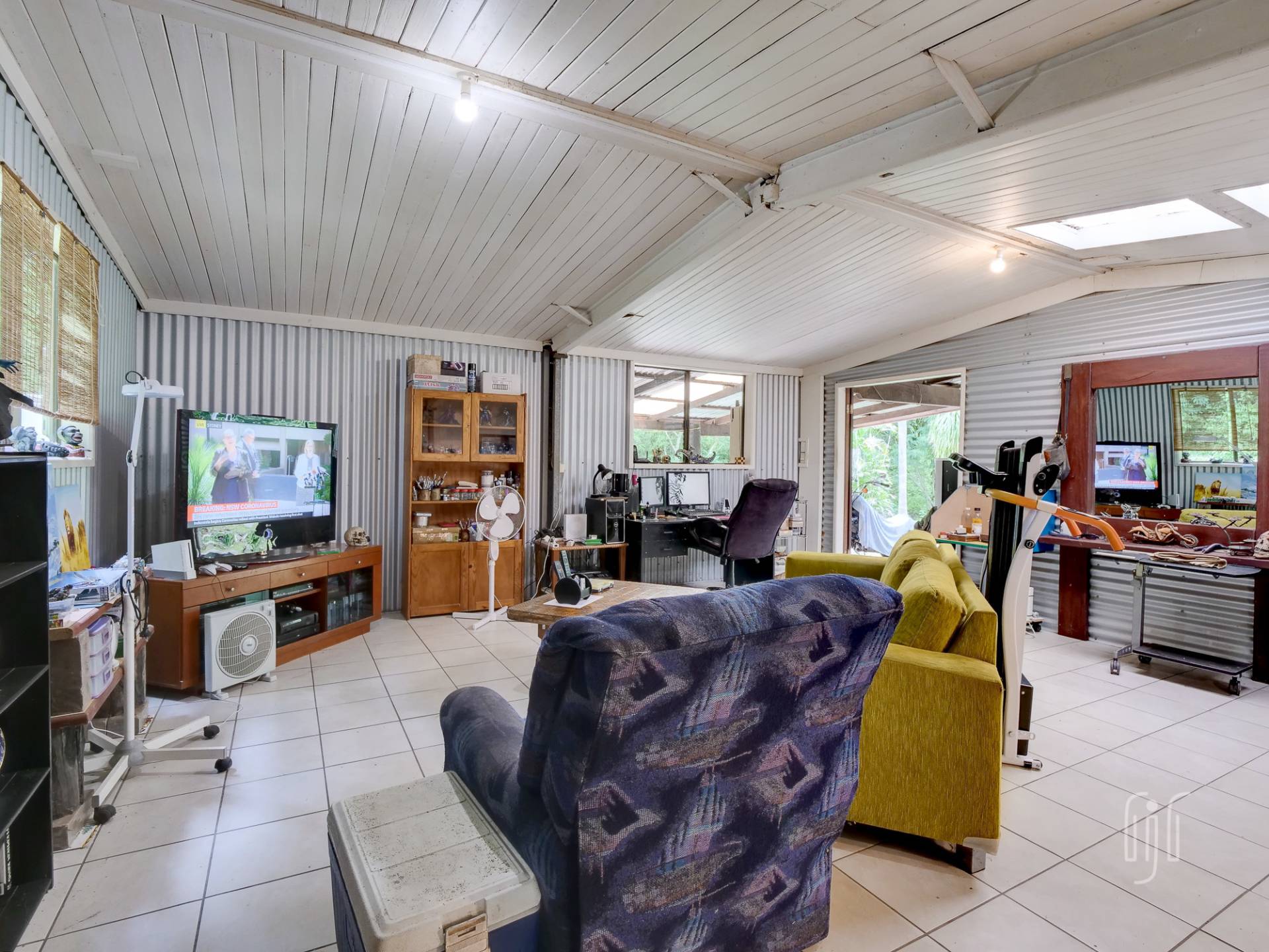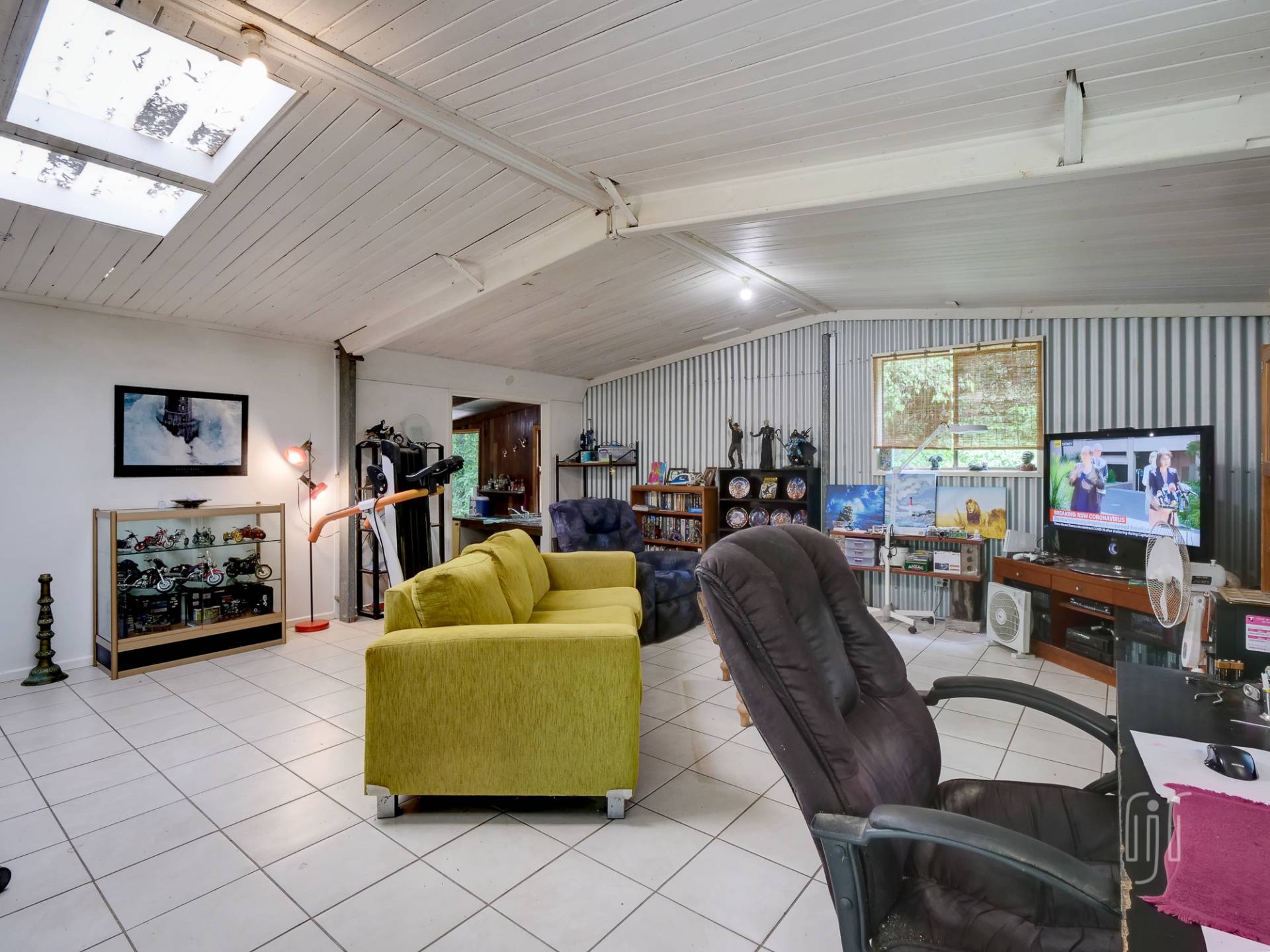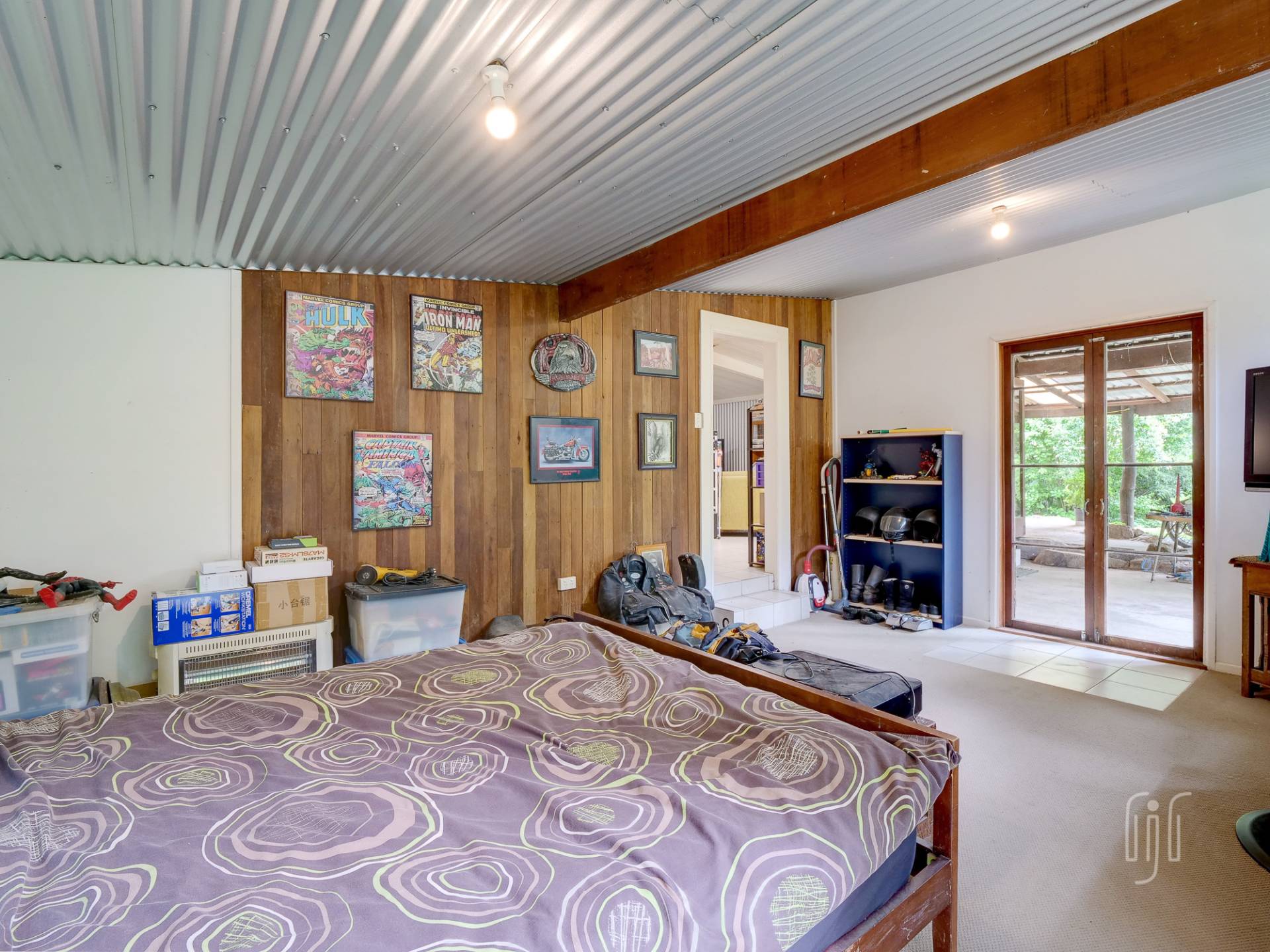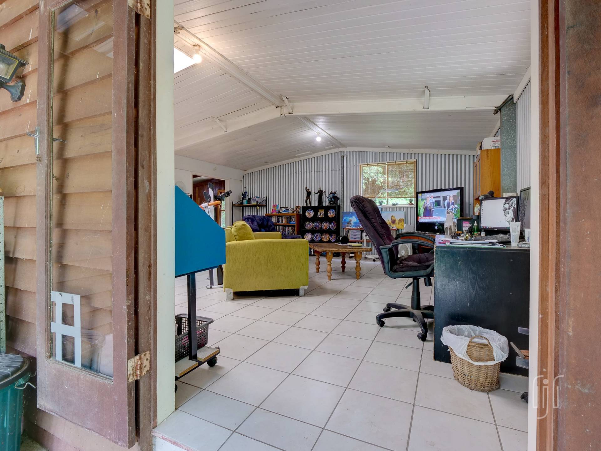 The timber & Colorbond clad cottage is open plan with a large living room at its centre. A shed-construction, the living area has a timber-lined cathedral ceiling, Zincalume feature walls and a tiled floor. Timber & Zincalume are featured right through the cottage. The kitchen, down 2 steps from the lounge, has electric cooking and external access to the rock-paved relaxation area at the rear.