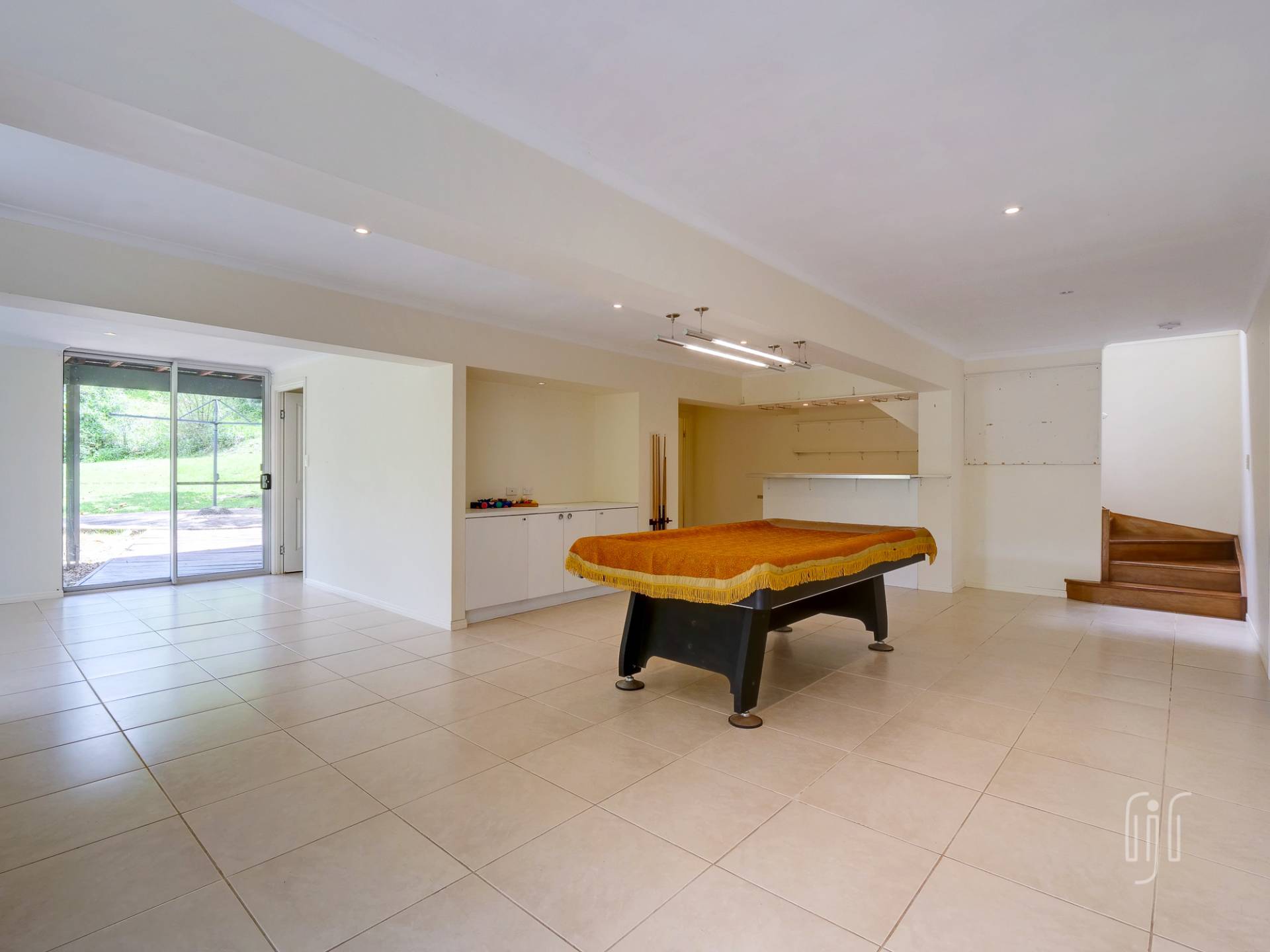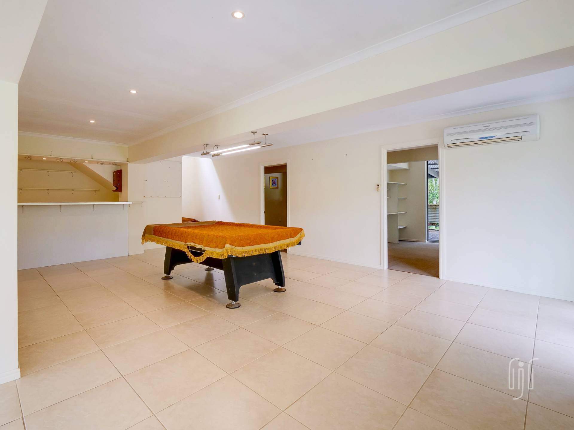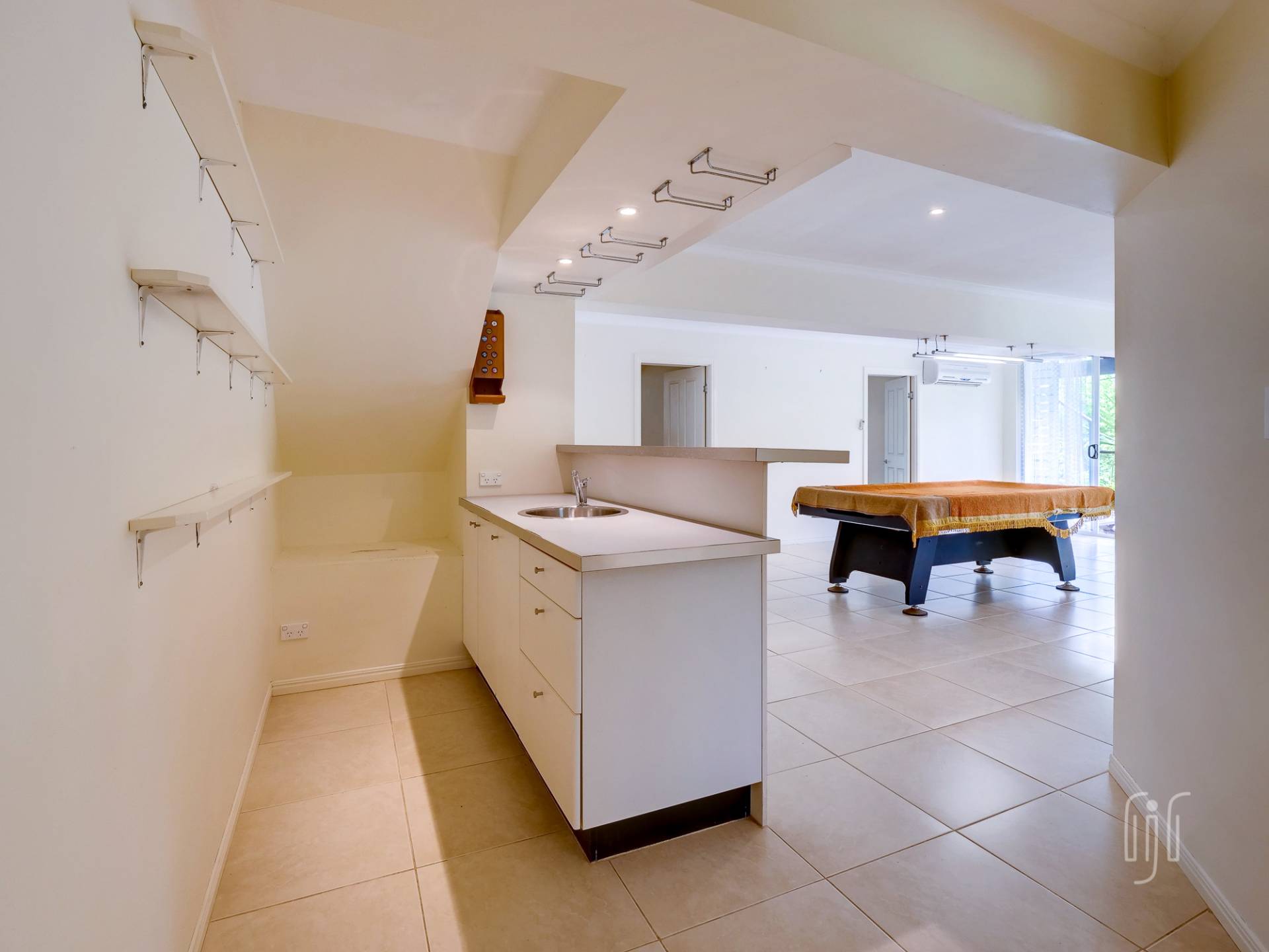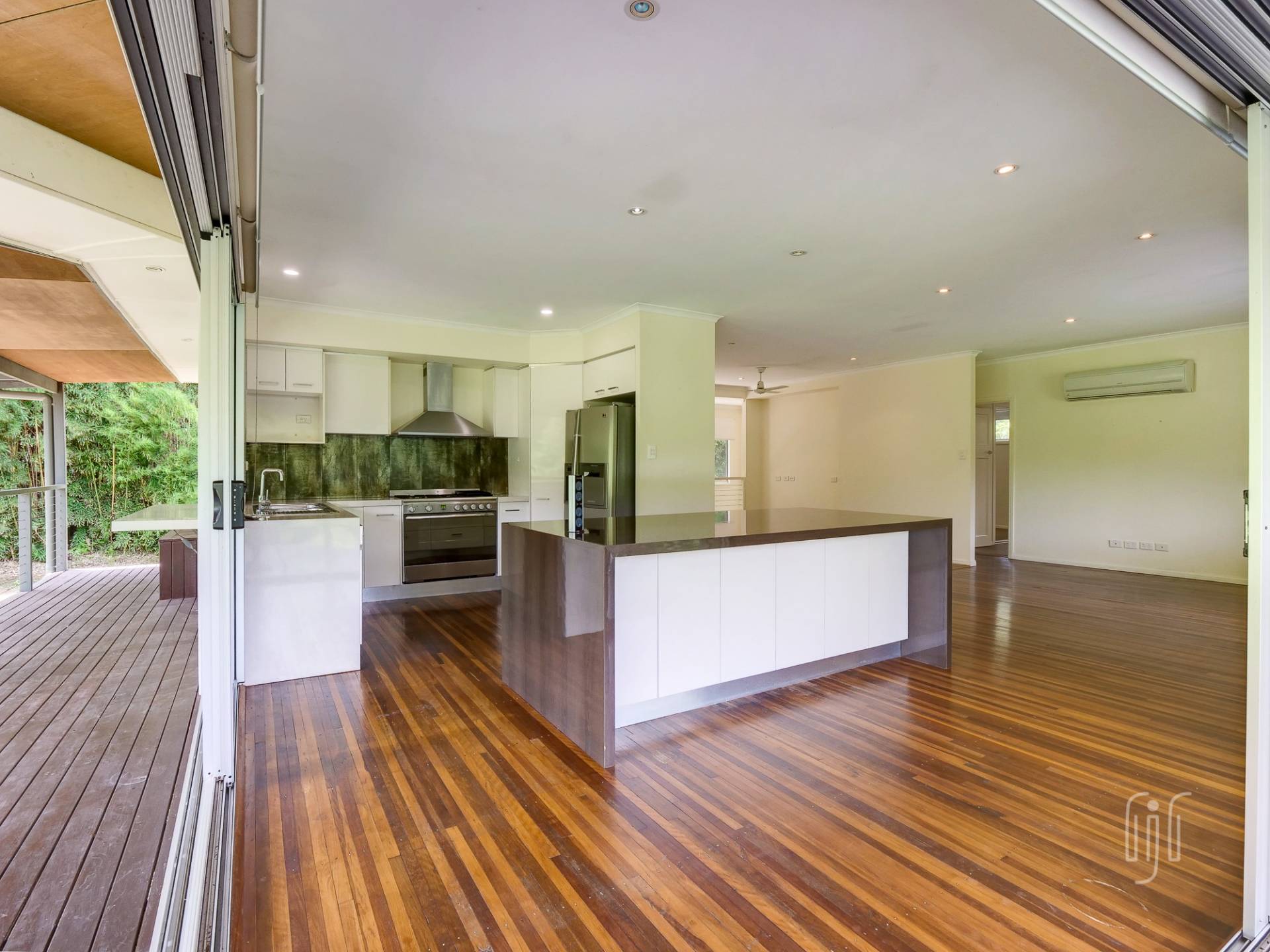 The covered front deck is an important part of the living space where sliding doors open up so there is a seamless line between the inside and the outside. The top level of the home is for everyday living. It includes a modern kitchen that not only comes with a great 5-burner gas stove, matching range and dishwasher, but a huge island bench with plenty of draw storage and a breakfast bar. This level is open plan living and air conditioned. The lower level is the party level, with an air conditioned rumpus room, complete with a built-in bar.