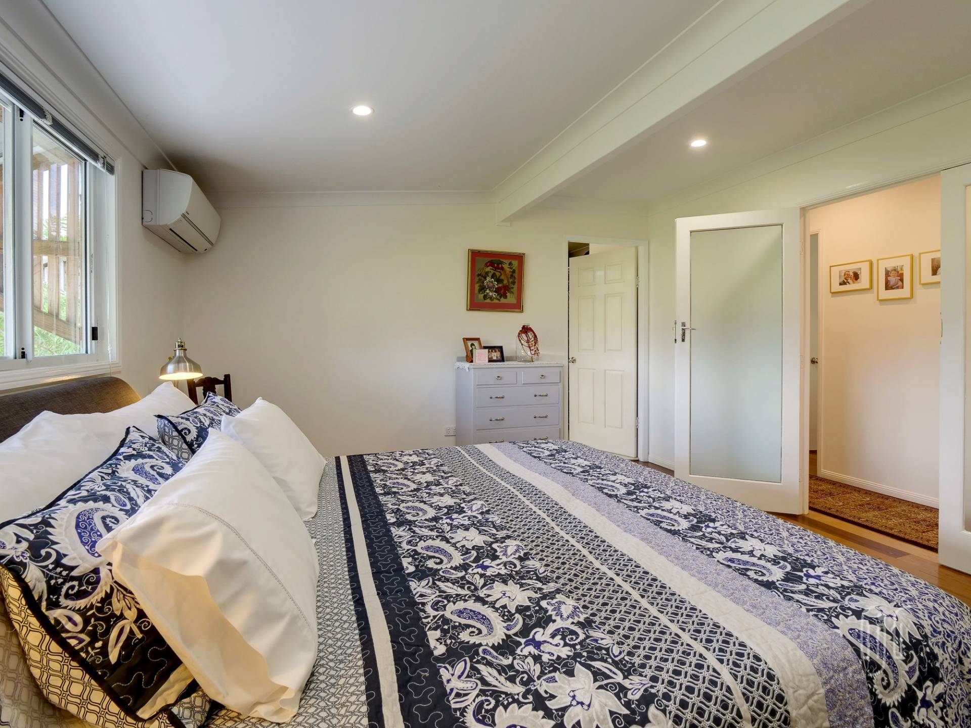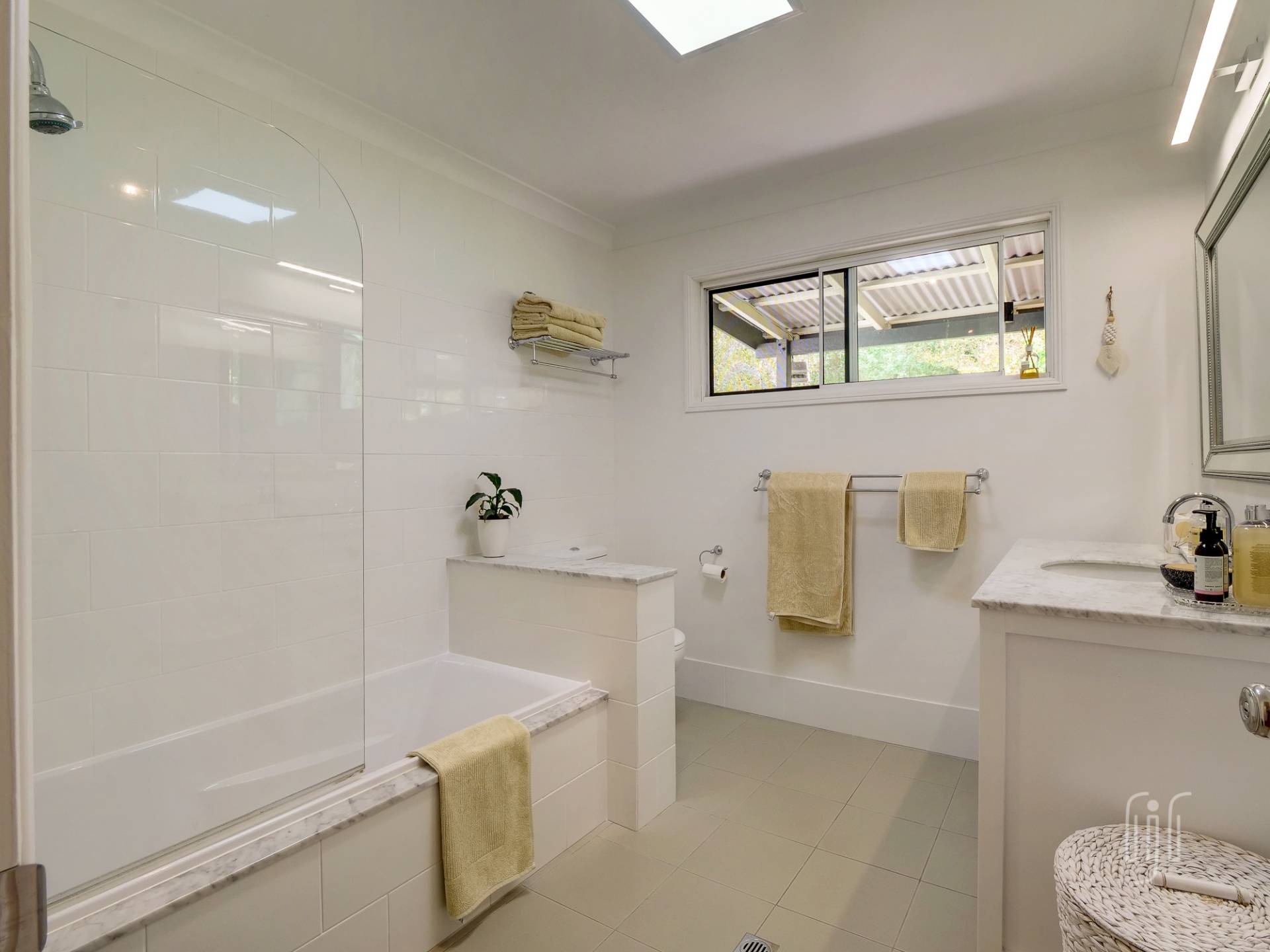 Externally, the home is clad with treated weatherboards and the timber-floor veranda extends to a wide entertainment deck. Entry into the home is straight into an open plan living area, where rustic has been replaced by Hamptons. While some of the standout features include polished timber floors and painted exposed trusses in the cathedral ceilings, you can’t go past the wall of windows that overlook the creek (home to the resident Platypuses). Features in the new kitchen include a 6-burner gas stove & matching range, loads of storage and granite benchtops, to name just a few.