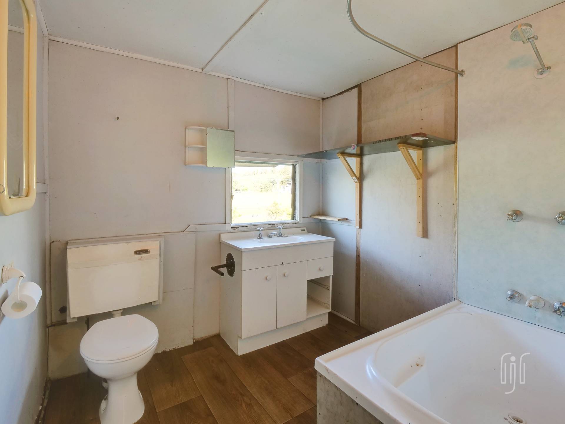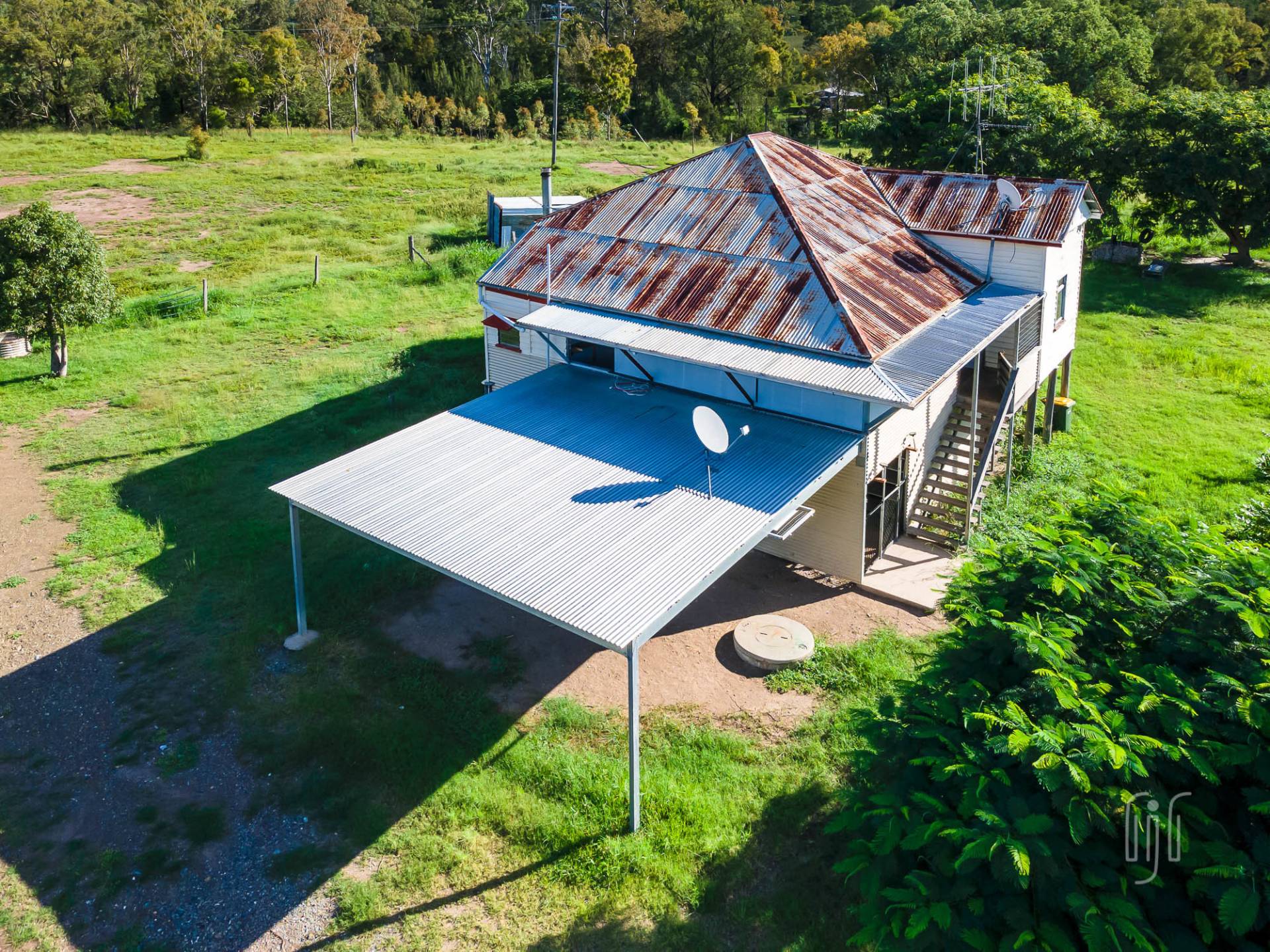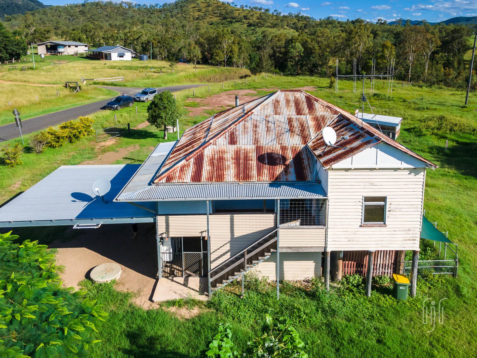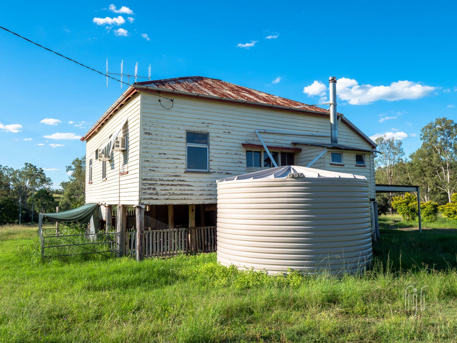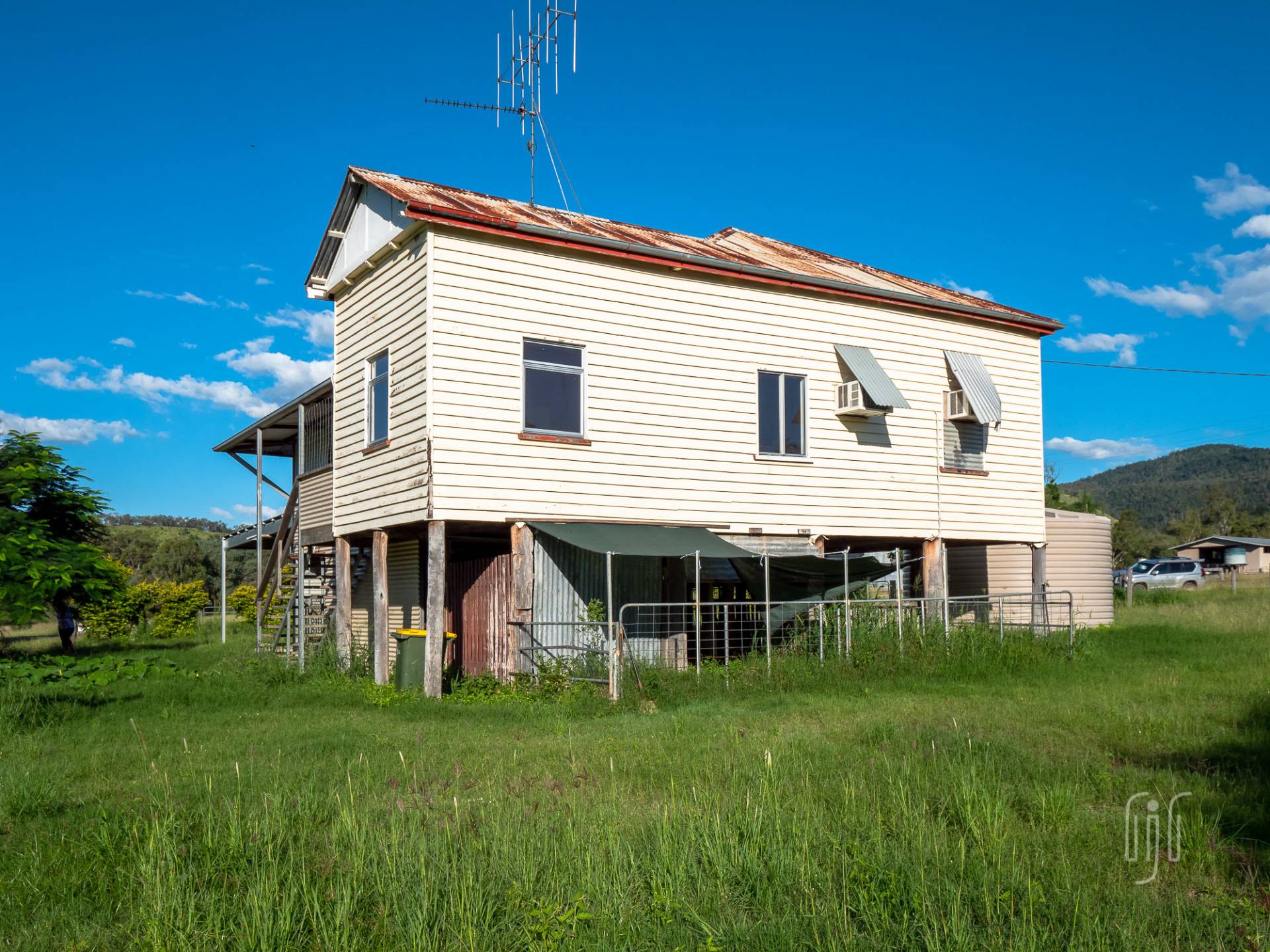 The house at 604 Rossmore Rd is sited on a 4.3 acre (1.76 ha) grazing lot with frontage to Fat Hen Creek, a very pretty seasonal creek. It’s a high-set, characterful house that needs some work.