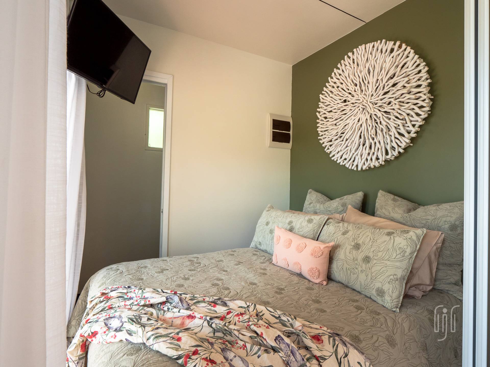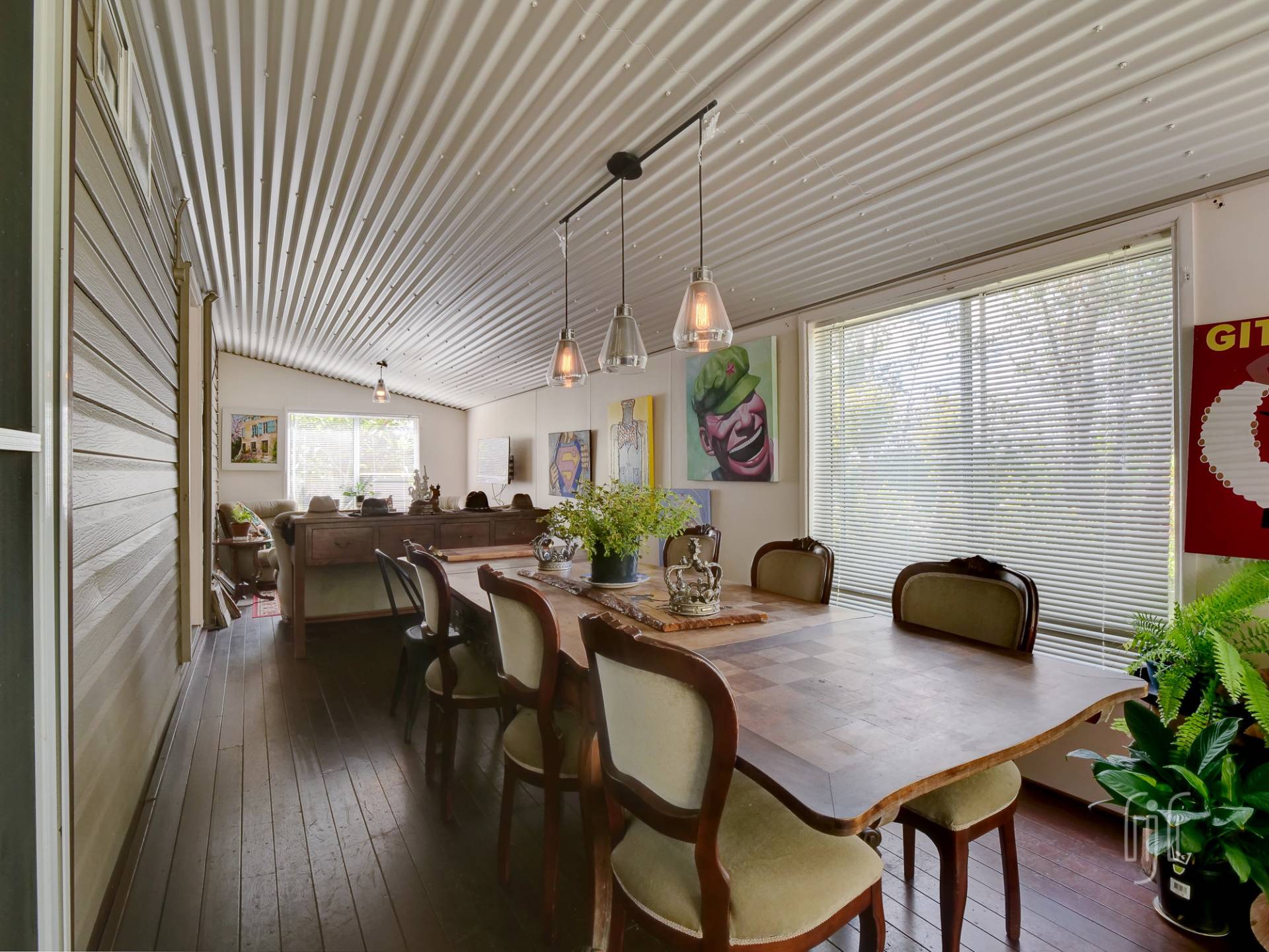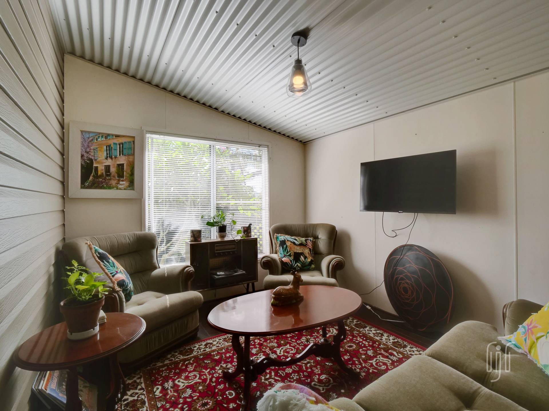 • While small, the main house is very comfortable. The open plan lounge/dining/kitchen has both air conditioning & slow combustion heating. This area is complemented by an enclosed rear deck that greatly extends the living space. There are two bedrooms and one bathroom. The veranda overlooks the huge dam – water views!
