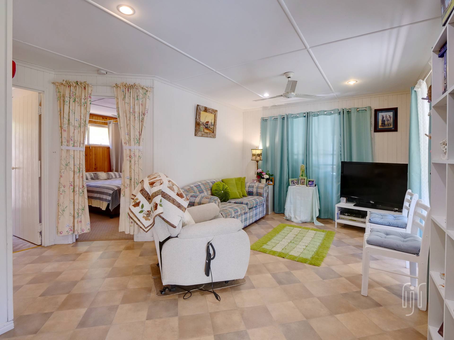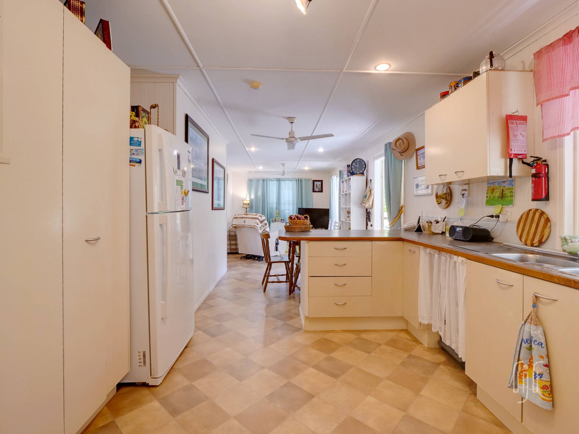 You enter the cottage from the wide front veranda, accessible by both stairs and a ramp. Inside, it’s an open plan living space with vinyl floorcoverings. This area is split between a lounge/dining room and a kitchen that features a freestanding gas cooker and space for a dishwasher. There is good bench space and plenty of storage that includes a pantry.