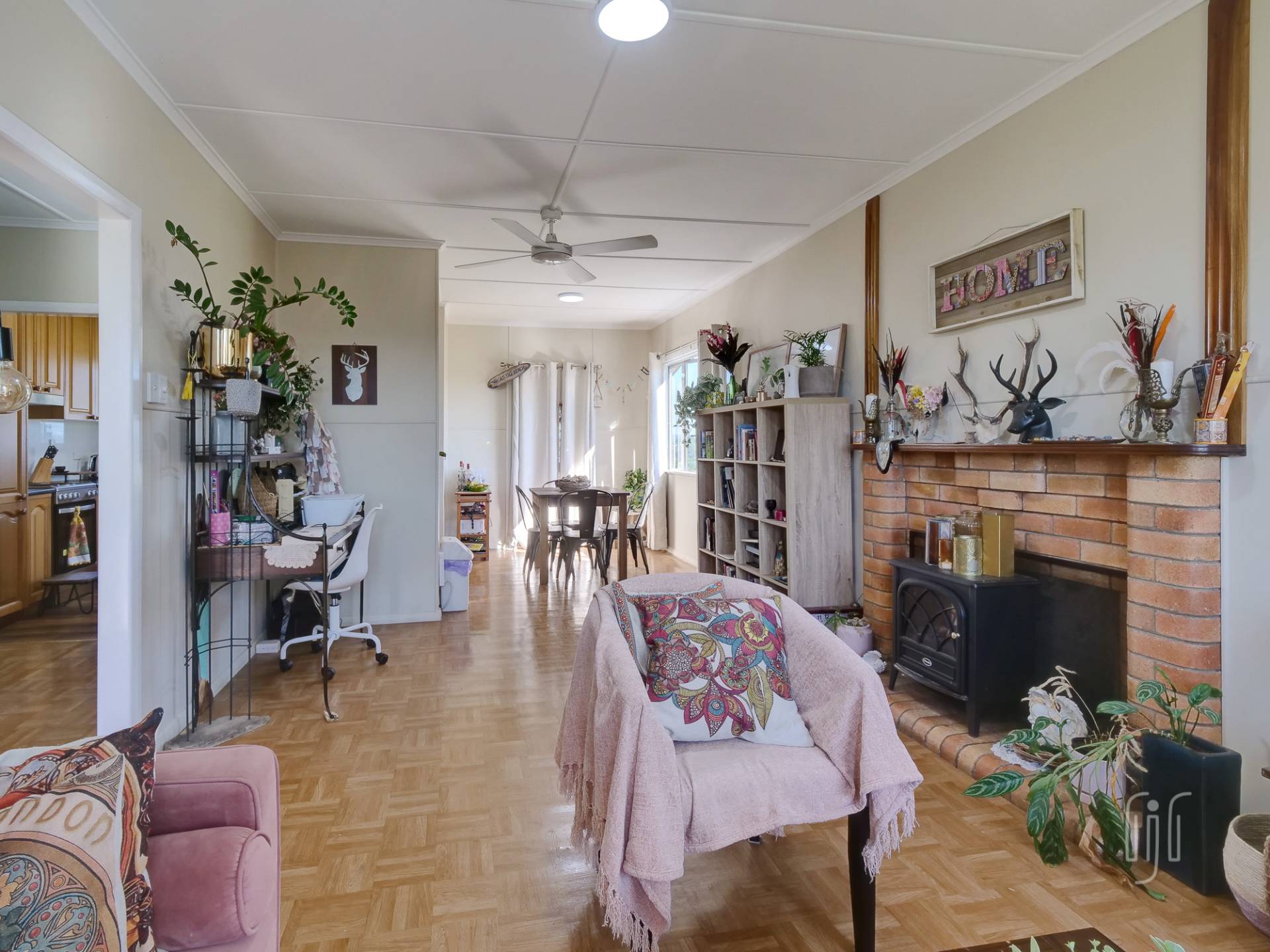 Externally, it’s a chamferboard-clad home on a brick base with a new roof. Inside access is from a porch, both front and back. From the front, it’s straight into a compact timber kitchen with a freestanding electric stove. The dining room is open to both kitchen & lounge and the whole living area has casement windows & vinyl floorcoverings over excellent timber floorboards. The fireplace is the centrepiece of the loungeroom! There are three bedrooms and one modern bathroom. This is a very comfortable home in a great spot with views in three directions.
