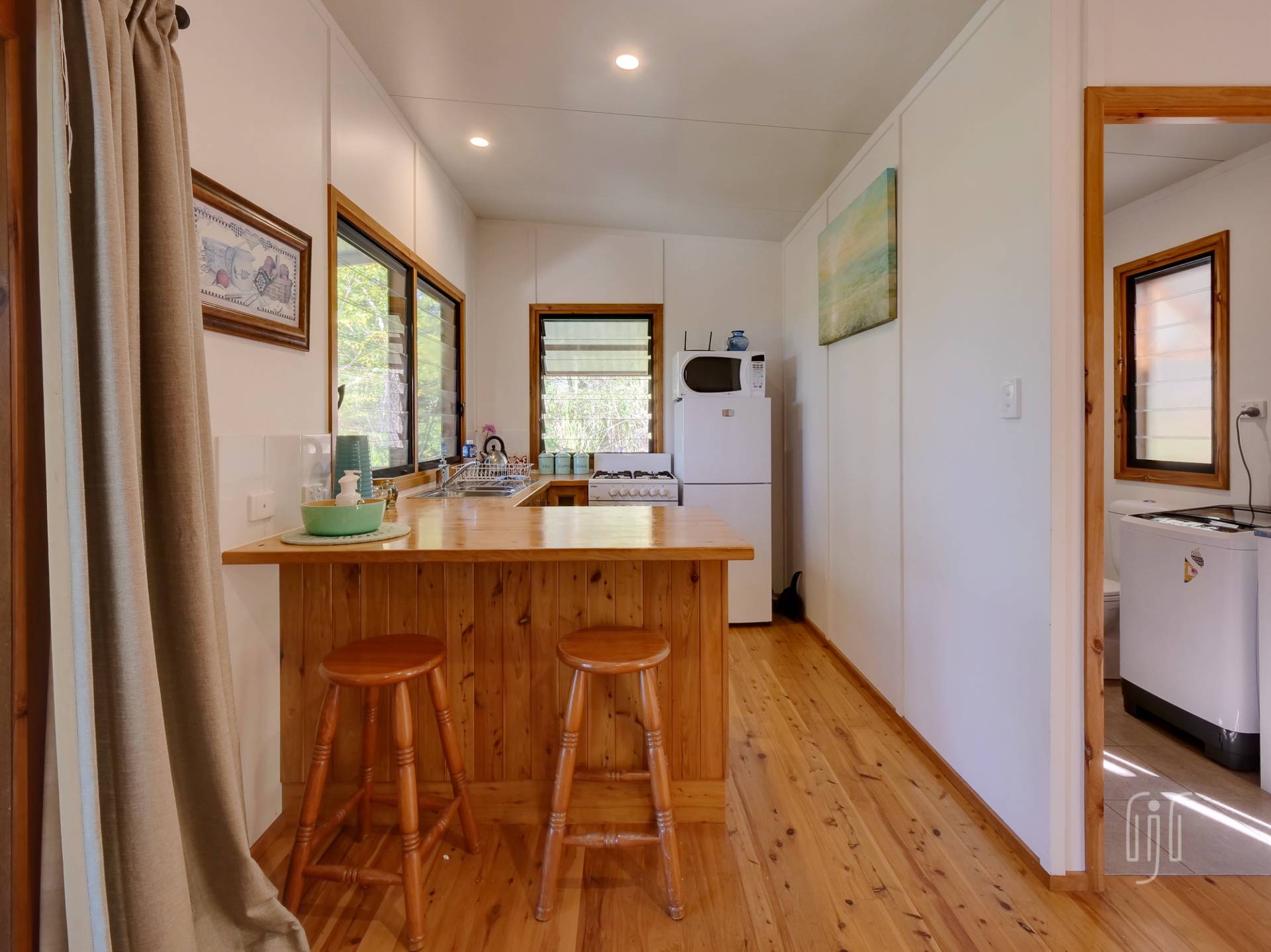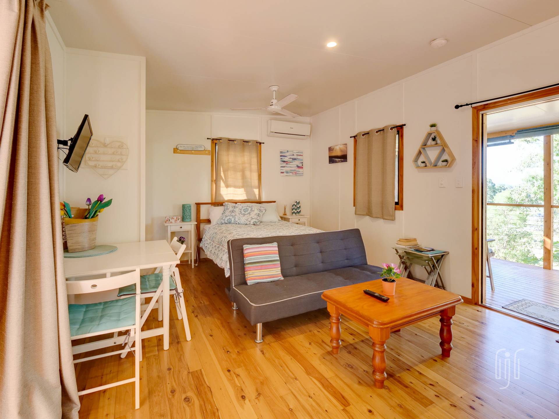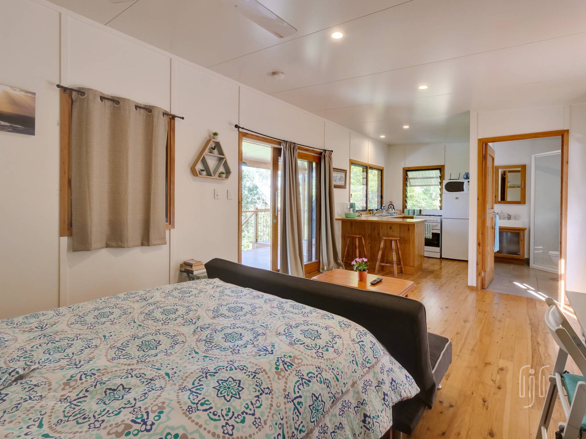 The tiny house does inside/outside living well, with a full-length veranda at the front to take in the view and a BBQ/relaxation area at the back. Inside, it’s a cute bed-sit layout with full kitchen & bathroom/laundry facilities. There is gas cooking, timber benchtops and polished timber floors, while it enjoys air-conditioning, a ceiling fan & cool breezes. It really is the cutest little cottage!