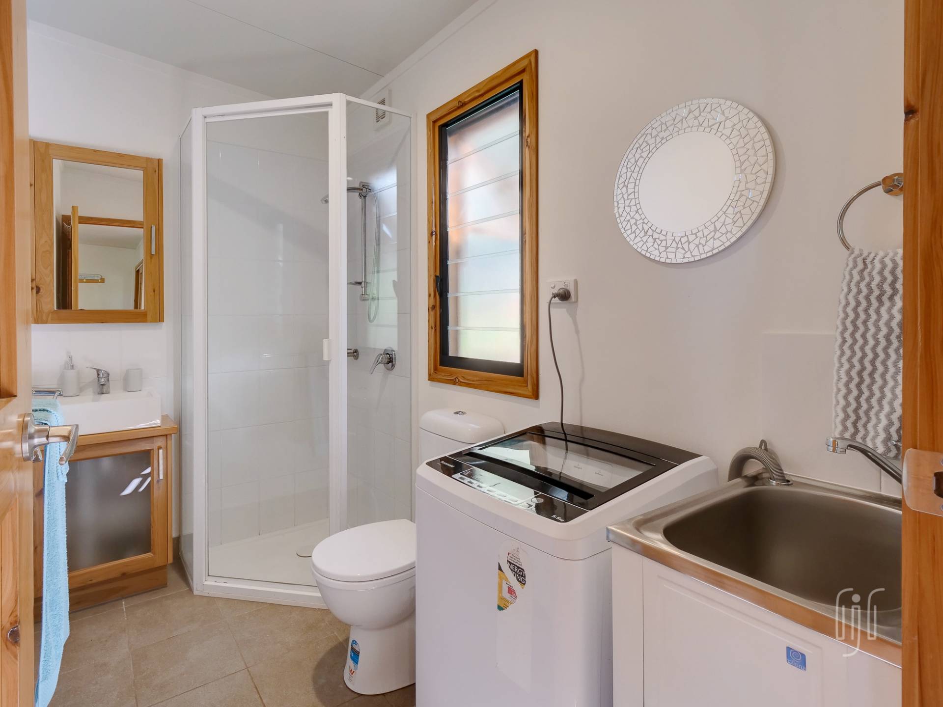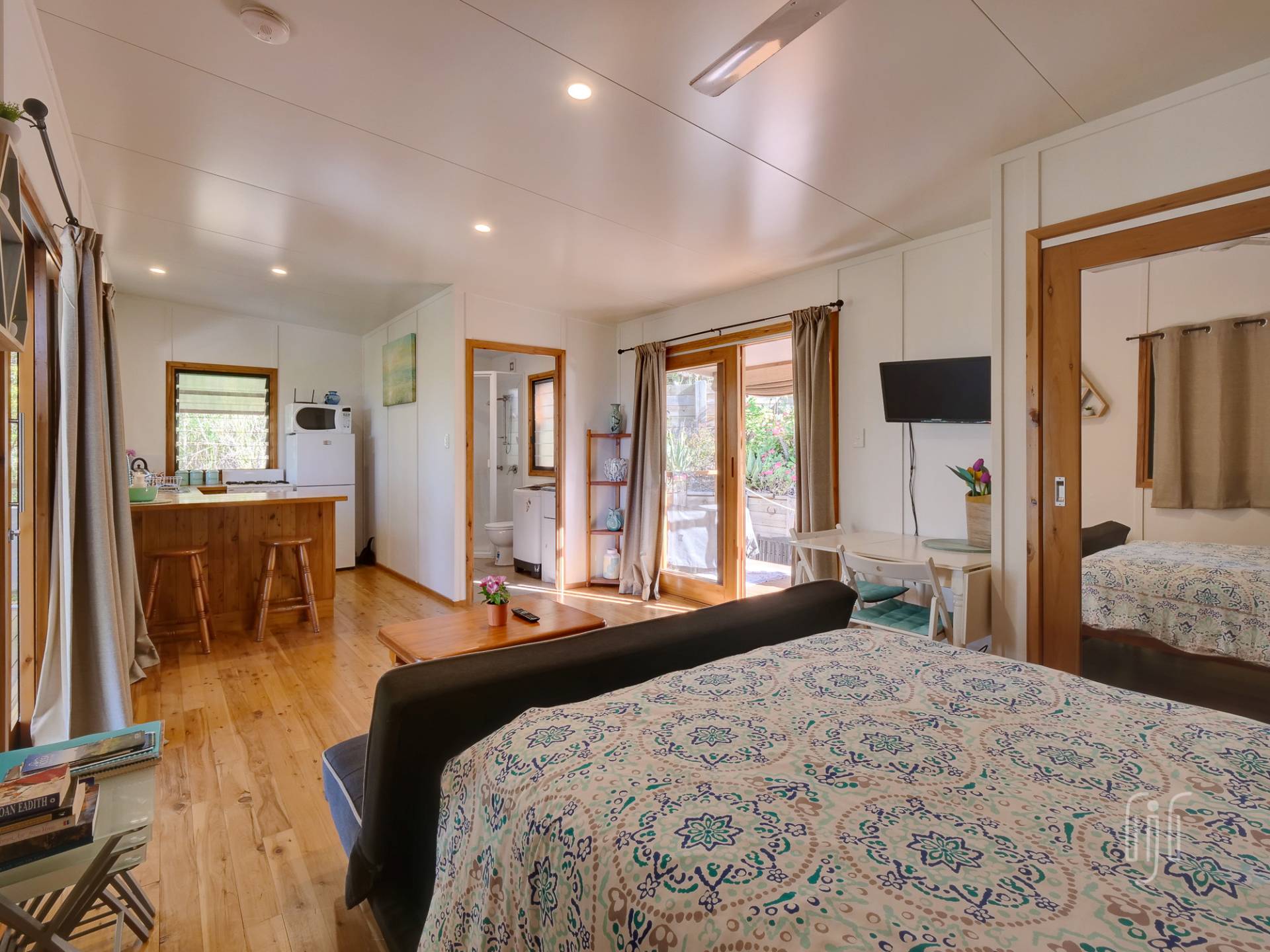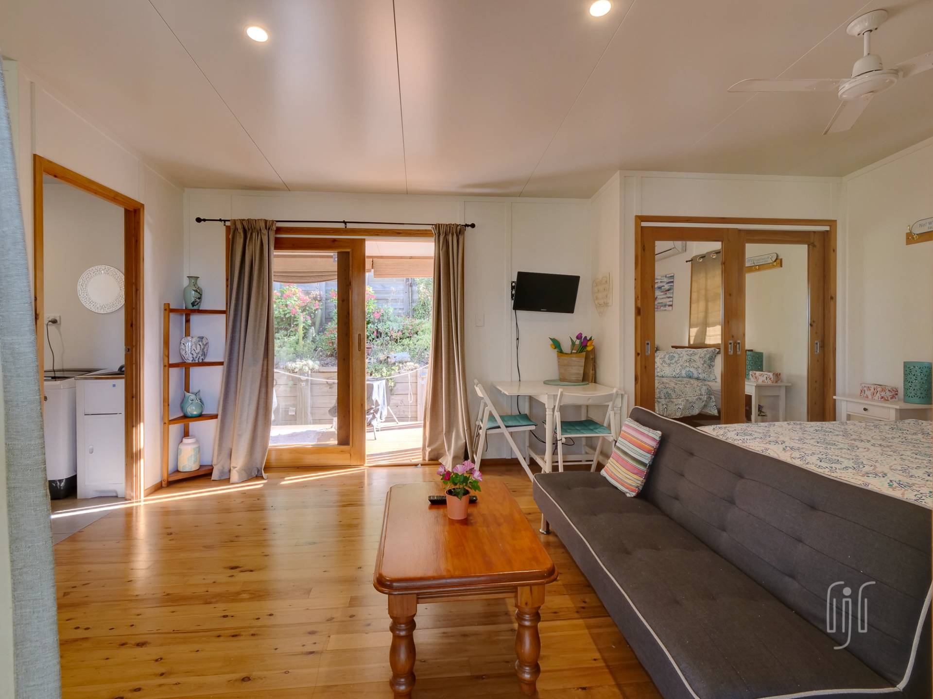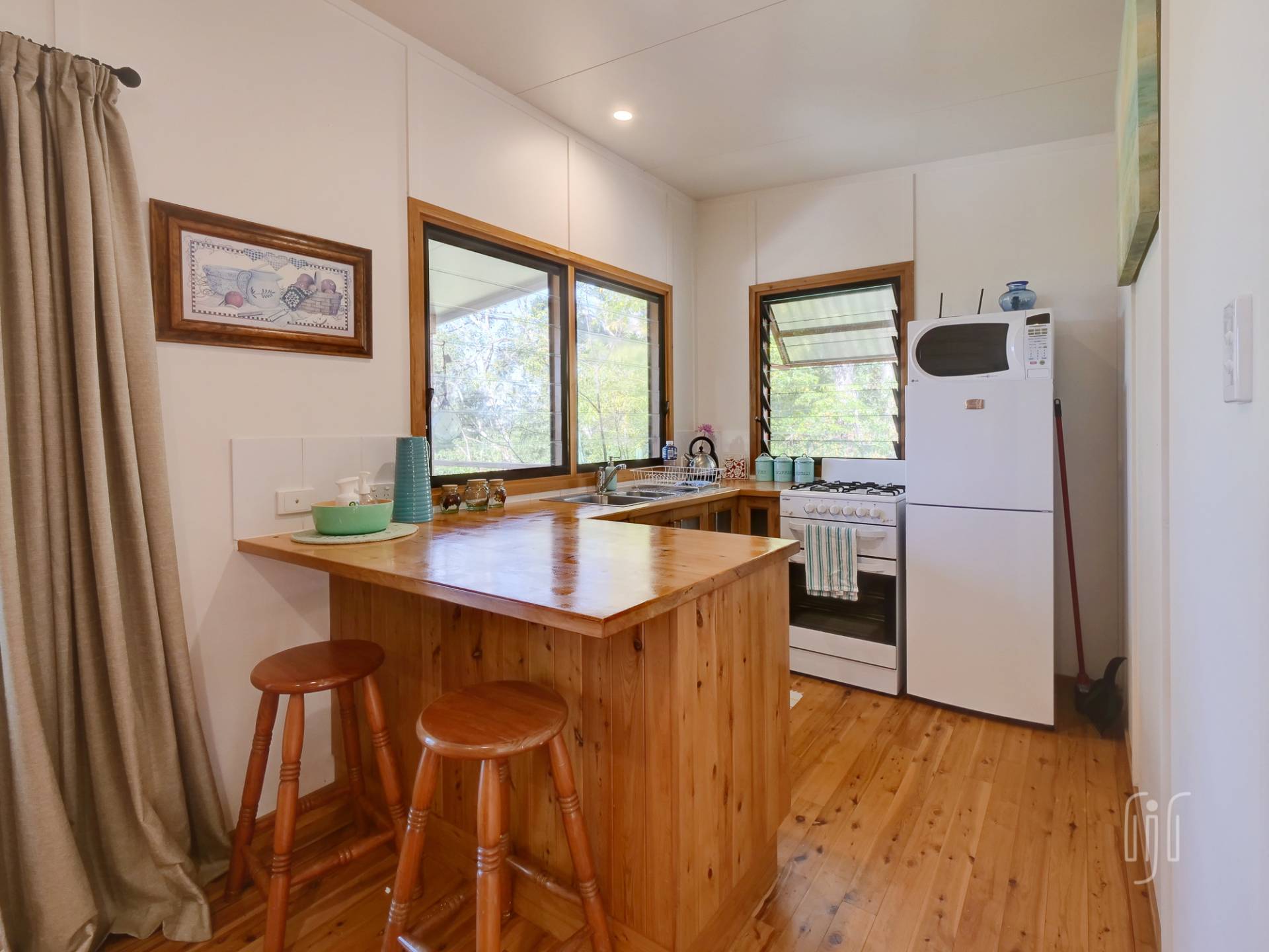 The tiny house does inside/outside living well, with a full-length veranda at the front to take in the view and a BBQ/relaxation area at the back. Inside, it’s a cute bed-sit layout with full kitchen & bathroom/laundry facilities. There is gas cooking, timber benchtops and polished timber floors, while it enjoys air-conditioning, a ceiling fan & cool breezes. It really is the cutest little cottage!