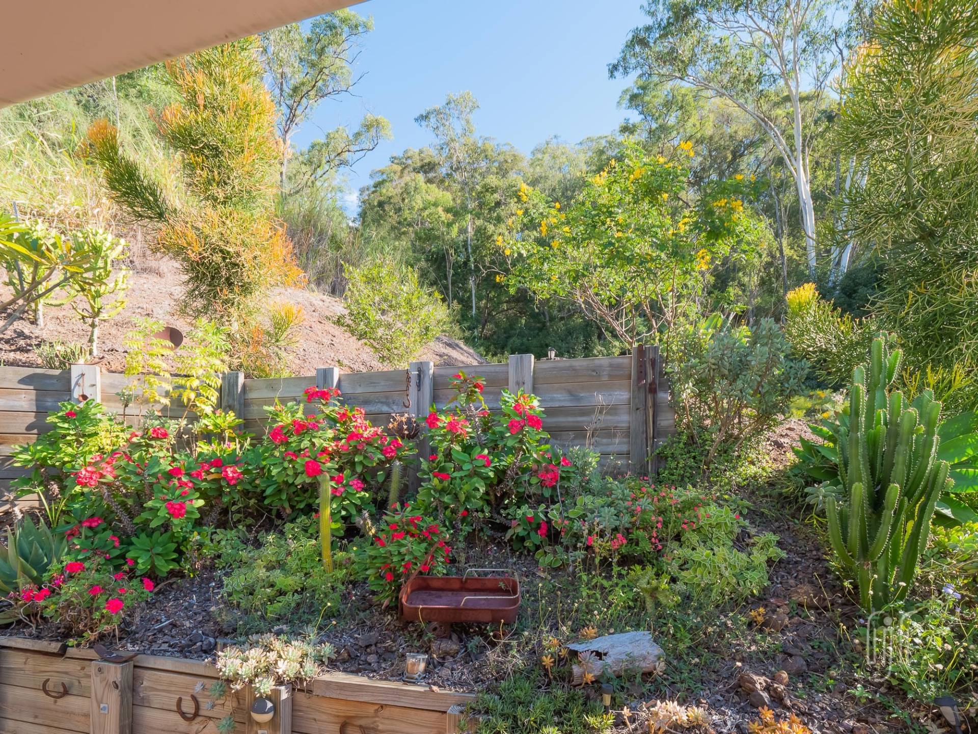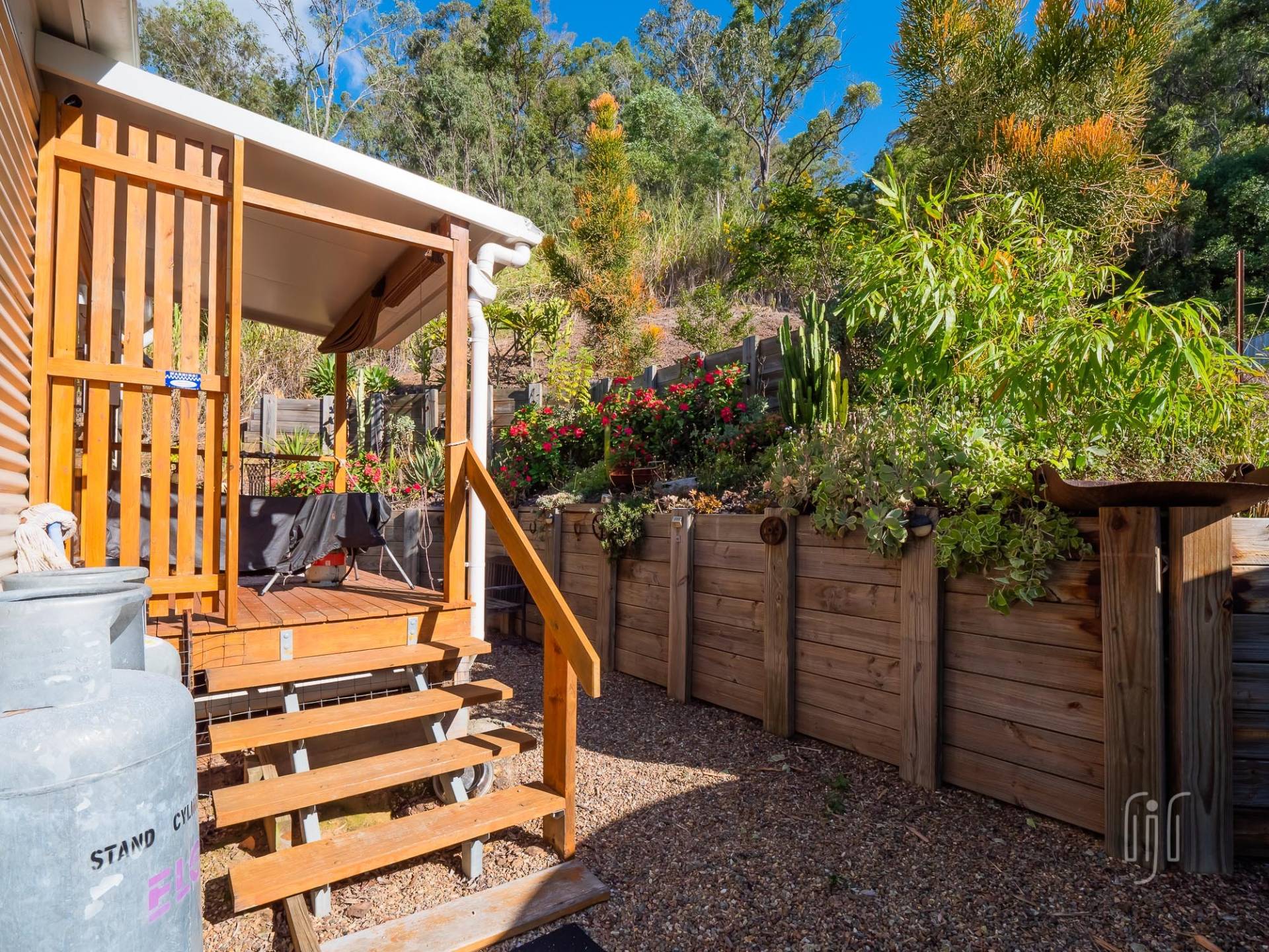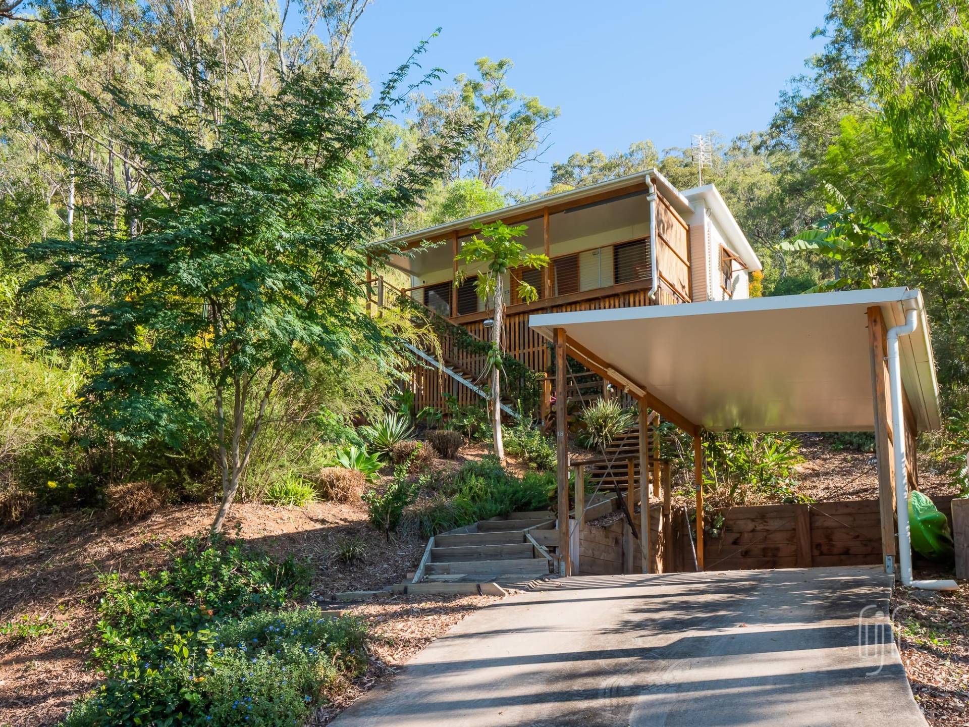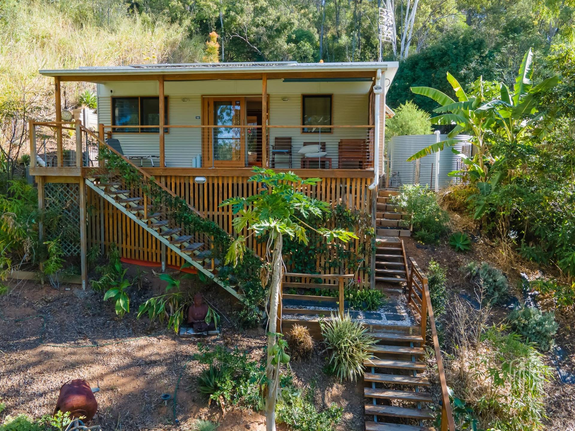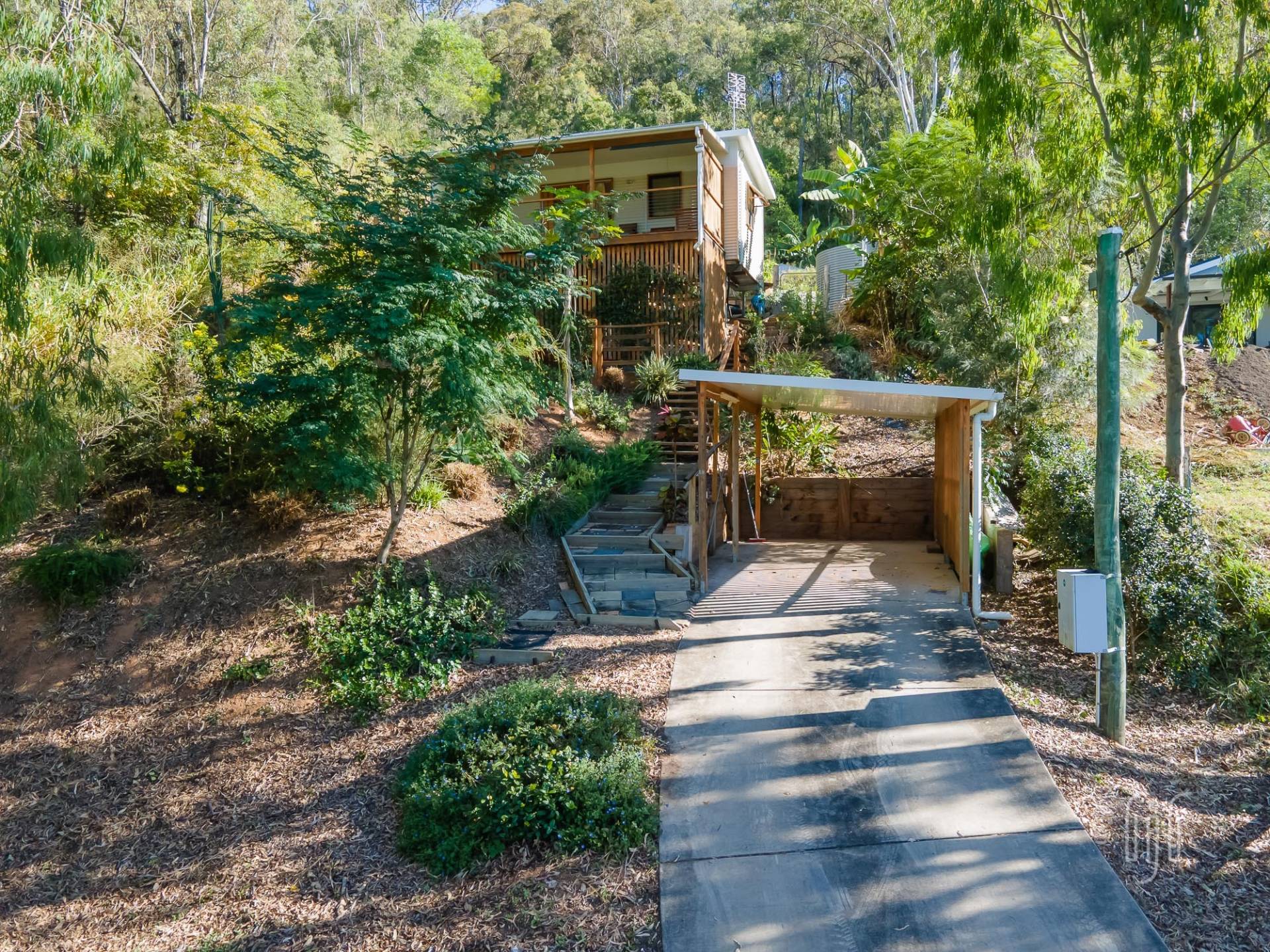 The three-tiered block, tamed by retainer walls, stairs & paths, is well-established. It has a single carport on the lower level, the tiny house on the mid level and a shed & some open space on the top level.