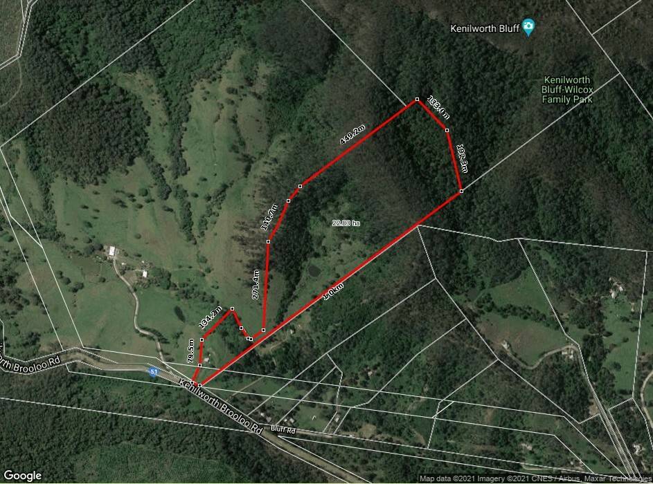 Although the property at 502 Kenilworth Brooloo Rd has an “old house” on site, it really is all about the land. 56 acres (22.83 ha) of land in fact. Around 1 Km in length, it stretches from the road, up the side of the hill, to meet the Council reserve that takes in the top of the Bluff.