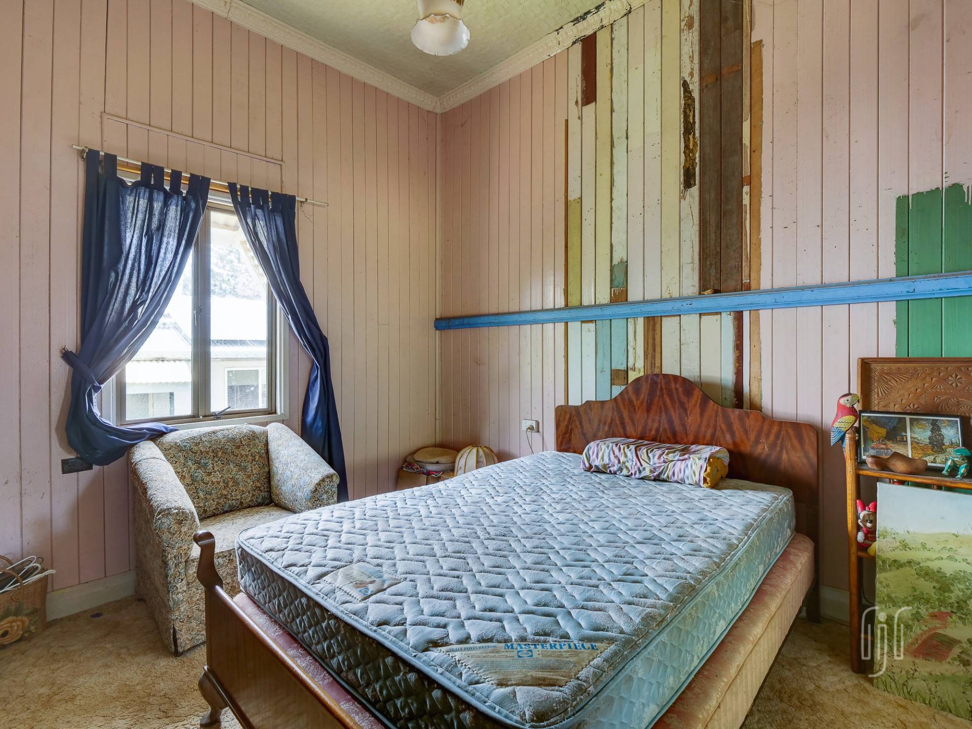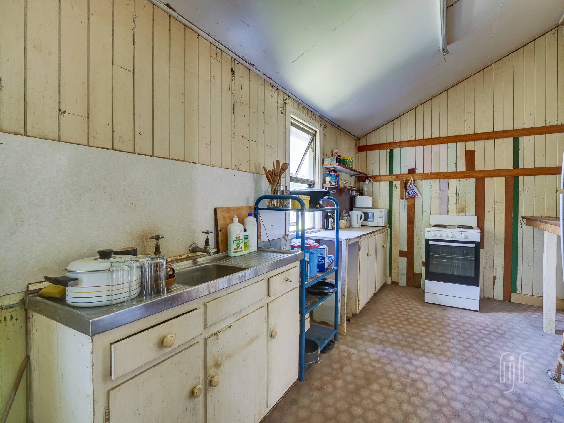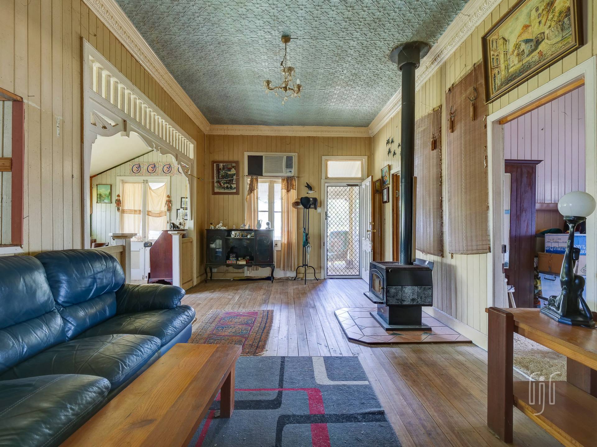 From the front veranda, you enter a loungeroom with high, pressed metal ceilings, ornate cornices, timber floors and a slow combustion heater. The enclosed veranda off this room features a bank of colourful casement windows. The back living area is a total add-on and gives access to a small kitchen with a freestanding electric stove. There are two generous sized bedrooms with décor to match the loungeroom. The bathroom is split into two rooms … one with a shower, bath & vanity; the other with a toilet & vanity.