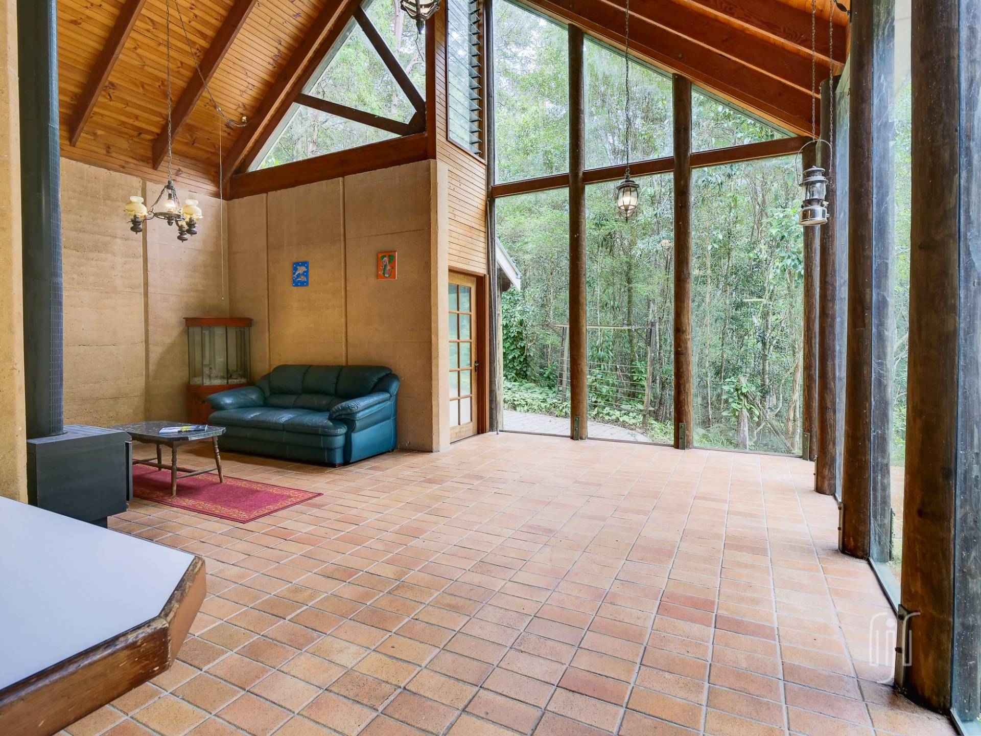 The access driveway becomes a circular driveway and you are almost at the cottage before it comes completely into view. The cottage buildings appear in a small clearing, surrounded by the tall rainforest timbers. The cottage has the combined natural beauty of rammed-earth walls, timber linings & treated log posts … plus big glass panels to capture the view.