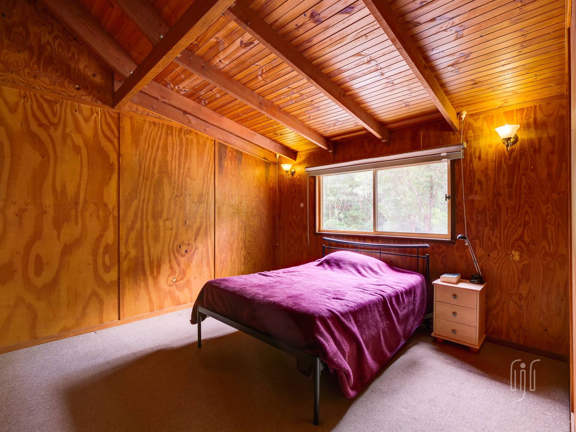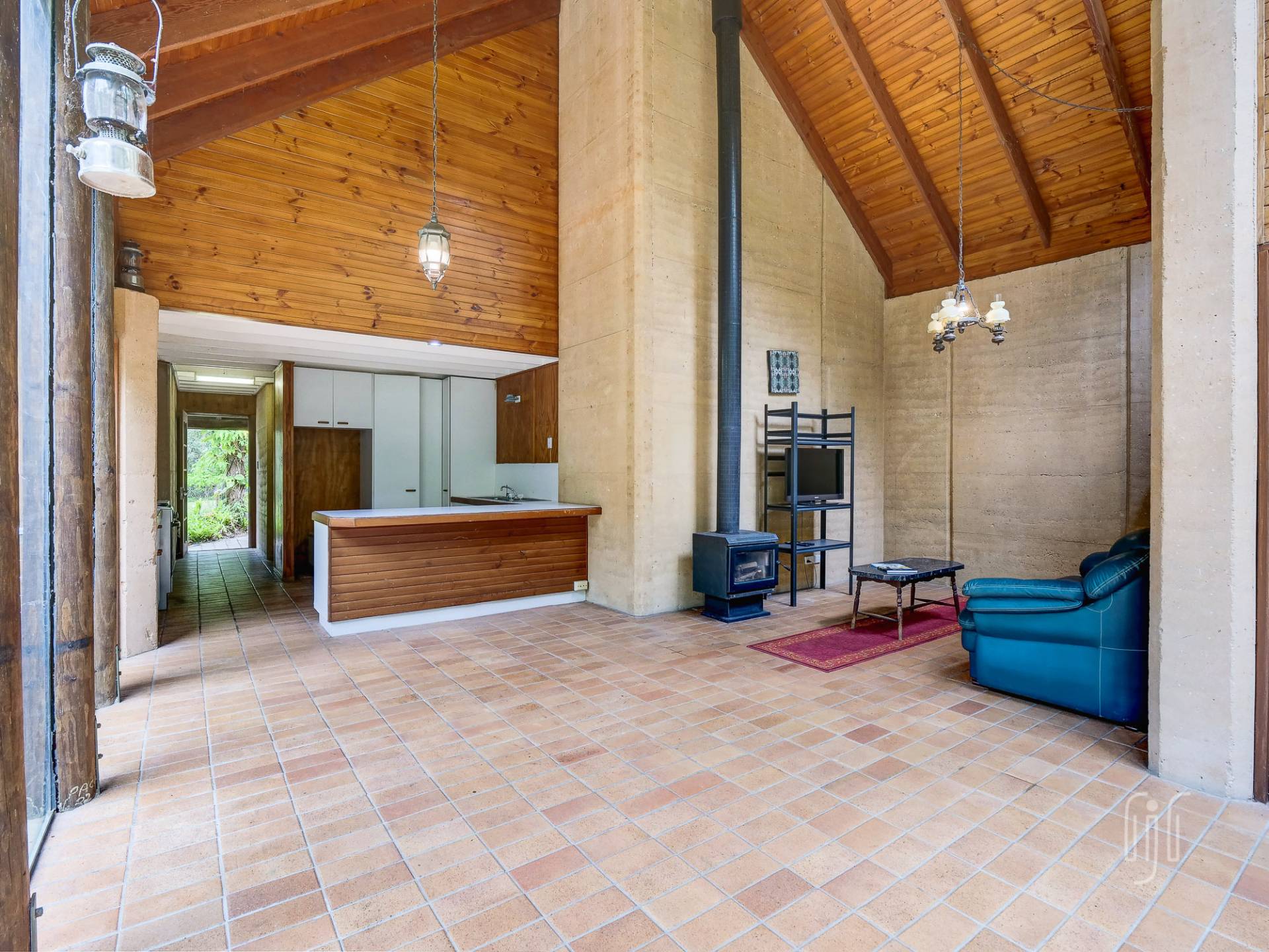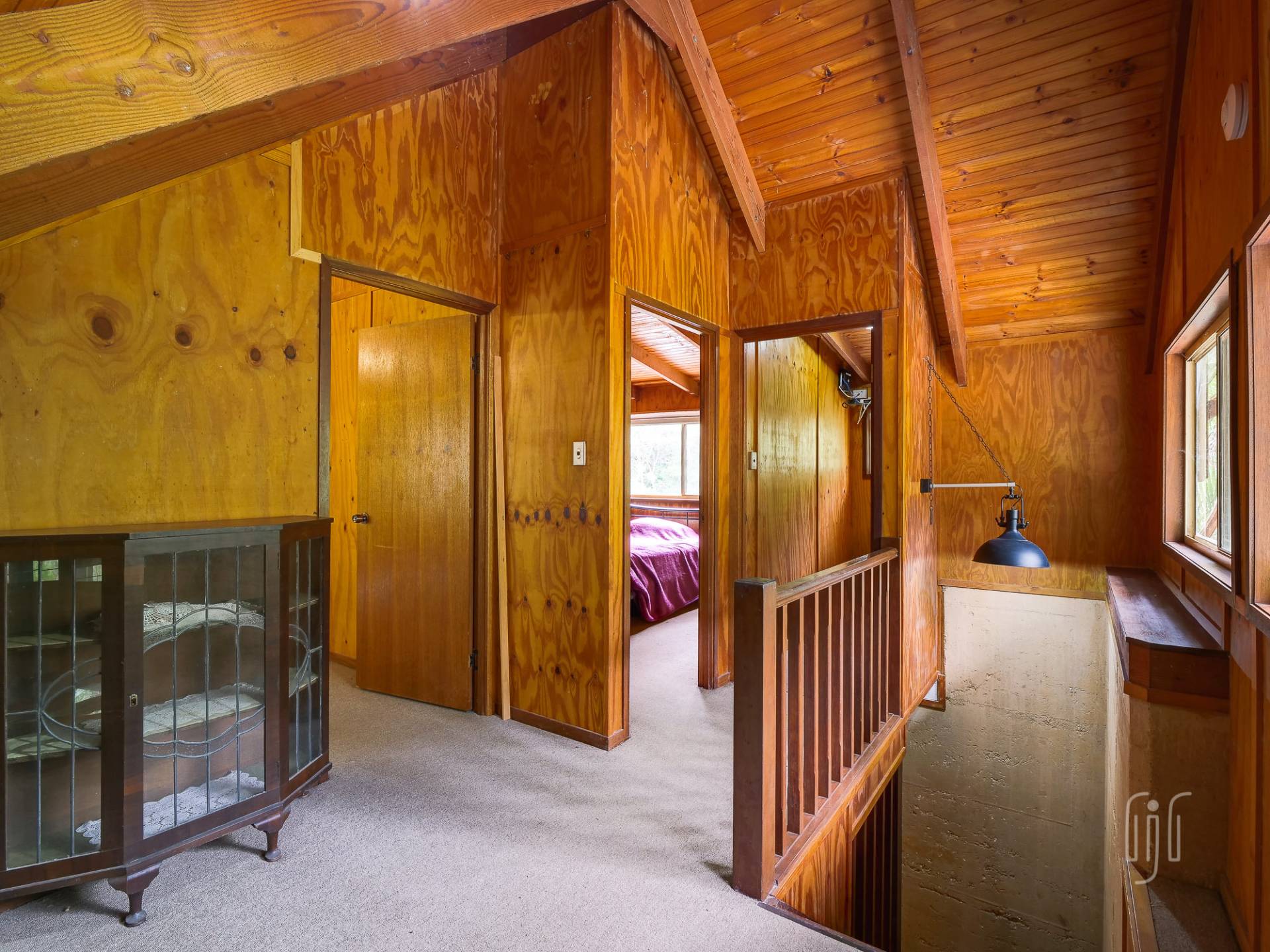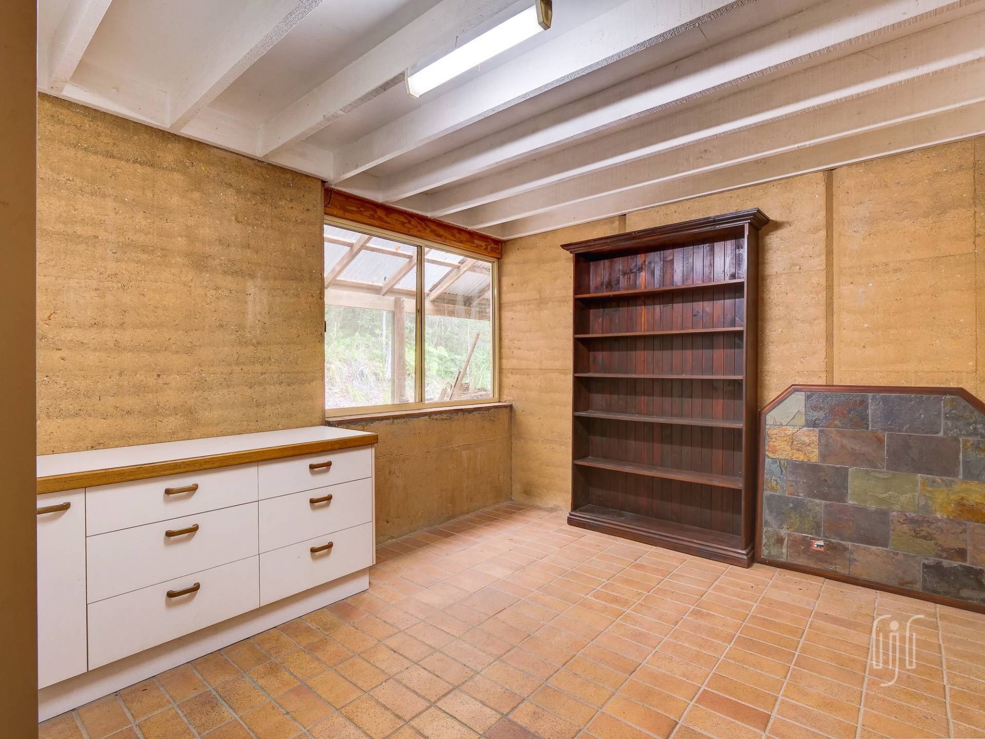 This is a cottage in every sense of the word. A cute, double-storey building with the living room & kitchen, on the ground floor, sharing a similar view to the wide front deck. And it is an awesome view! The living area features the rammed-earth walls, vaulted ceiling & huge treated log poles between big glass panels. It has slow combustion heating and adjoins a simple kitchen with gas cooking. The ground floor layout includes one bedroom, the bathroom & laundry, plus the internal stairway to the top floor. Upstairs, an open sitting room gives access to two more bedrooms and the upstairs toilet. A room on the ground floor, accessed from outside, could be a study or fourth bedroom.