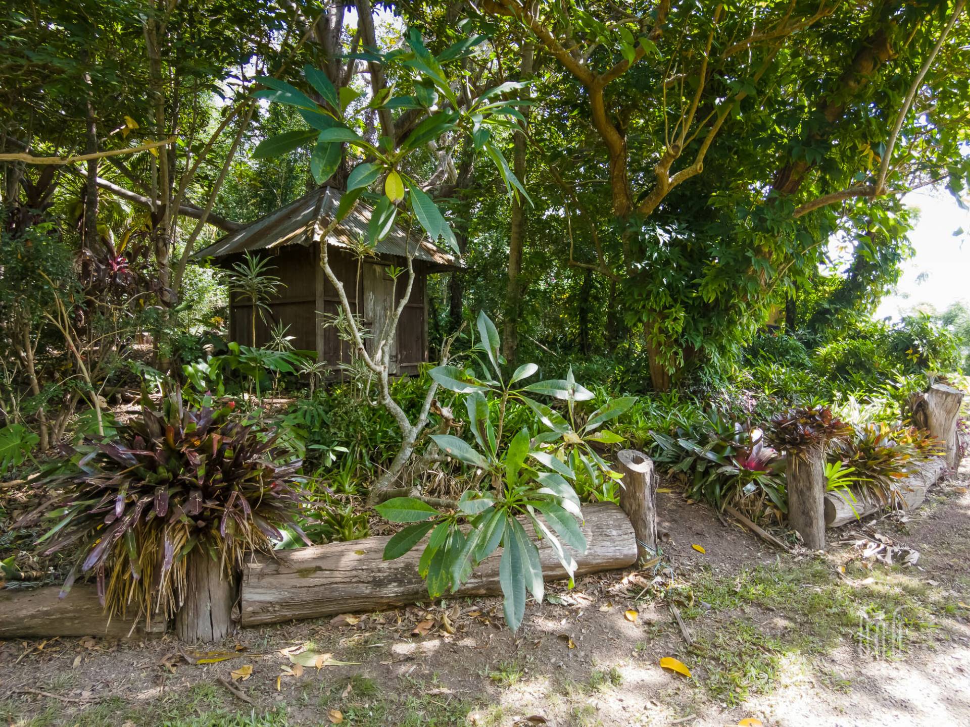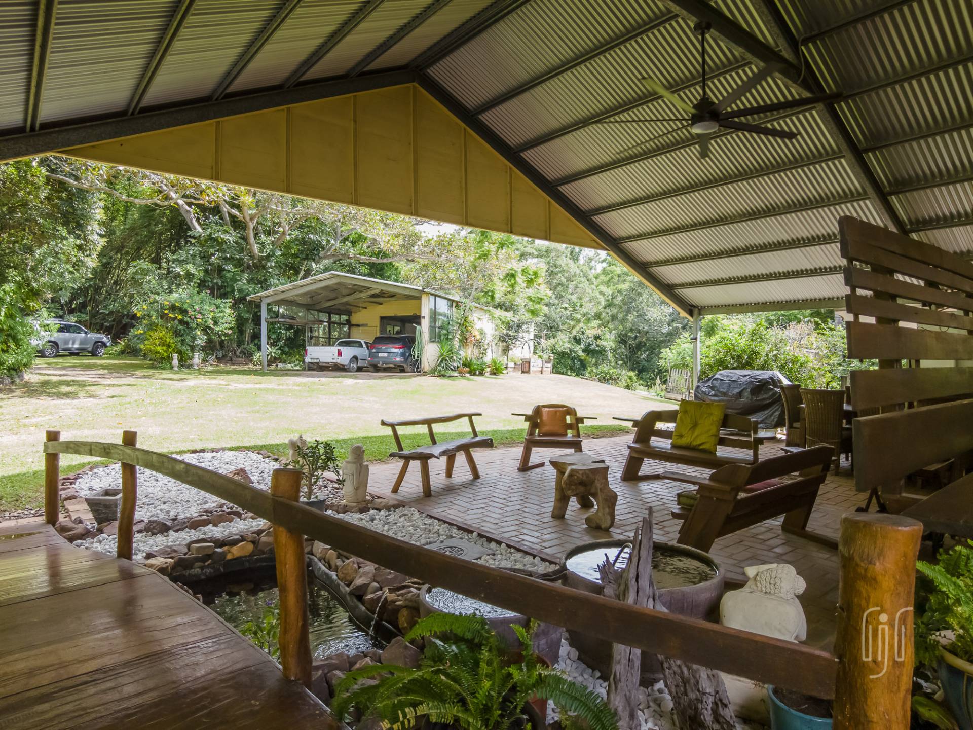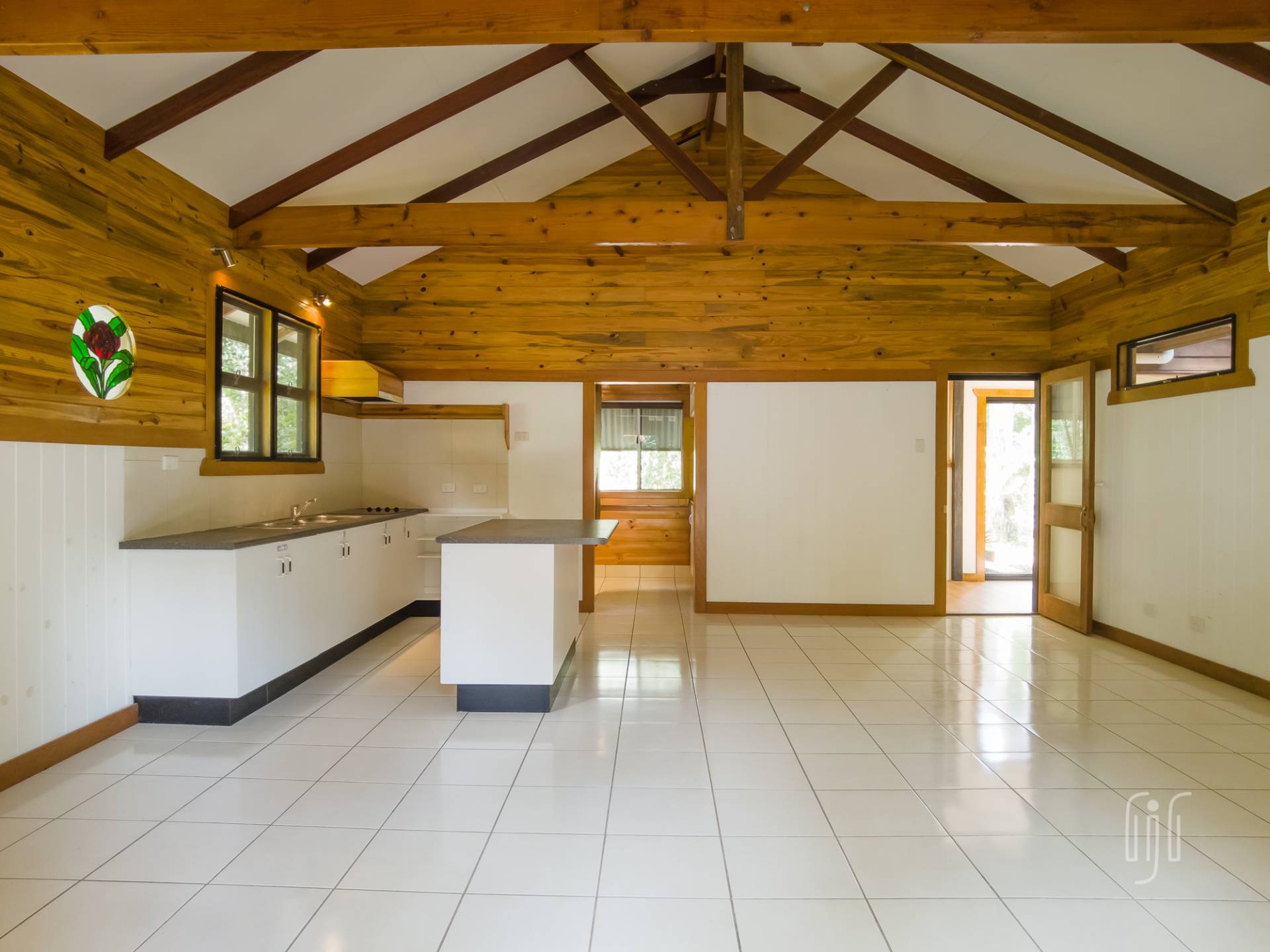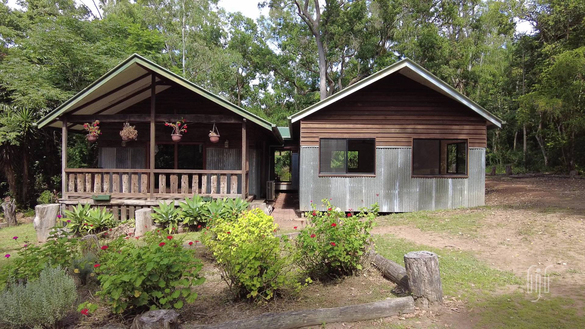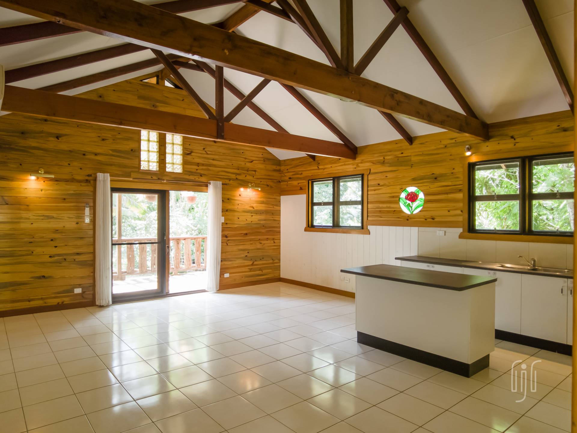 The second, rustic self-contained dwelling, separated from the main house by the landscaped grounds, has entry from a covered deck straight into an open plan living area that includes a kitchen. This room has exposed trusses and air-conditioning. The other half of the building is open plan and could be left that way, or be divided into individual bedrooms. There are full bathroom and laundry facilities.