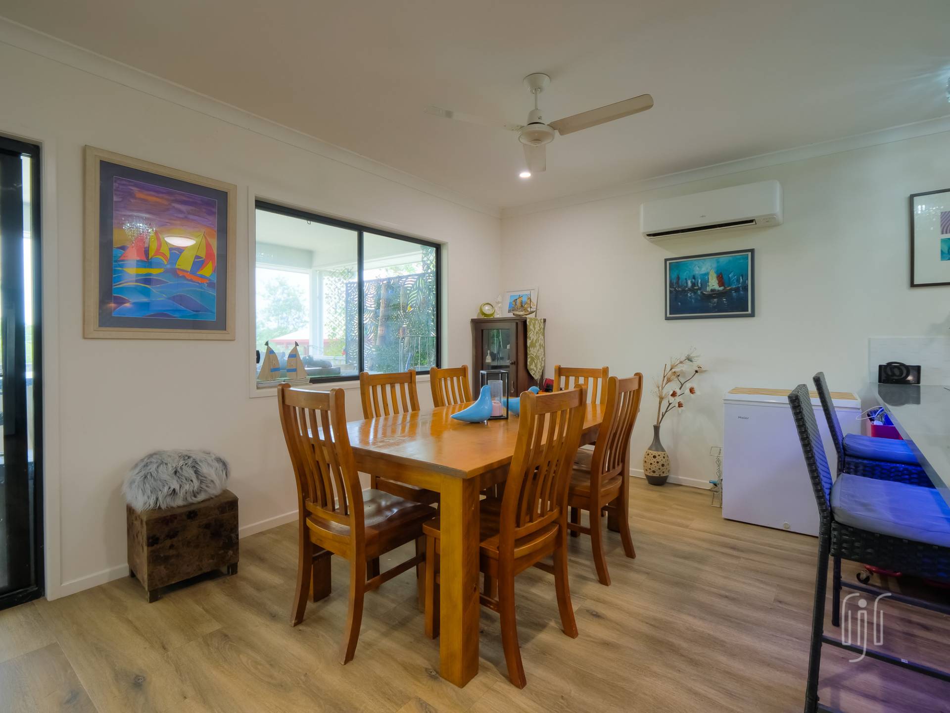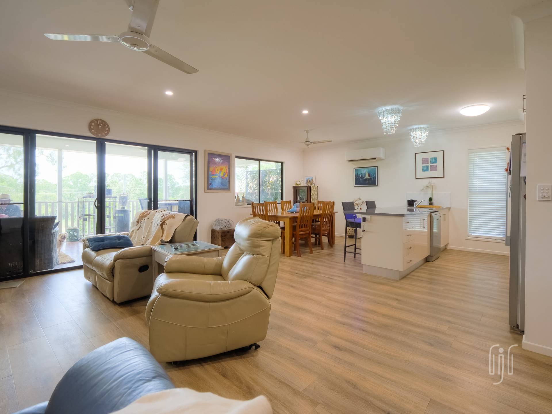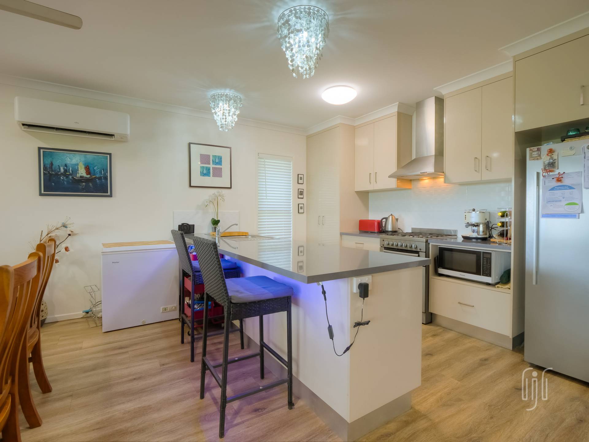 Inside, the living area is open plan with generous spaces for lounge, dining & kitchen. The lounge has a feature fireplace (electric), the dining area has air conditioning and the kitchen has gas cooking, a dishwasher and plenty of bench space & storage. A breakfast bar separates kitchen from dining and all living areas have timber-look vinyl floorcoverings.