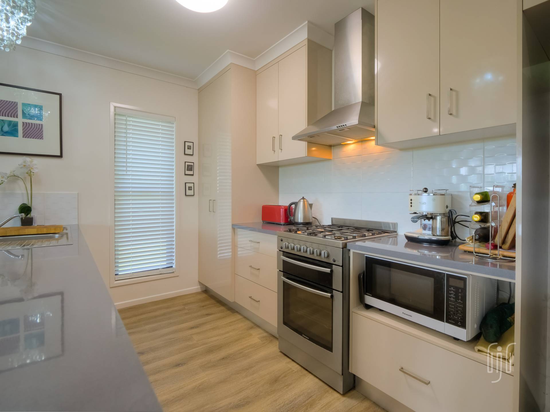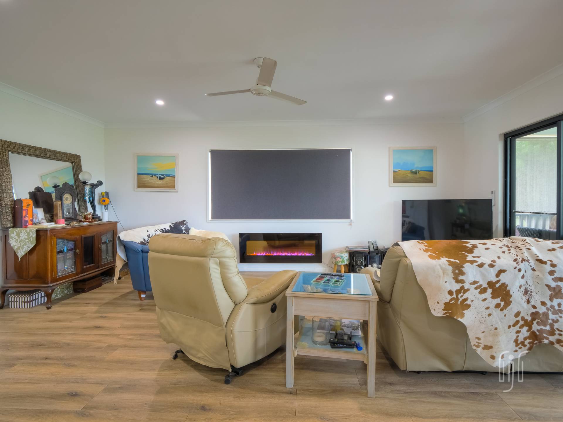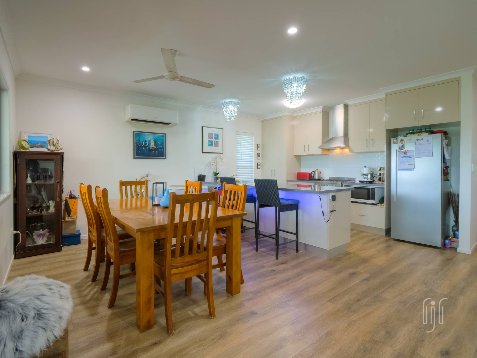 Inside, the living area is open plan with generous spaces for lounge, dining & kitchen. The lounge has a feature fireplace (electric), the dining area has air conditioning and the kitchen has gas cooking, a dishwasher and plenty of bench space & storage. A breakfast bar separates kitchen from dining and all living areas have timber-look vinyl floorcoverings.