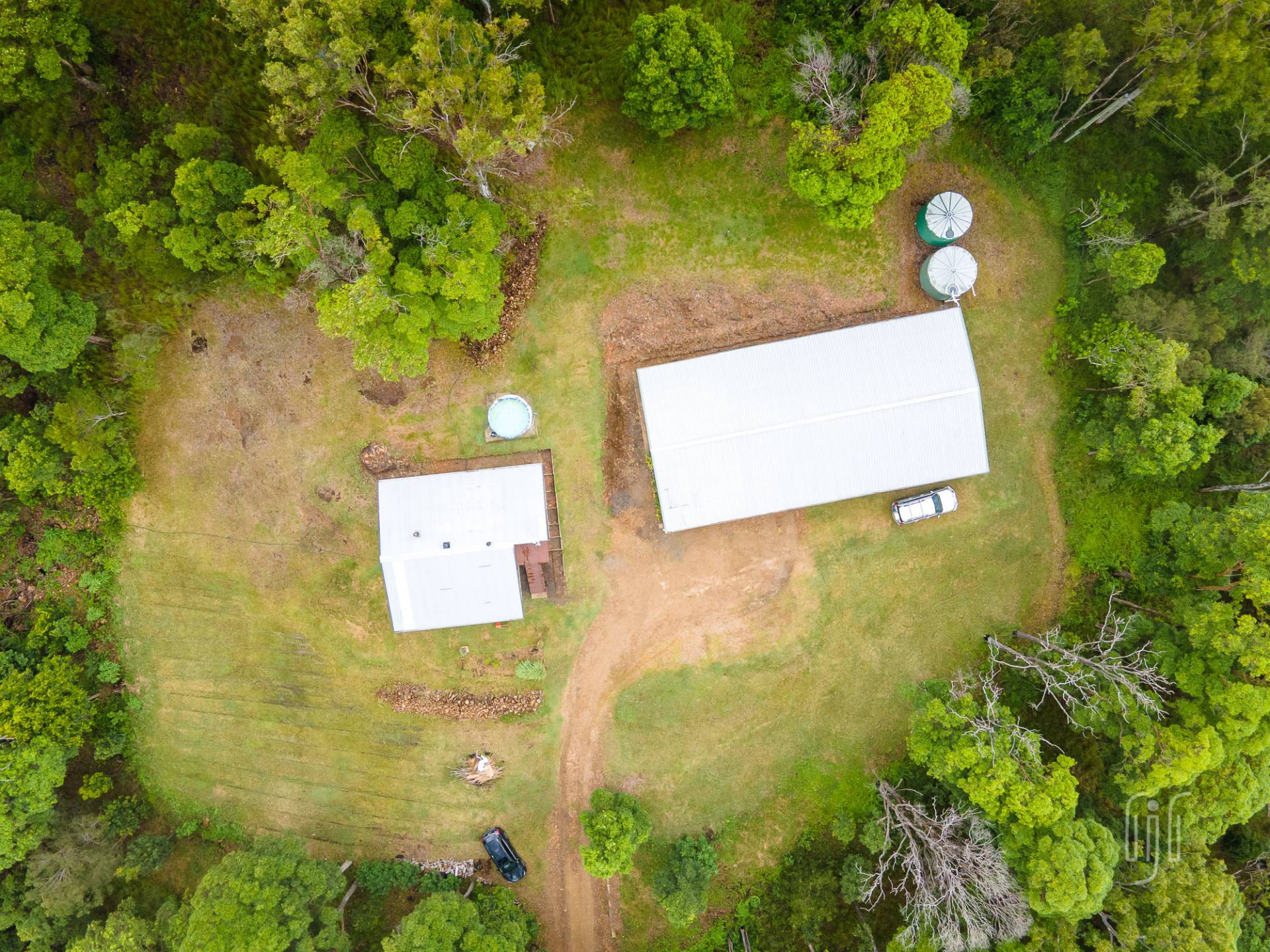 A long driveway takes you through the well-treed 10 acre (4.11 ha) lot to an elevated clearing towards the rear of the property. Here, you will find a modest cabin beside an awesome shed. It’s a private spot with a great view.