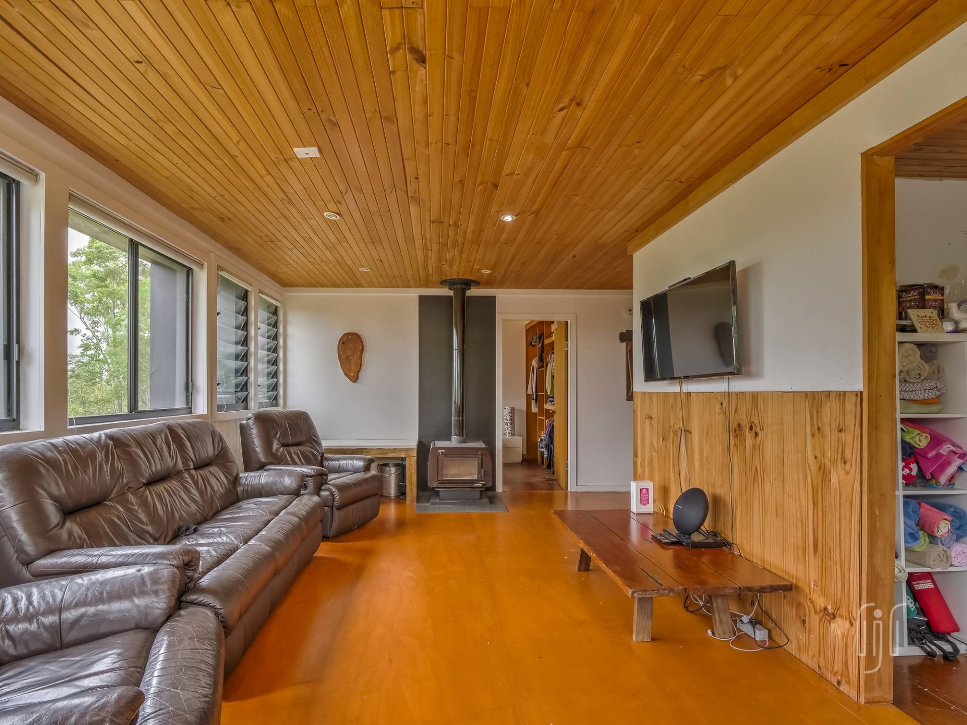 Externally, the cabin (cottage) has a modern, black & silver finish with corrugated iron wall cladding, box-shape window surrounds and a stone-faced entry wall. Inside, it’s rustic & quirky with timber-lined ceilings, natural particleboard & ply floors and plenty of glass to enjoy the views. The loungeroom has a slow combustion heater … and the block has an endless supply of fuel.