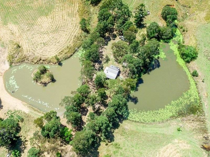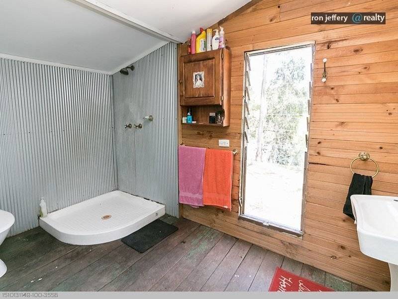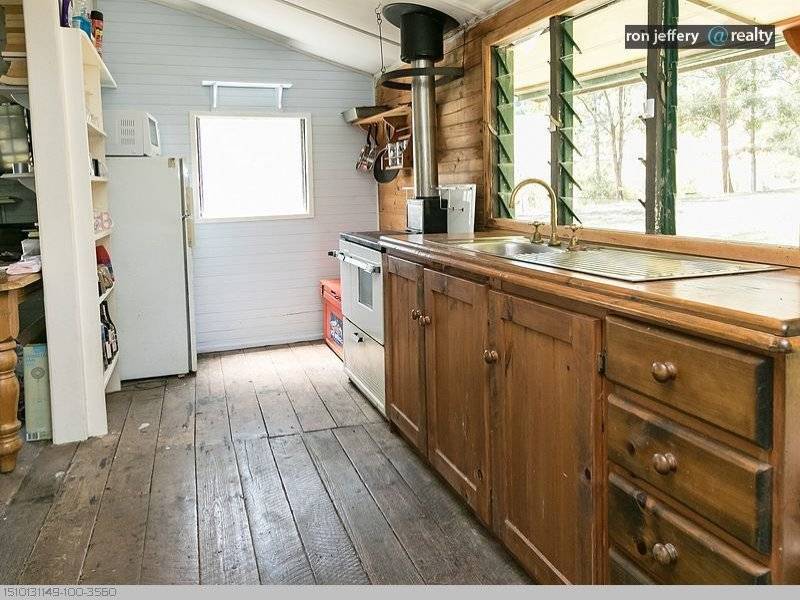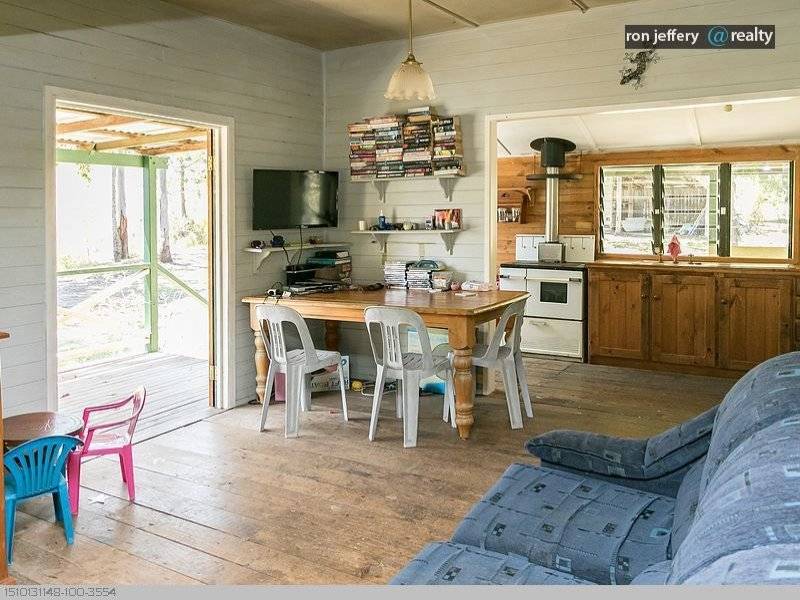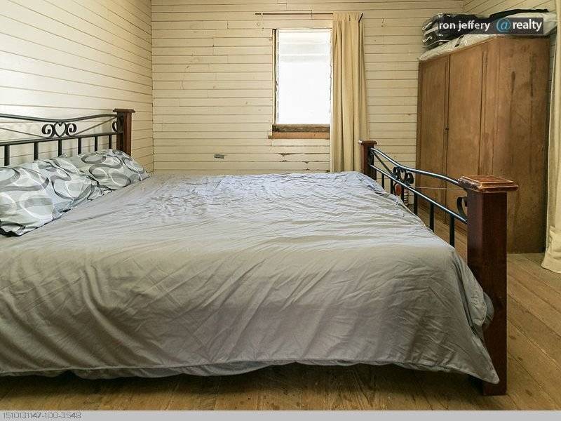 The home is a typical Australian country cottage, nestled between two dams, in a treed setting. It’s been here for a while! The front stairs lead to a covered veranda on two sides of the weatherboard cottage. You could just settle here! Access to the inside is via a number of French doors. The lounge, currently used as a bunk room, with an open fire at one end, is semi separated from the dining room. The kitchen is simple but functional and has a slow combustion stove. There is one bedroom and one bathroom.