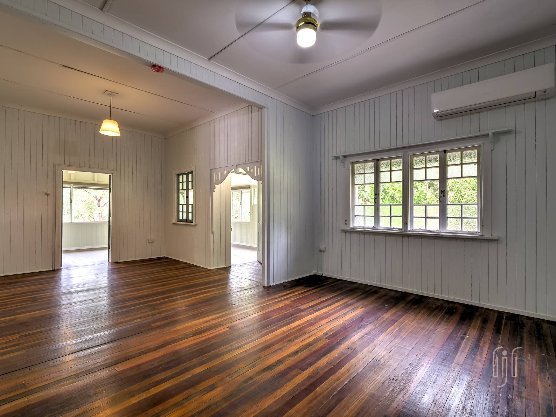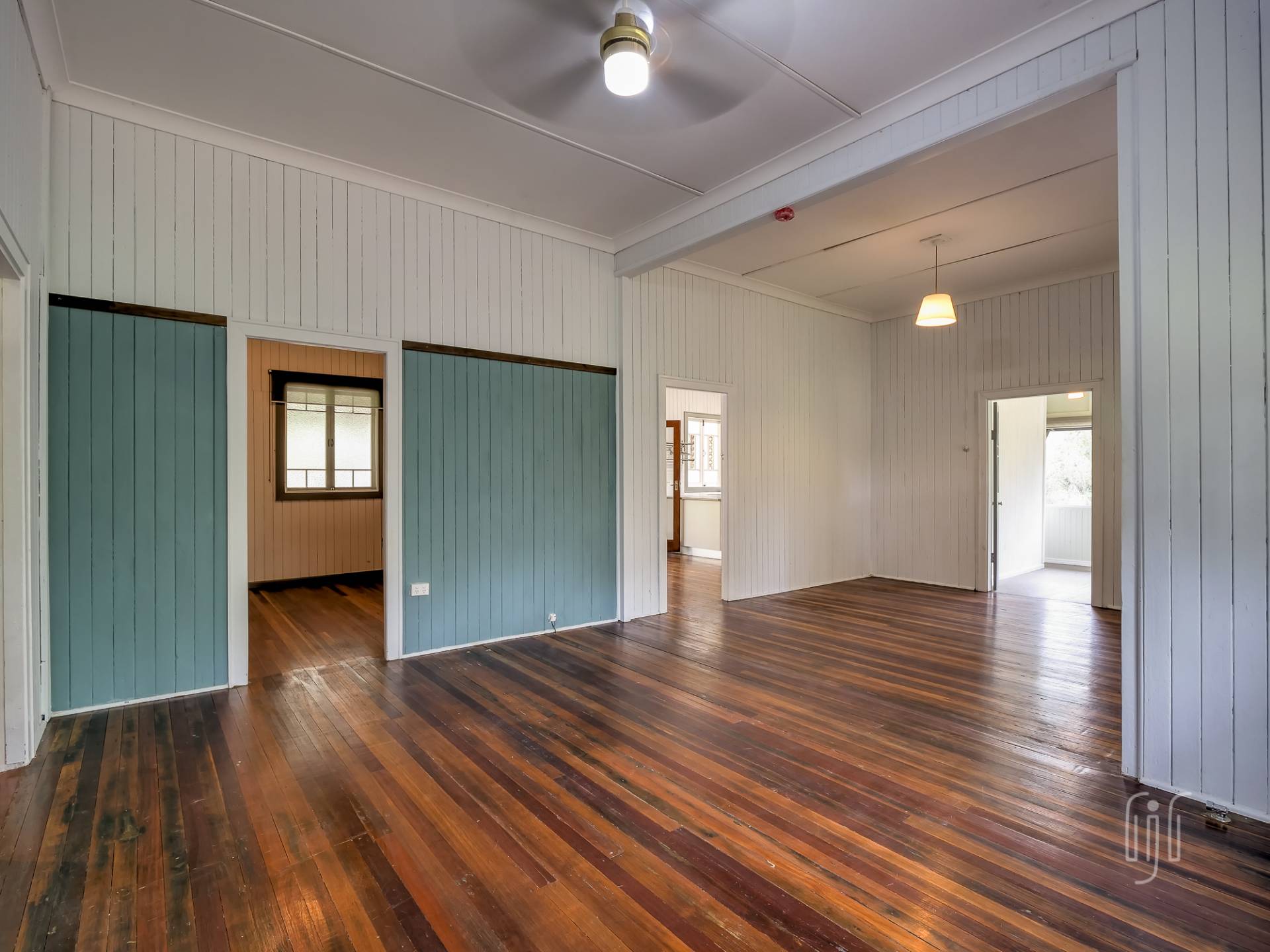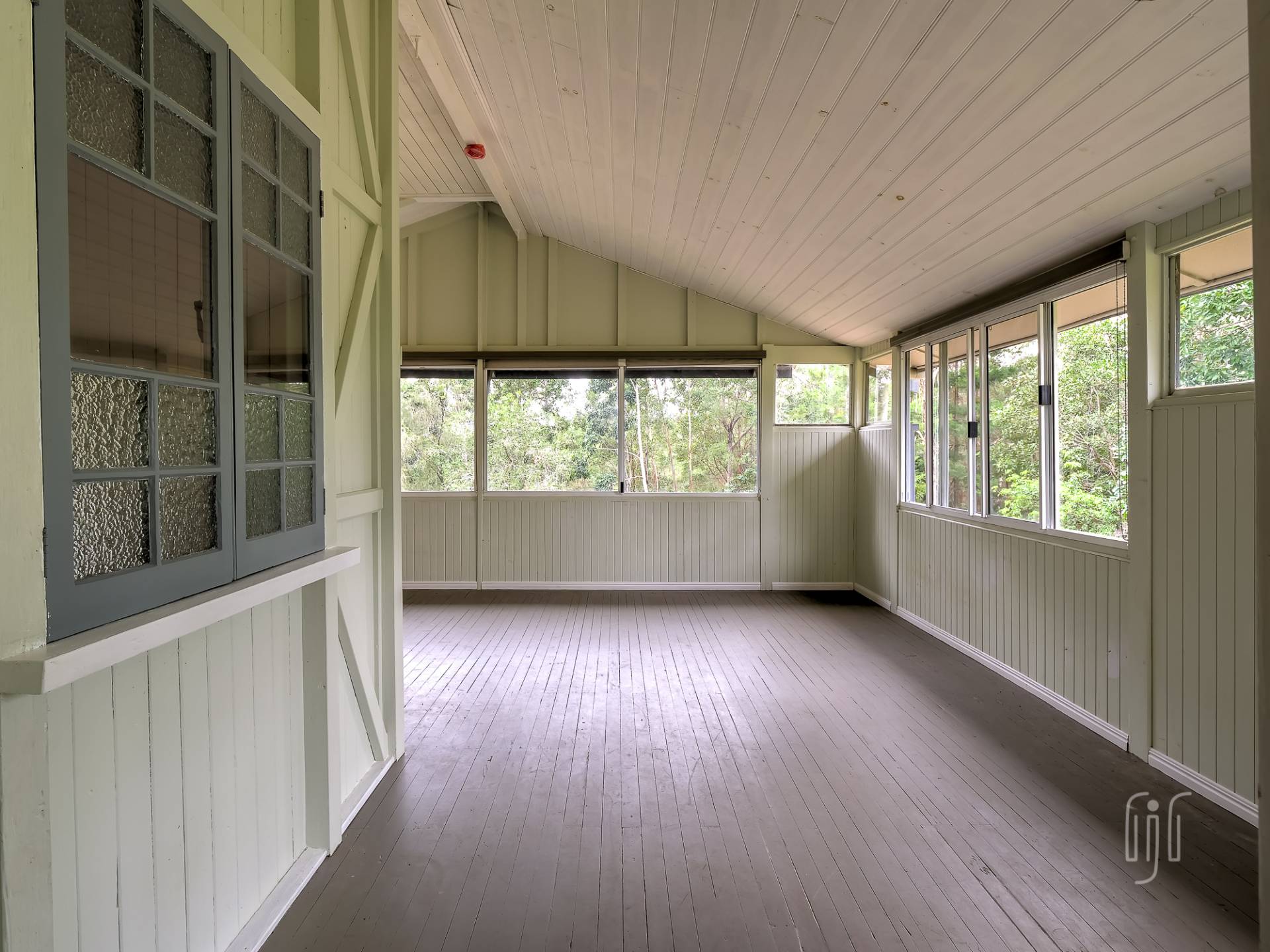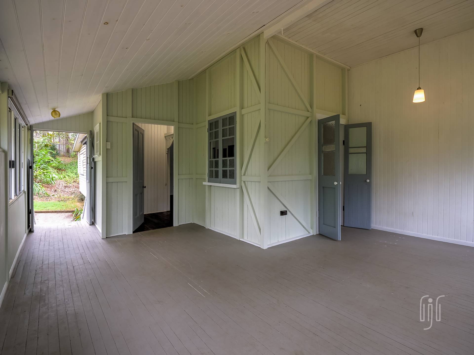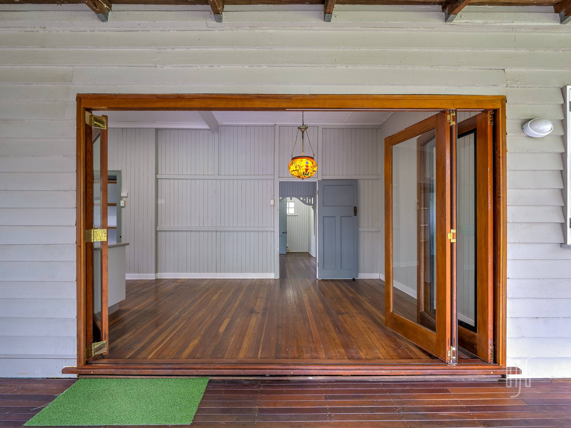 Externally, it’s a weatherboard-clad house, partially screened from the road. Internally, you enter from the front stairs to an enclosed veranda/sleepout, very characteristic of Queenslanders, where verandas were enclosed to provide additional space.